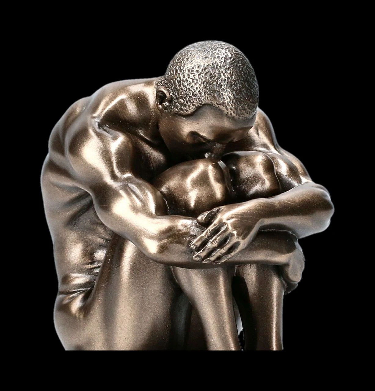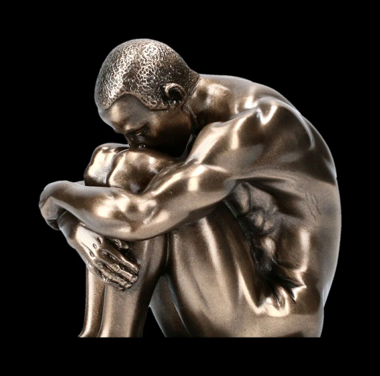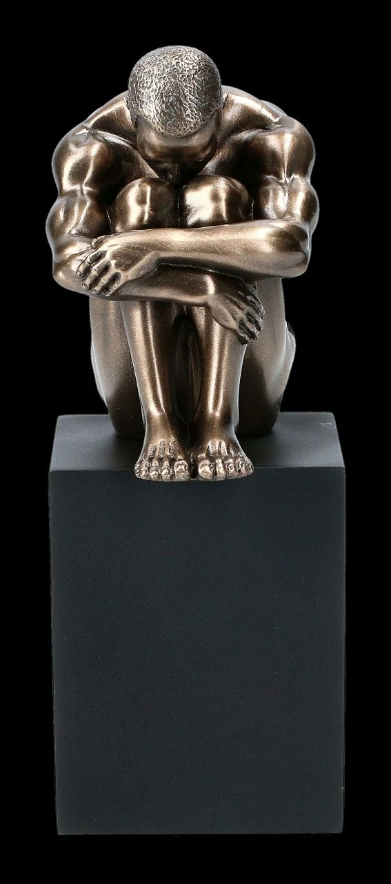 Die kleine, 12 cm hohe, 4,5 cm breite und 4,5 cm tiefe Aktfigur aus der Studio Collection von Veronese zeigt, bis zu den Muskeln, außerordentlich detailreich einen auf einem Monolithen kauernden männlichen Akt. Er wirkt etwas niedergeschlagen, denn seinen Kopf hat er auf seine Knie gebeugt, doch die lockere Armhaltung zeigt eher, dass er sich seiner Schönheit durchaus bewusst ist. Ob auf dem Schreibtisch, dem Sideboard oder im Regal – die herrliche Skulptur aus edel bronziertem Kunststein (Polyresin) ist eine stilvolle Dekoration und ein Blickfang.
