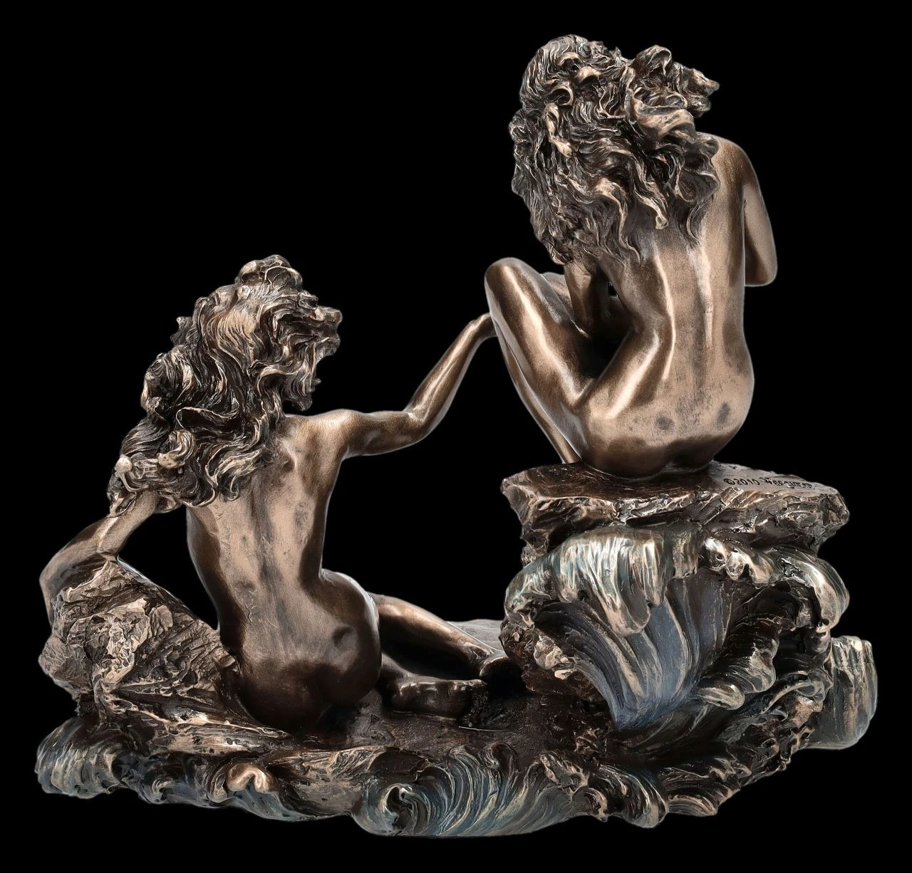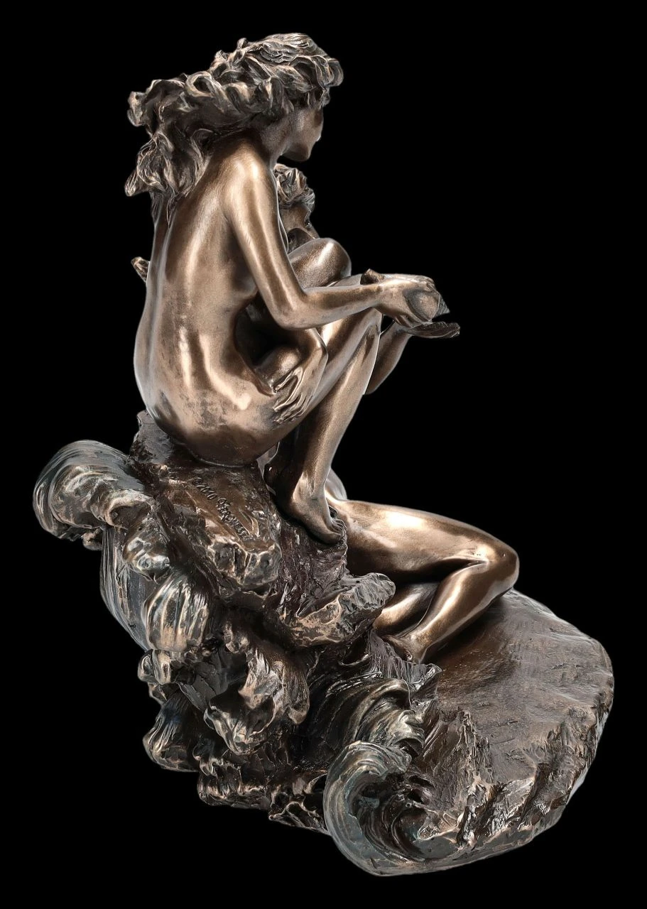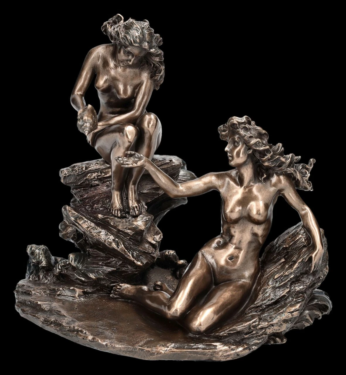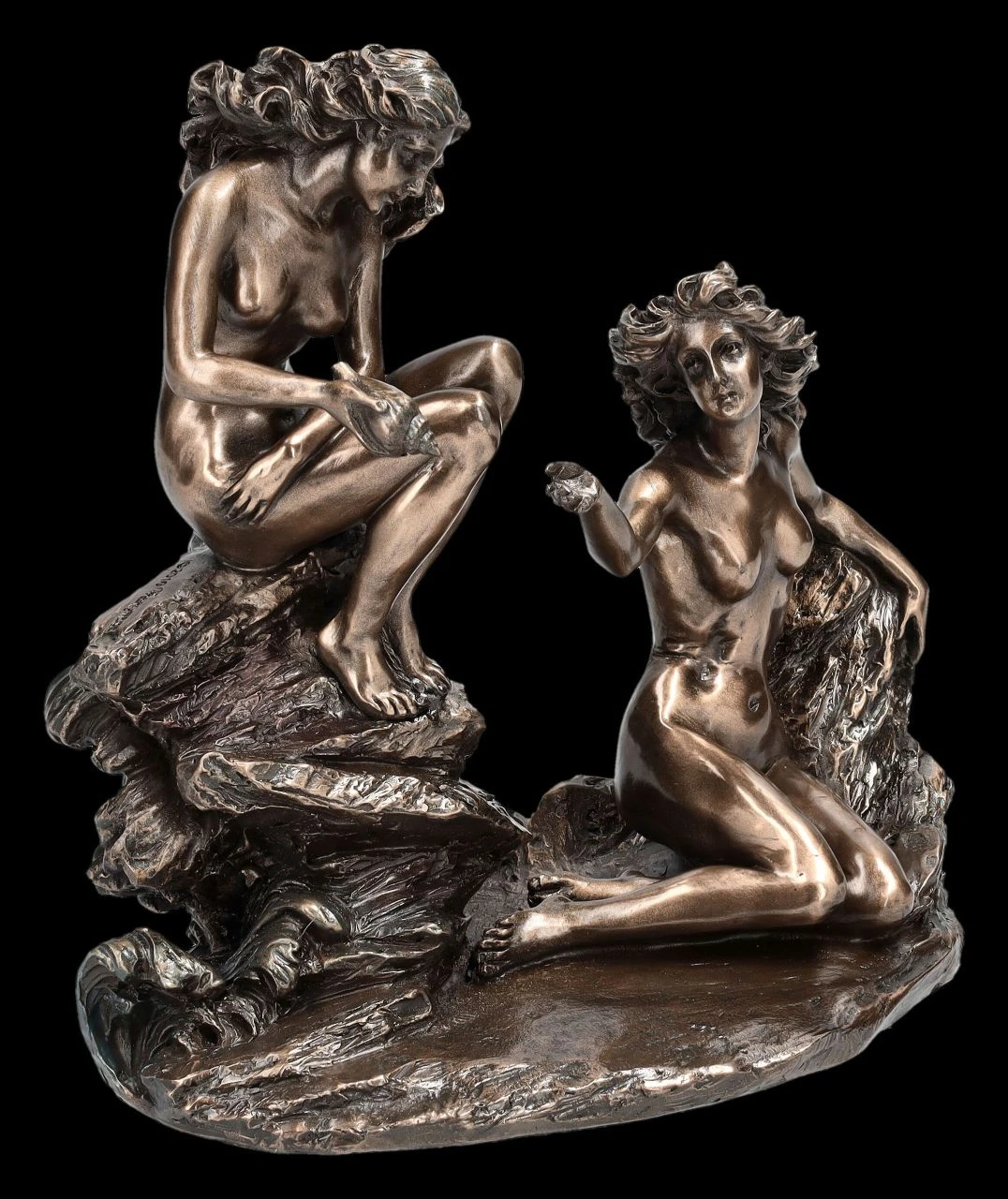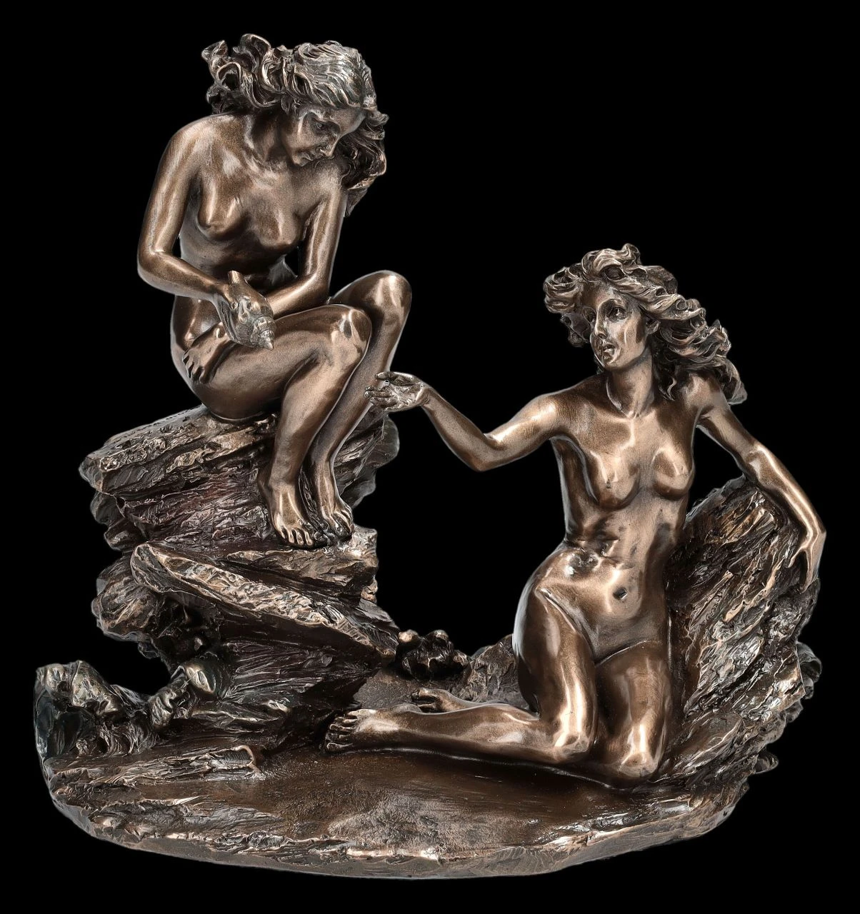 Najaden oder auch Wassernymphen bevölkern geheimnisvoll unsere Quellen, Bäche, Flüsse, Seen und Meere und beschützen die Natur. In stürmischen Vollmondnächten, wenn kaum Schiffe auf dem Wasser sind, können manche ausgewählte Menschen die überaus schönen Nymphen vielleicht dabei beobachten, wie sie aus den Gewässern auftauchen. Wie diese beiden wunderschönen Nymphen, die nackt auf einem Felsen sitzen und mit einer Muschel spielen. Die fantastische Skulptur mit den Sturm-Nymphen auf dem Felsen stammt aus der Studio Collection von Veronese. Aus edel bronziertem und fein coloriertem Kunststein (Polyresin) gefertigt, ist diese wunderbare 16 cm hohe, 17 cm breite und 12 cm tiefe Akt-Figur ein effektvoller und stilvoller Blickfang in jedem Ambiente und ein wunderbares Geschenk