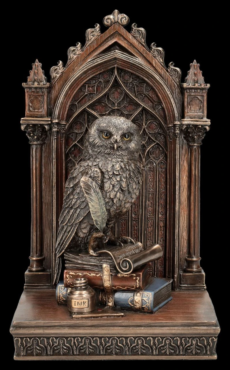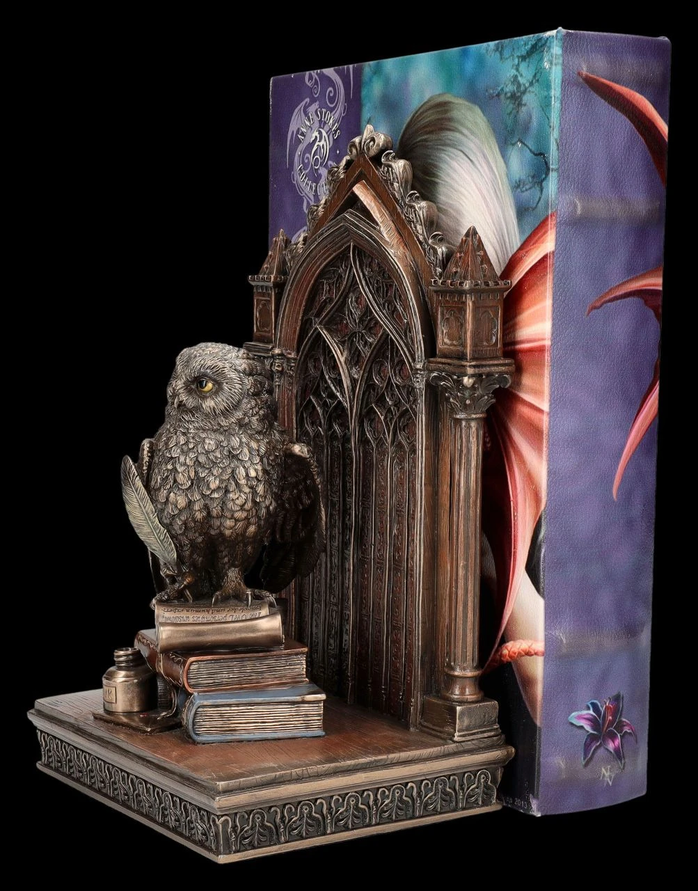 Eulen gelten bereits seit dem Altertum als Symbol der Weisheit. Schon die Göttin Athene hat sie zum Beispiel als Begleiter und Berater gewählt und vermutlich weiß auch jeder, wer Hedwig ist…. Bei dieser wunderbaren Buchstütze sitzt eine weise Eule auf zwei Büchern die vor einem großen Fenster auf der Fensterbank liegen. Sie schreibt mit Feder und Tinte ihre Ratschläge auf einen Papierbogen und auch unter ihr liegen bereits einige der von ihr beschriebenen Seiten. Diese zauberhafte, edel bronzierte und fein colorierte Buchstütze aus hochwertigem Kunststein (Polyresin) ist bestens geeignet, alle Lieblingsbücher perfekt zu halten. Sie stammt aus der Studio Collection von Veronese und ist 25 cm hoch, 13,5 cm breit und 8,5 cm tief. Diese Buchstütze ist nicht nur eine perfekte Deko für einen Buchladen, sondern auch das richtige Geschenk für alle Leser. Das Buch aus der Dekoration ist nicht in der Lieferung enthalten.