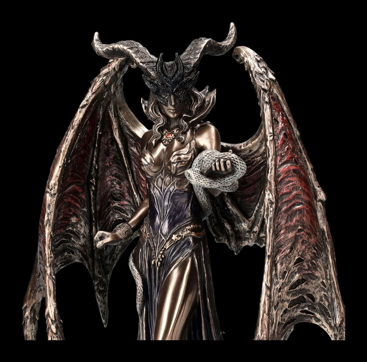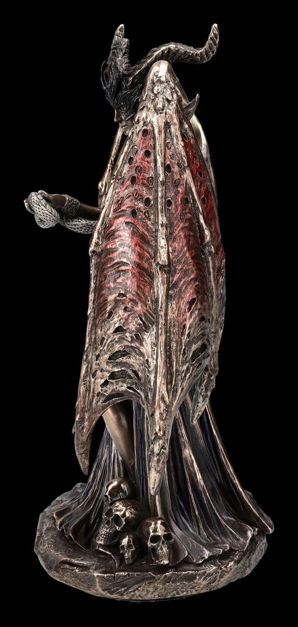 Lilith ist aus vielen unterschiedlichen Geschichten und Mythen als eigenwilliger und verführerischer weiblicher Dämon bekannt. In der Bibel wird sie – allerdings nur an einer Stelle – als erste Frau Adams erwähnt, die sich seiner selbstherrlichen Art jedoch nicht unterordnen wollte. Lilith behauptete Adam gleichgestellt zu sein, da sie aus der gleichen Erde geschaffen wurde und nicht aus der Rippe wie Eva. ‚Wer ist Lilith‘? wird auch Mephisto von Dr. Faust gefragt und Goethe lässt ihn antworten: ‚Adams erste Frau‘. Aber bereits 2000 v.Chr. sind mittlerweile Darstellungen der geflügelten Lilith als sumerische Göttin, die im Stamm des Weltenbaumes lebte, bekannt. Einheitlich ist allen Erzählungen, dass Lilith die allererste Frau der Welt war. Die Schlange, die diese wunderbare Dämonen-Figur aus der Studio Collection von Veronese auf ine Abbildung der Lilith trägt, gibt es bereits bei der Abbildung der sumerischen Göttin. Sie ist jedoch als Schlange der Verführung auch aus der Bibel bekannt. In allen mythischen Erzählungen ist Lilith die geheimnisvolle Verführerin, aber auch ein unheildrohender geflügelter Dämon. Aber ist sie das wirklich – oder ist sie vielmehr eine selbstbewusste Frau? Die edel bronzierte und sehr zurückhaltend colorierte Dämonen-Figur ist mit der Höhe von 22,5 cm, der Breite von 19 cm und der Tiefe von 10 cm eine außerordentlich dekorative Darstellung von Lilith und ein wunderbarer Blickfang, der viele Interpretationen zulässt. Die verführerische Dämonen-Figur ist natürlich auch ein fantastisches Geschenk.
