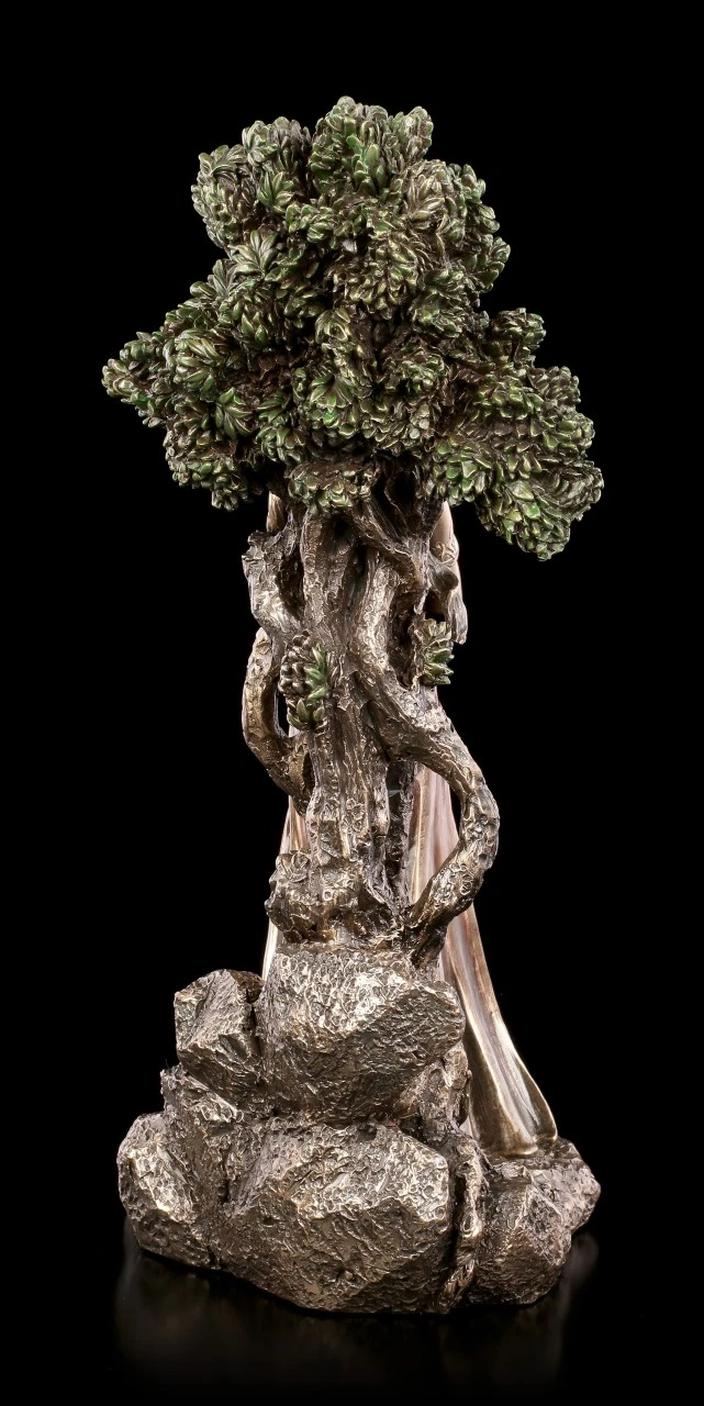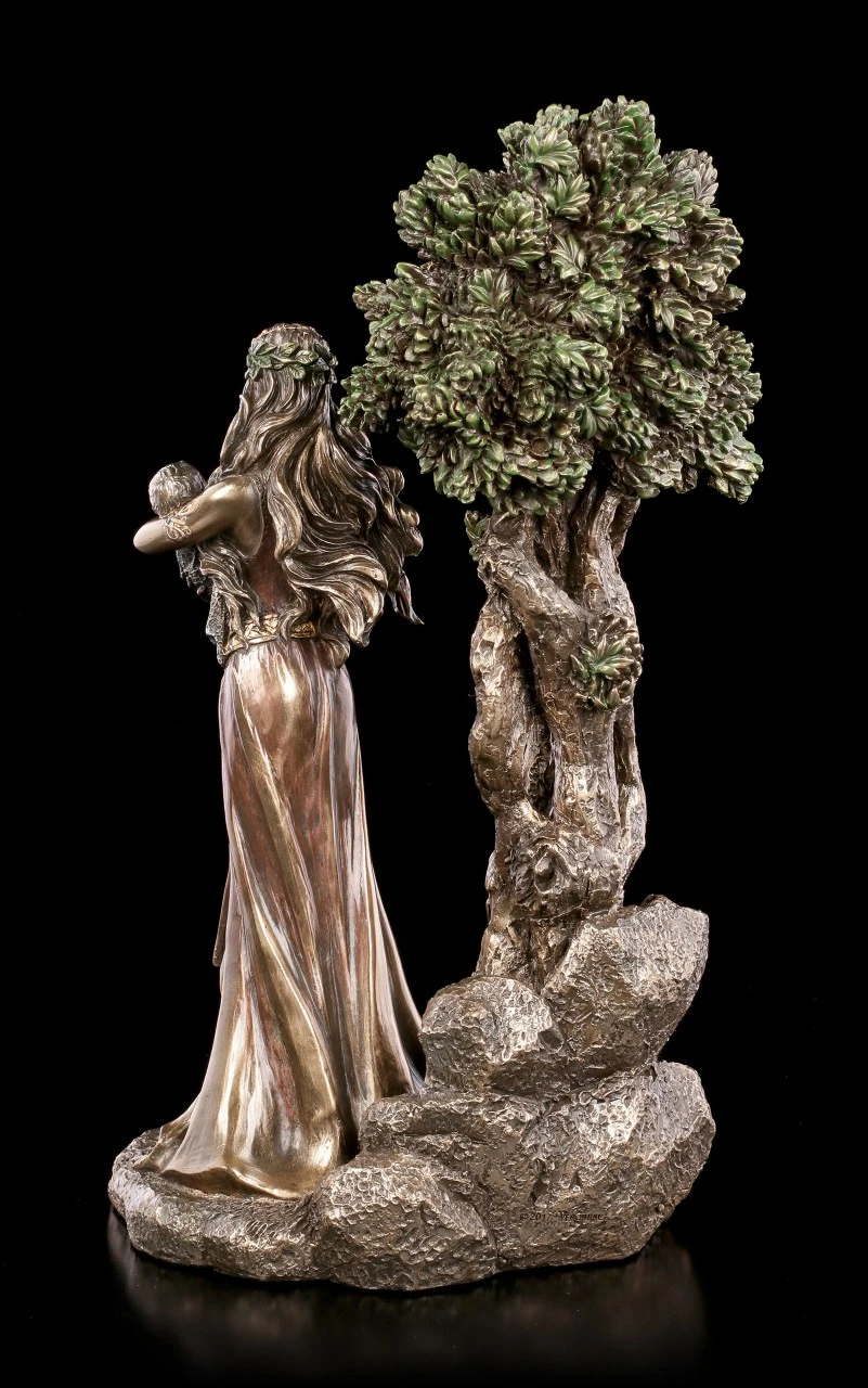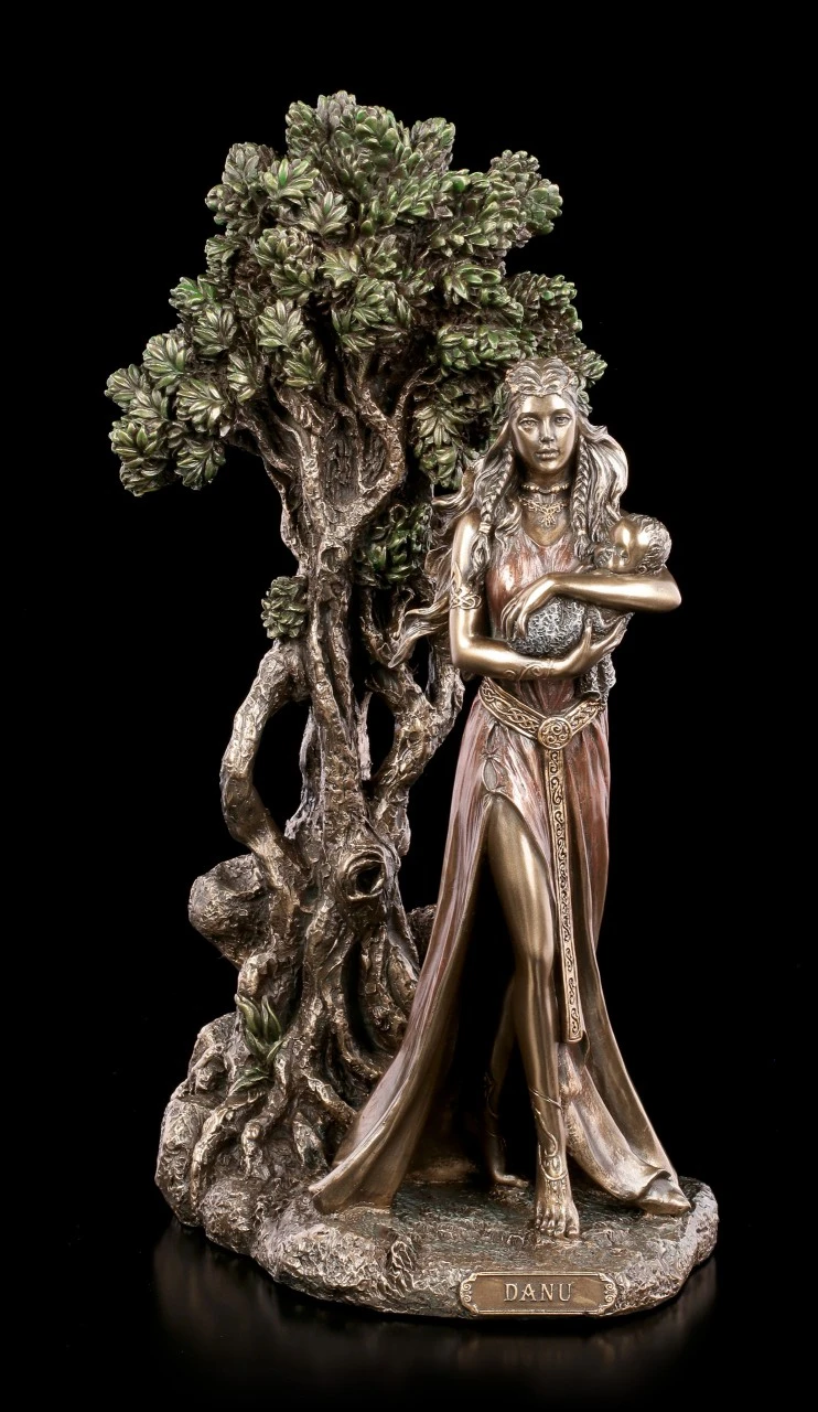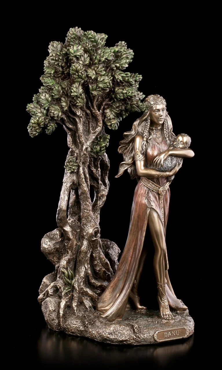 Danu ist eine der bekanntesten keltischen Göttinen. Sie gilt als die große Mutter von der alle Lebewesen und Götter abstammen . Sie ist auch die Schutzheilige der Zauberer, der Flüsse, des Wassers und der Weisheit. Sie ist die Erde, die alles gibt und wieder aufnimmt und symbolisiert die weibliche Seite der keltischen Mythologie. Die Figur besticht durch die hochwertige und detaillierte Machart und wird durch die schimmernde Bronzierung zu einem stilvollen Blickfang in einer Wohnung.