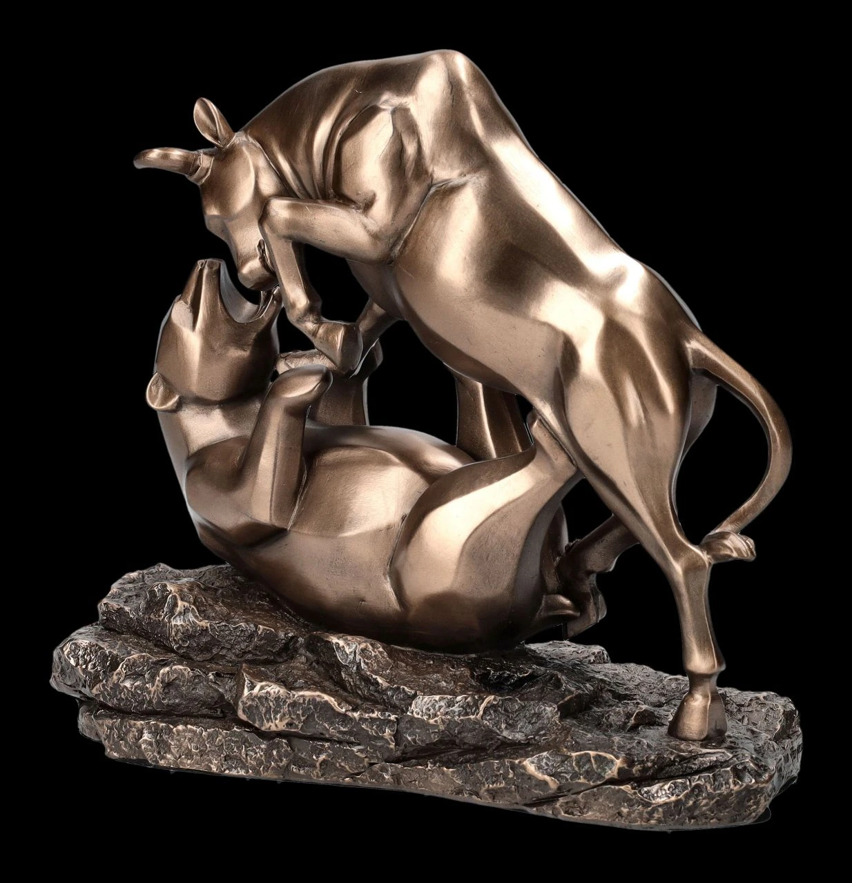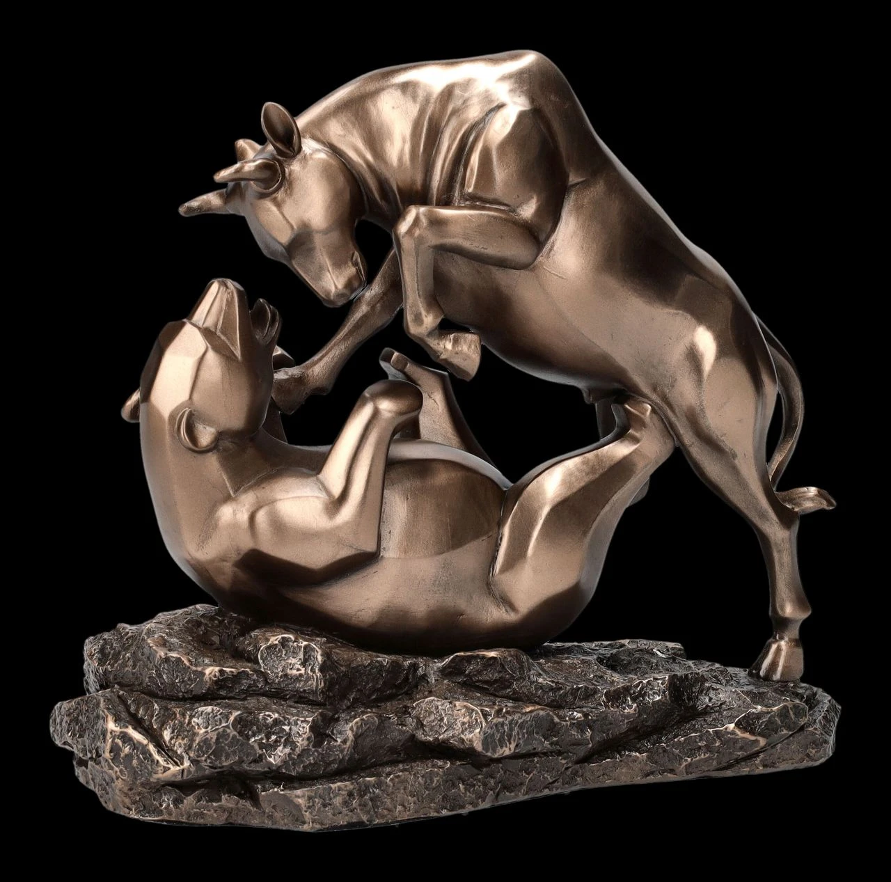 Bei dieser fantastischen, 16,5 cm hohen, 18 cm breiten und 9 cm tiefen Dekofigur aus der Studio Collection von Veronese versucht der stolze Bulle den Bären niederzuringen. In der Börsenwelt steht der Bulle für den Aufwärtstrend und der Bär für den längerfristigen Abwärtstrend. Die beiden demonstrieren also den positiven und negativen Trend in der Wirtschaft bzw. die Kursentwicklung an der Börse. So stehen Bulle und Bär nicht nur in New York, sondern auch vor der Frankfurter Börse kämpferisch voreinander, während sich bei der edel bronzierten Dekofigur aus Kunststein (Polyresin) der Bulle bereits auf den Bären stürzt. Die Dekofigur ‚Börsenkrieg‘ passt hervorragend in jedes Finanzbüro und wird dort sicher alle Blicke auf sich ziehen. Sie ist aber auch ein passendes Geschenk für Ihren persönlichen Finanzstrategen.