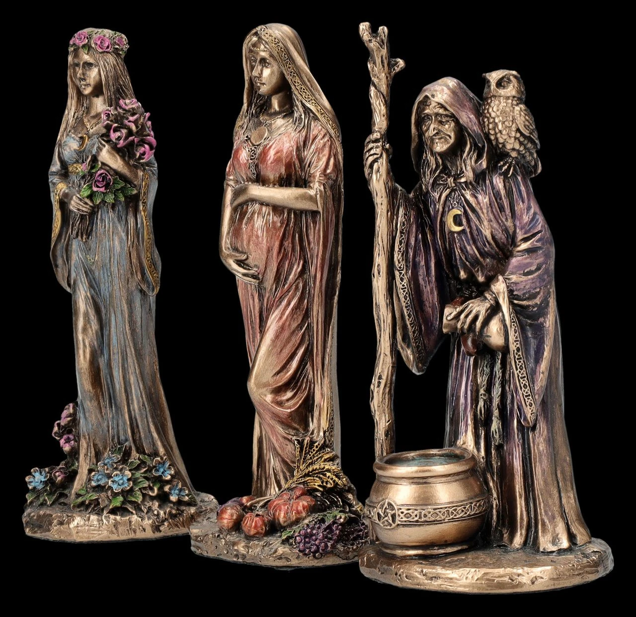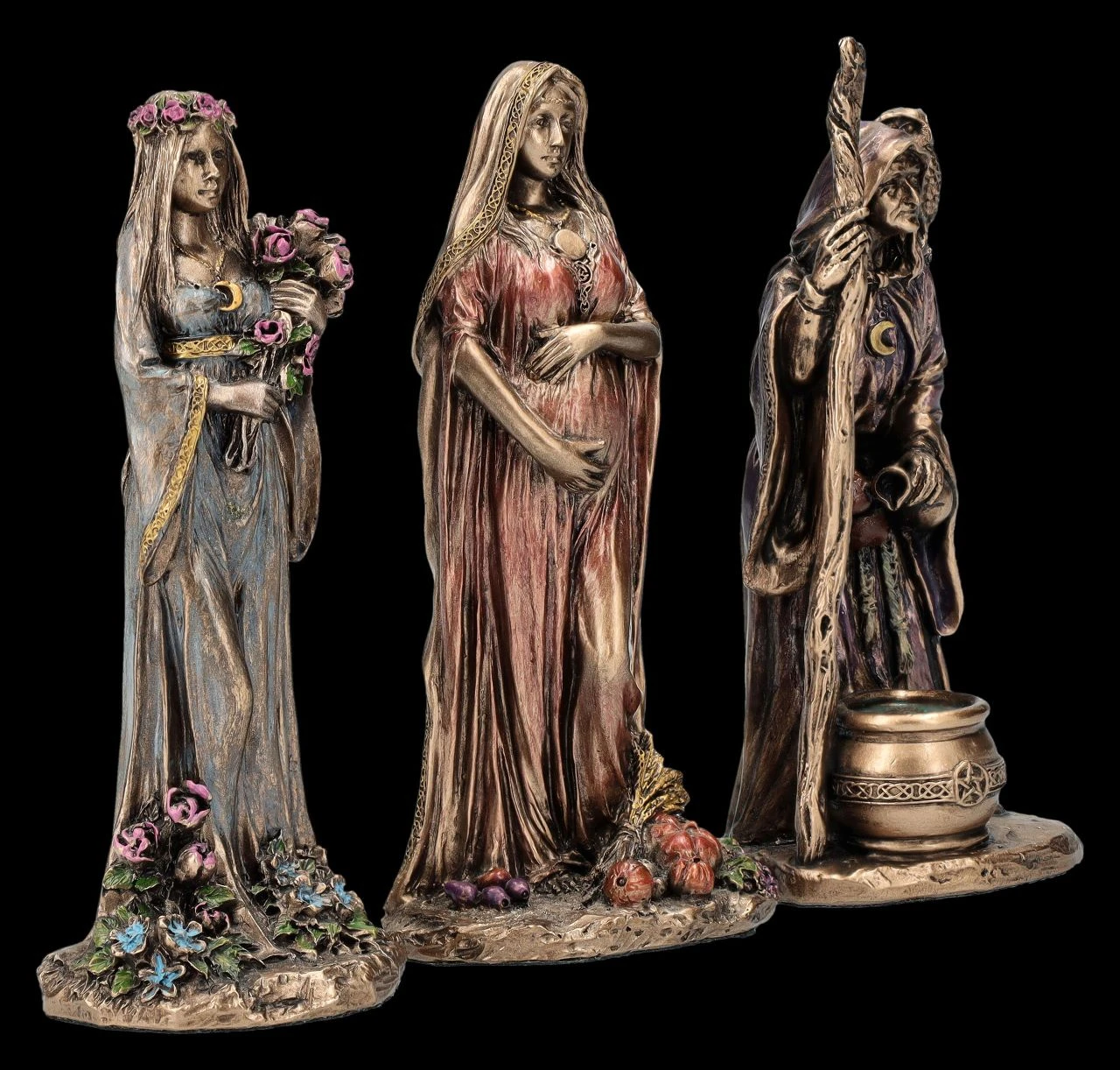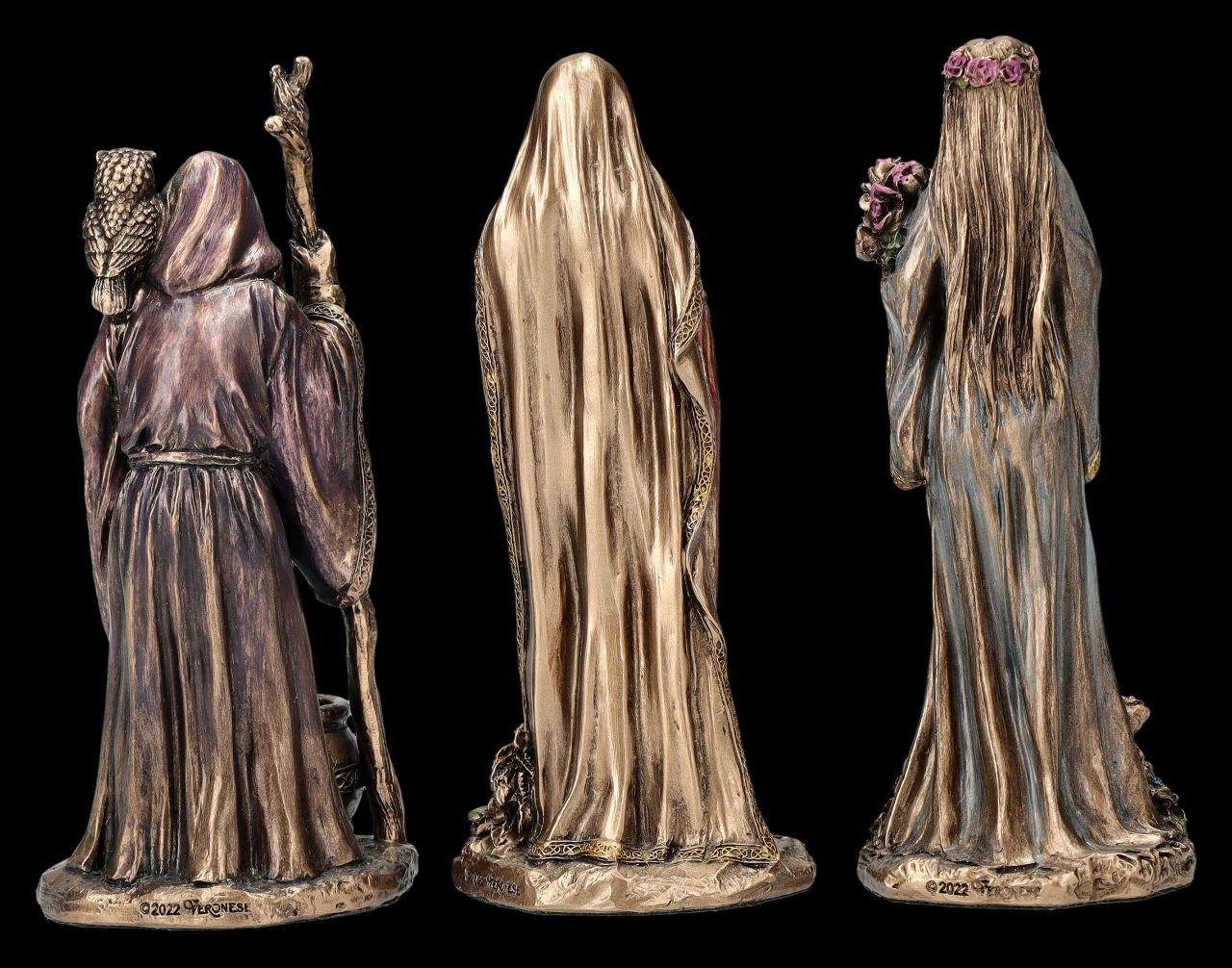Dieses wunderbare mystische Figuren Set aus der Studio Collection von Veronese mit der Dreifaltigen Göttin als Jungfrau Mutter und Altes Weib besticht nicht nur durch die Darstellung, sondern auch durch die fein abgestimmten Farben der edel bronzierten und colorierten Figuren. Die Göttin als junge Frau in dem blau-goldenen Kleid ist mit zahlreichen Blumen umgeben und trägt als Schmuck den aufgehenden Mond als Schmuck um ihren Hals. Die Mutter in den sommerlich warmen Farbtönen hält zärtlich ihren schwangeren Bauch umfasst und zu ihren Füßen liegen die Erntefrüchte des Sommers. Als Schmuck trägt sie den Vollmond. Und das Alte Weib als weise Frau oder weise Hexe mit einem Hexenkessel vor ihren Füßen ist in den Farben des Winters gekleidet und wird von einer Eule begleitet, die auf ihrer Schulter sitzt. Sie stützt sich auf ihren Zauberstock und trägt als Schmuck die abnehmende Mondsichel. Der Schmuck bei den drei je 10,5 cm hohen, 4 – 5 cm breiten und 4 – 4,5 cm tiefen Figuren zeigt, dass die Mondphasen bei der Dreifaltigen Göttin eine große Bedeutung haben. Diese wunderbare Darstellung des weiblichen Reifeprozesses aus hochwertigem Kunststein (Polyresin) ist für alle, die sich dem Urweiblichen der Dreifaltigen Göttin verbunden fühlen, ein perfektes Geschenk.