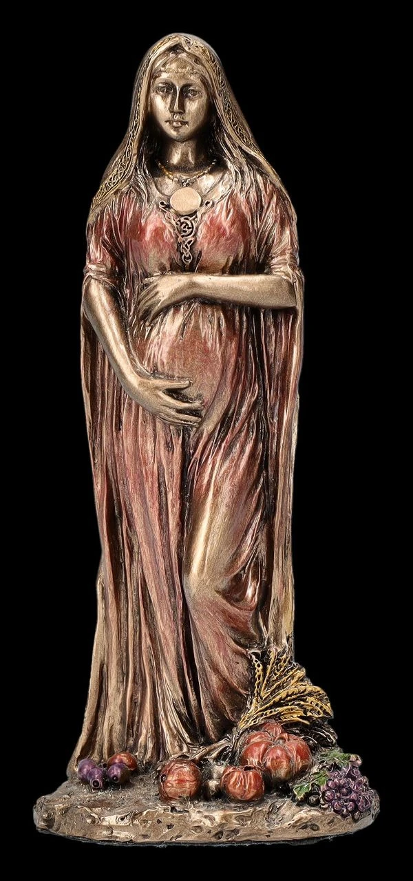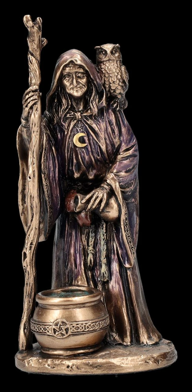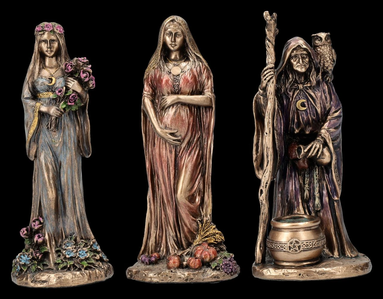 Dieses wunderbare mystische Figuren Set aus der Studio Collection von Veronese mit der Dreifaltigen Göttin als Jungfrau Mutter und Altes Weib besticht nicht nur durch die Darstellung, sondern auch durch die fein abgestimmten Farben der edel bronzierten und colorierten Figuren. Die Göttin als junge Frau in dem blau-goldenen Kleid ist mit zahlreichen Blumen umgeben und trägt als Schmuck den aufgehenden Mond als Schmuck um ihren Hals. Die Mutter in den sommerlich warmen Farbtönen hält zärtlich ihren schwangeren Bauch umfasst und zu ihren Füßen liegen die Erntefrüchte des Sommers. Als Schmuck trägt sie den Vollmond. Und das Alte Weib als weise Frau oder weise Hexe mit einem Hexenkessel vor ihren Füßen ist in den Farben des Winters gekleidet und wird von einer Eule begleitet, die auf ihrer Schulter sitzt. Sie stützt sich auf ihren Zauberstock und trägt als Schmuck die abnehmende Mondsichel. Der Schmuck bei den drei je 10,5 cm hohen, 4 – 5 cm breiten und 4 – 4,5 cm tiefen Figuren zeigt, dass die Mondphasen bei der Dreifaltigen Göttin eine große Bedeutung haben. Diese wunderbare Darstellung des weiblichen Reifeprozesses aus hochwertigem Kunststein (Polyresin) ist für alle, die sich dem Urweiblichen der Dreifaltigen Göttin verbunden fühlen, ein perfektes Geschenk.