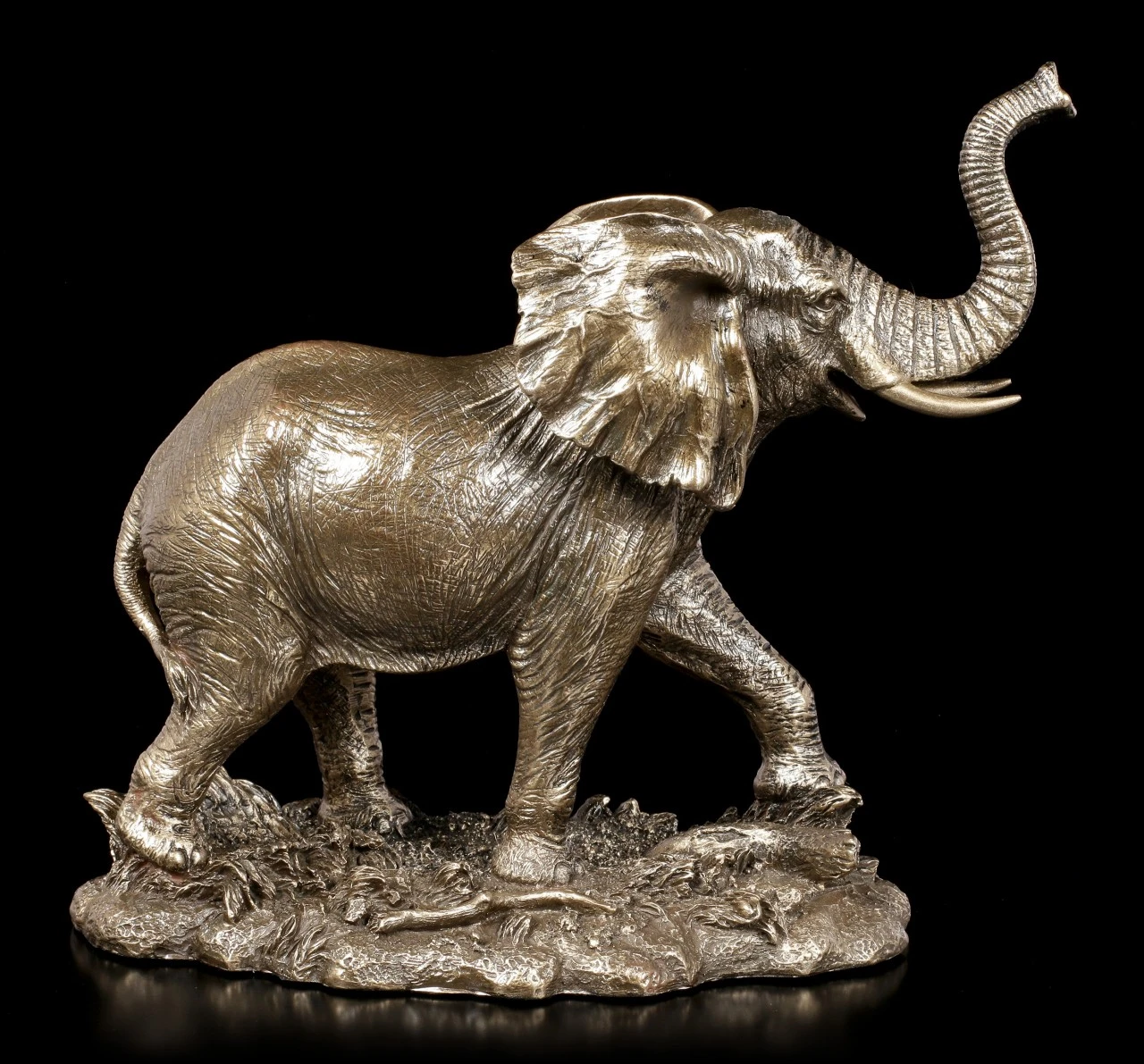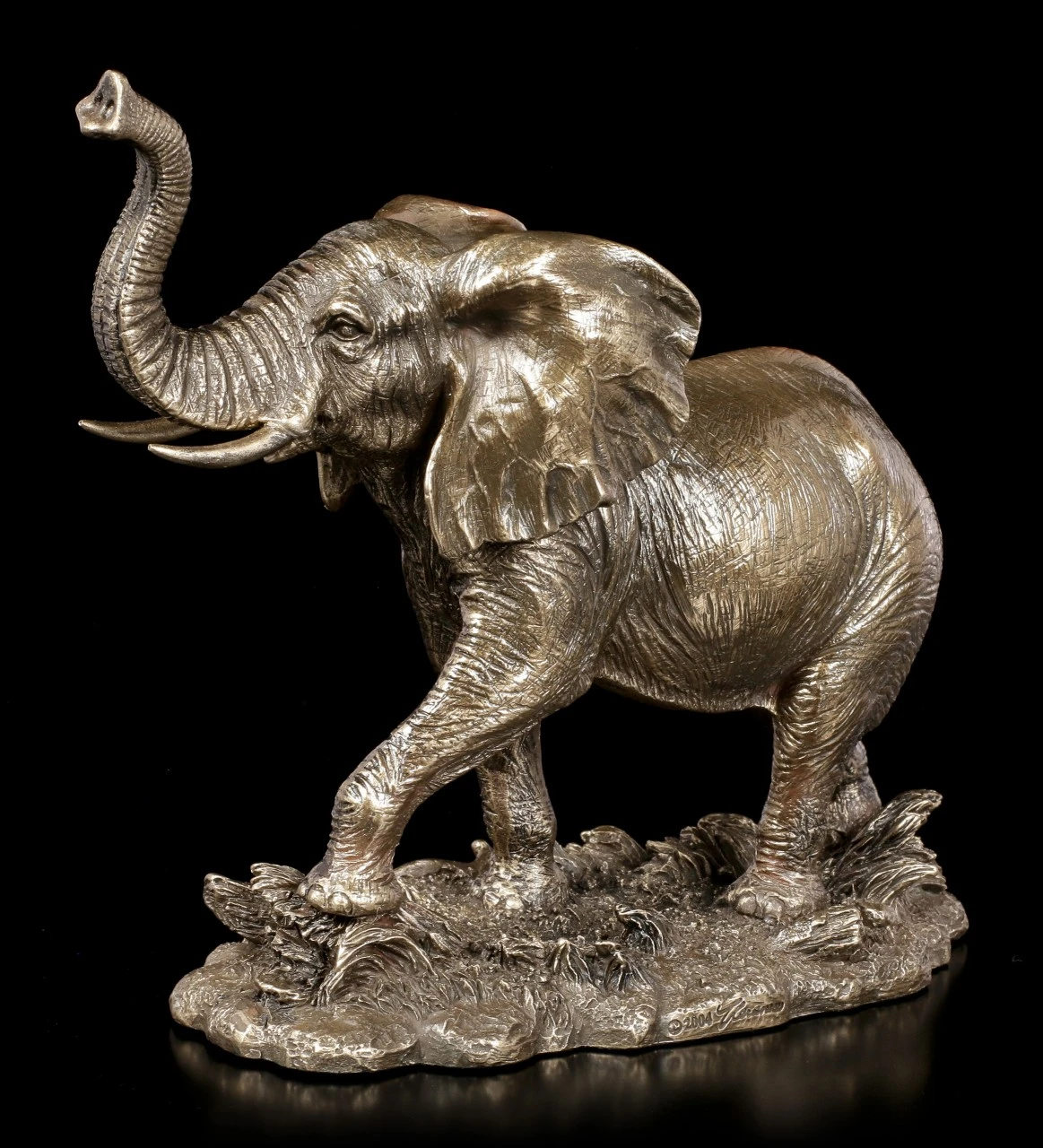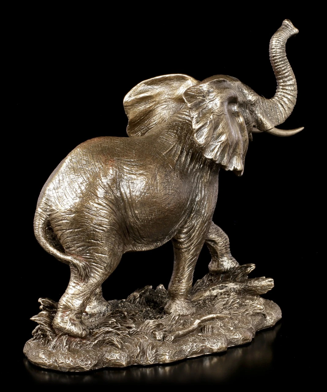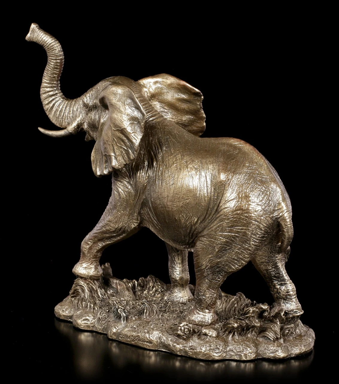 Mit erhobenen Rüssel stürmt der majestätische Elefant über die Steppe. Was er wohl gesehen hat? Seine Familie? Oder einen Fluss? Die bronzierte Elefantenfigur stammt aus der Serie ‚Ode to Wildlife‘ von Veronese und ist eine Hommage an die majestätischen Dickhäuter.