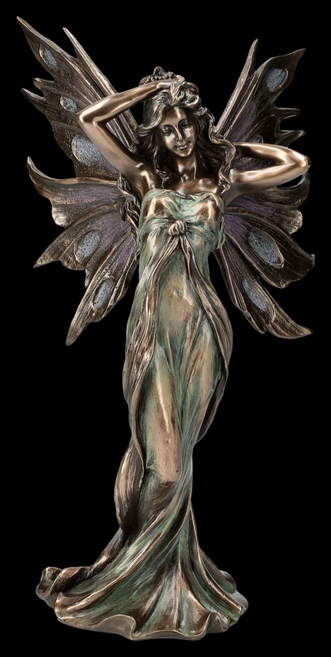 Durch die edle Bronzierung und fein abgestimmte Colorierung in ganz zarten Blautönen, wirkt das Kleid der bezaubernden Elfe wie ein beinahe durchsichtiges Negligé. Es sieht aus, als wäre sie gerade aus schönen Träumen erwacht und würde sich nun wohlig räkelnd mit ihren Händen durch das lange lockige Haar streichen. Mit ihren feinen Gesichtszügen, den schönen großen Flügeln und dem fließenden Kleid wirkt diese zauberhafte Elfenskulptur beinahe wie eine Arbeit aus der Jugendstilzeit. Die 25 cm hohe, 15 cm breite und 12 cm tiefe entzückende Elfen Figur aus der Studio Collection von Veronese ist aus hochwertigem Kunststein (Polyresin) und wird in jedem Ambiente zum sofortigen Blickfang. Sie ist für jeden Sammler und für alle, die die fantasievolle Welt der Elfen lieben, ein wunderschönes Geschenk.