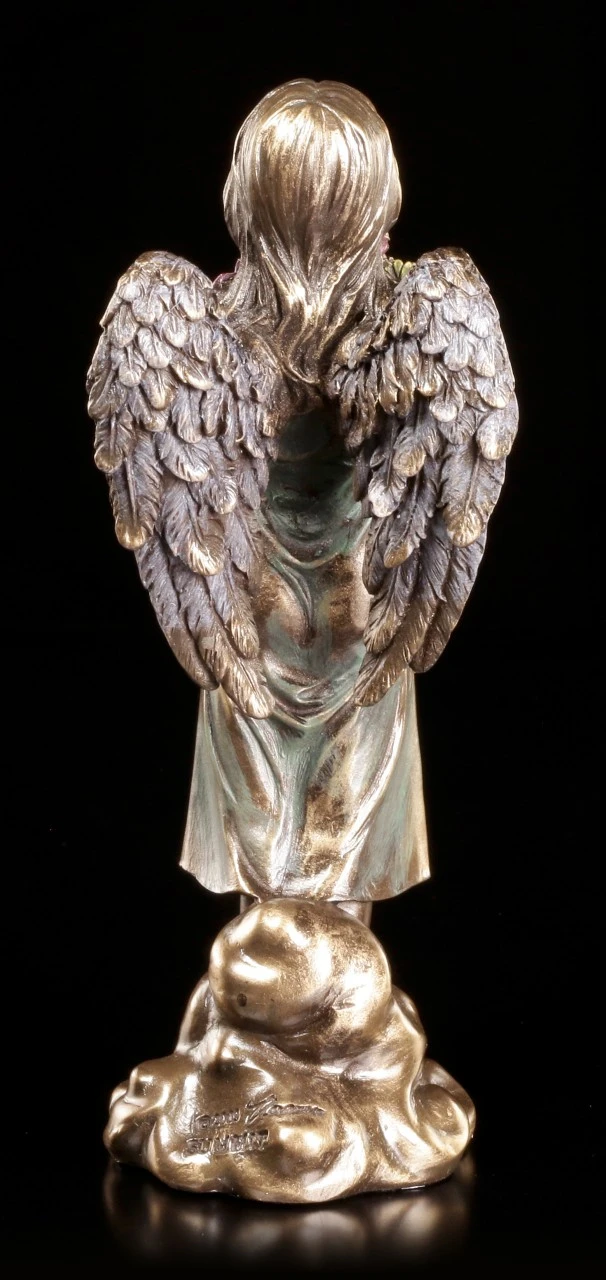 Der sanft lächelnde Engel trägt einen Blumenkorb in ihren Händen. Sie bringt Segen und Glück. Durch die Bronzierung und Kolorierung wird der Engel zu einem schönen Blickpunkt auf einem Tisch oder Regal. Der schöne Engel ist auch ein herrliches Geschenk.