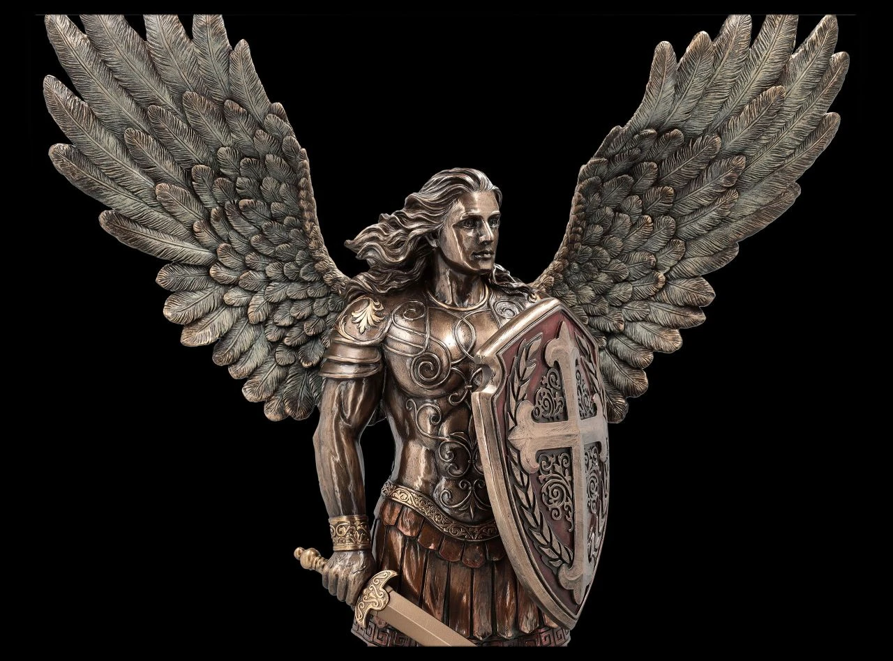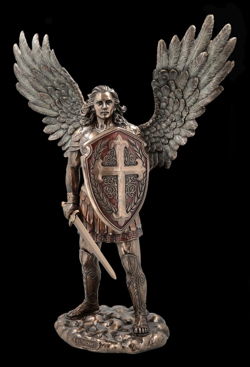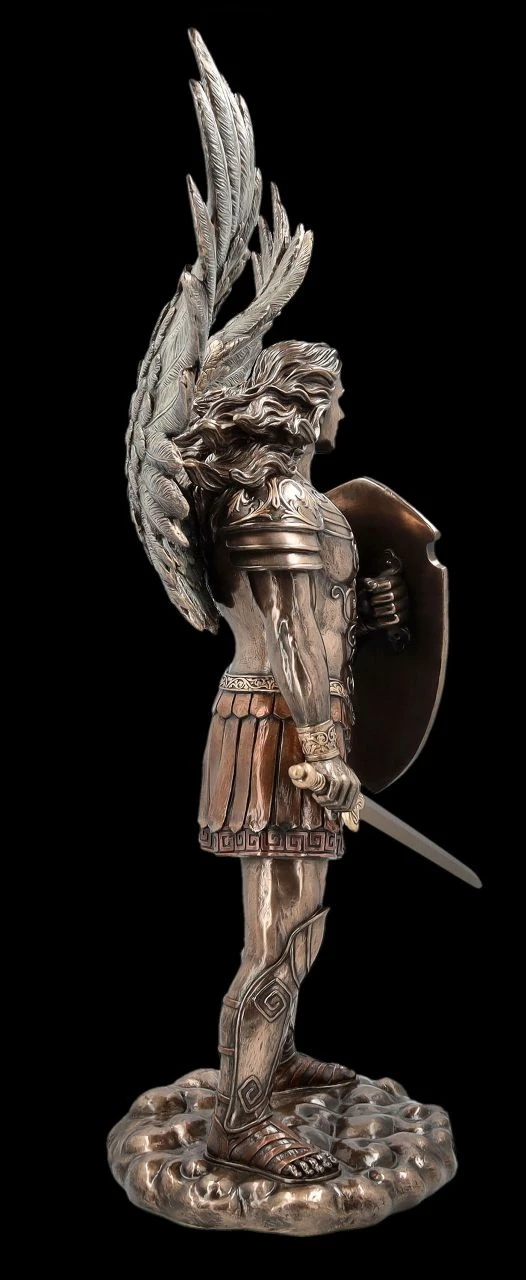 Sehr beeindruckend ist diese wunderbare Skulptur des Erzengel Michael mit Schwert und Schild in epischer Pose. Der Erzengel Michael, der zu den wichtigsten Erzengeln gehört, ist der Patron der katholischen Kirche. Er wird u.a. auch als Schutzengel für arme Seelen und für die Sterbenden angerufen und ist der Schutzpatron zahlreicher Berufe. Tapfer stellt sich der Erzengel Michael den bösen Mächten entgegen, damit das Gute siegen kann. Ein Gebet an den Erzengel Michael beginnt z.B.mit ‚Heiliger Erzengel Michael, beschirme uns im Kampfe gegen die Bosheiten und Nachstellungen des Teufels. Sei Du unsere Schutzwehr – Gott gebiete ihm mit Macht, wir biten demütig darum….‘ Der Erzengel Michael wurde von zahlreichen großen Künstlern meist kämpferisch mit Schwert und Schild dargestellt. Dieser schönen Figur des Erzengel Michael traut man den Kampf gegen das Böse auf jeden Fall zu. Die prächtige, 73,5 cm hohe, 60 cm breite und 25 cm tiefe Stuatue des Erzengel Michael stammt aus der Studio Collection von Veronese. Sie ist edel bronziert und sehr fein coloriert und bis zu den riesigen Flügeln wunderbar detailreich aus hochwertigem Kunststein (Polyresin) gefertigt. Die großen Flügel und das Schwert der Erzengel Michael-Figur sind zum Stecken. Damit diese herrliche Skulptur Halt bekommt, steht sie auf einem mit dem Namen ‚St. Michael‘ beschrifteten, wie ein Felsen aussehendem Podest. Diese herrliche Statue ist für alle Gläubigen und auch für alle, die den Namen des Erzengel Michael führen, ein wunderbares Geschenk und sollte so aufgestellt werden, dass sie sofort gesehen und bewundert werden kann.