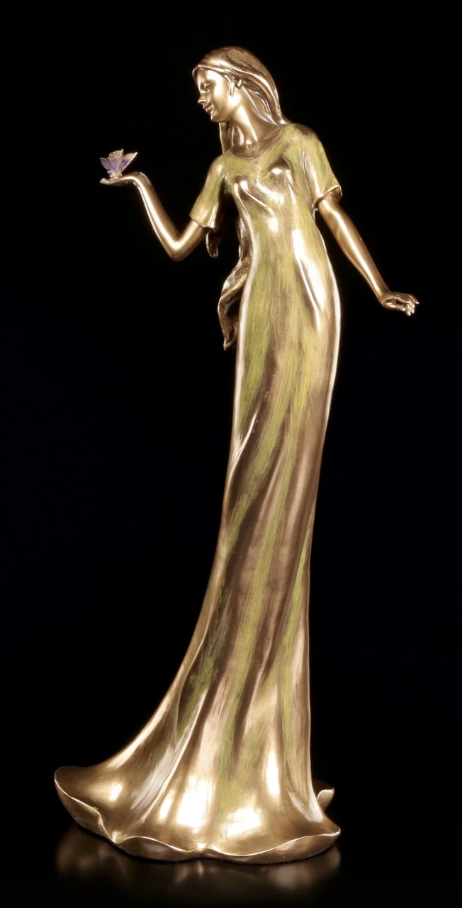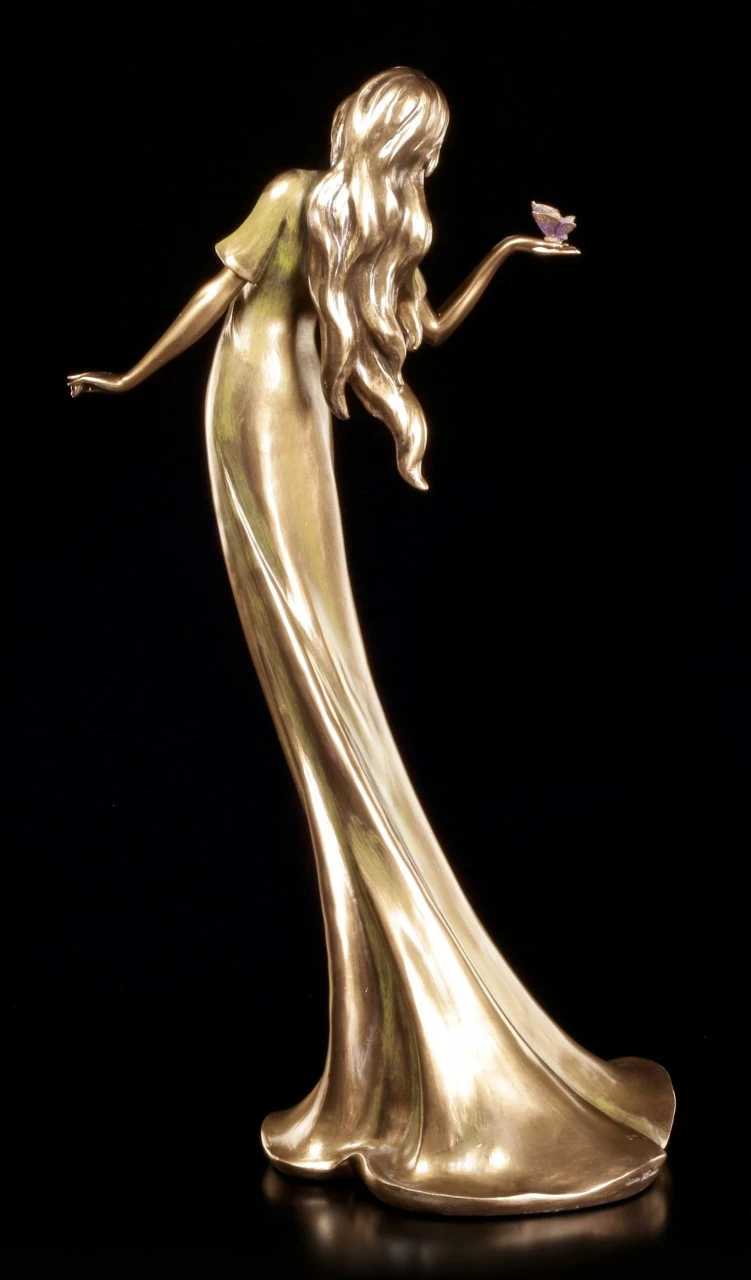 Sieht diese junge Frau nicht höchst elegant aus? So wie sie anmutig zu einem Schmetterling beugt, den sie in der Hand hält. Die Lady mit dem Schmetterling ist ein Kunstwerk vom bekannten Hersteller Veronese. Sie stammt aus der Studio Collection Serie und wurde liebevoll bronziert und coloriert. Durch die überlangen Beine, die schlanke Silhouette und die S-Form des Körpers wirkt die junge Frau lebendig und in Bewegung.