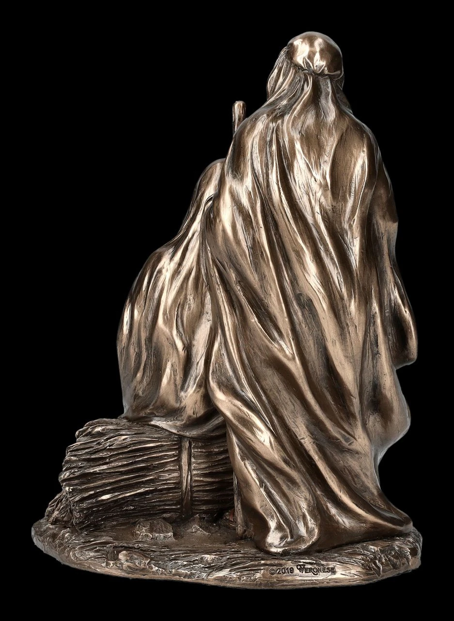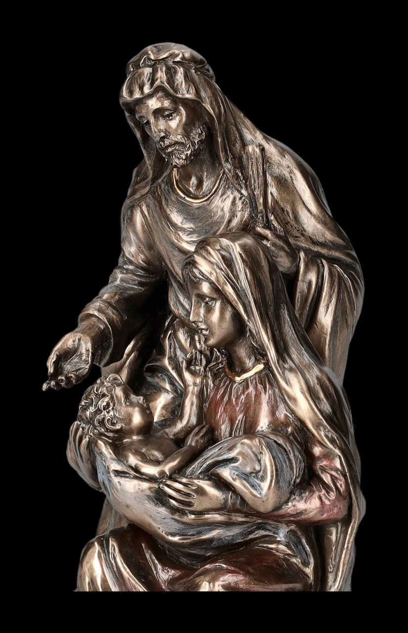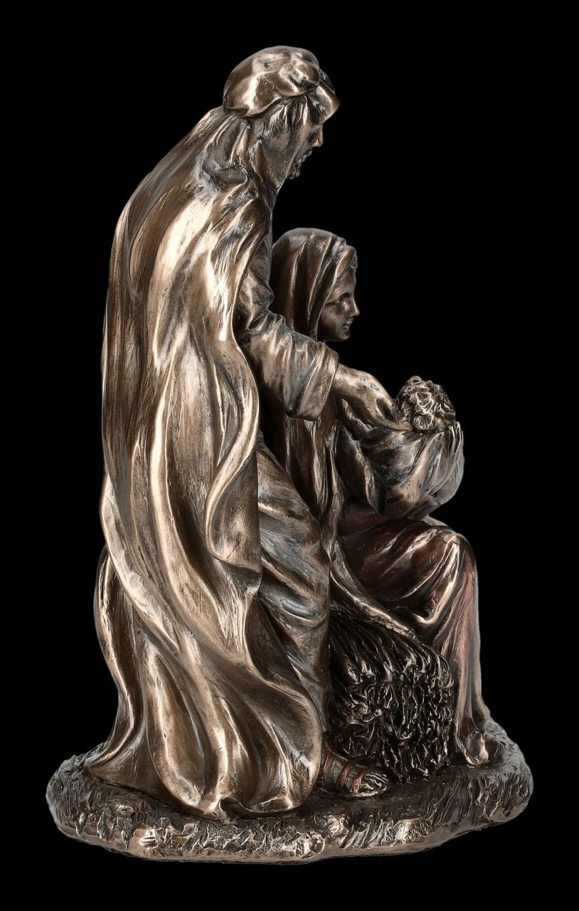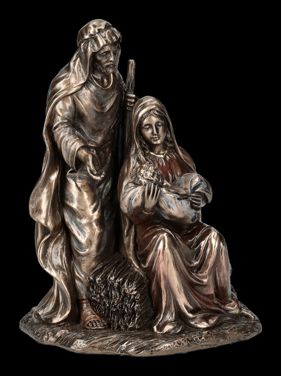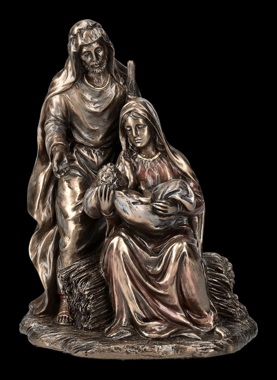 Auf einem Heubündel sitzend, hält Maria das Jesuskind im Arm und schaut es liebevoll und sanft, aber auch etwas besorgt an, während Josef, den Hirtenstab in seiner linken Hand,beschützend hinter ihr steht. Die Geburt von Jesus wurde in Form von Skulpturen und Abbildungen nicht nur in Kirchen dargestellt, auch in allen Krippen und vielen Hergottswinkel findet man Maria und Josef mit dem Christuskind. Die wunderbar dargestellte Figurengruppe aus der Studio Collection von Veronese mit der Höhe von 18 cm, der Breite von 13,5 cm und der Tiefe von 11 cm wurde aus edel bronziertem und zurückhaltend coloriertem Kunststein (Polyresin) sorgfältig gefertigt. Nicht nur in der Krippe zu Weihnachten und auch nicht nur für Ihren persönlichen Bereich ist diese schöne Darstellung der Geburt Jesus eine ganz besondere Bereicherung. .