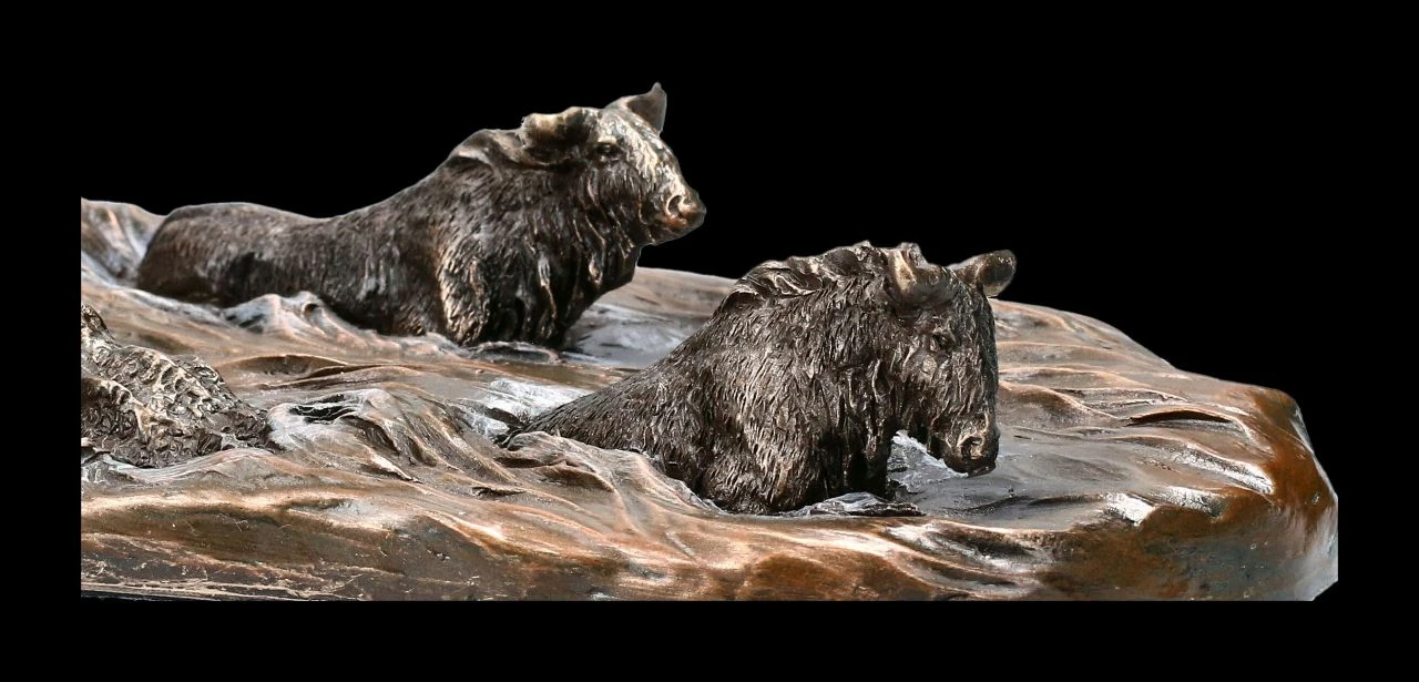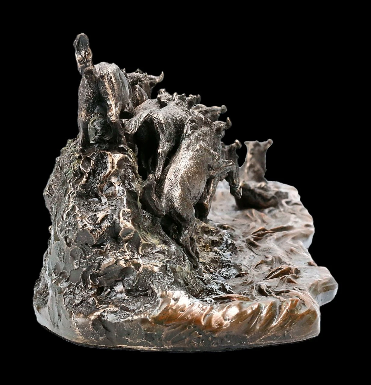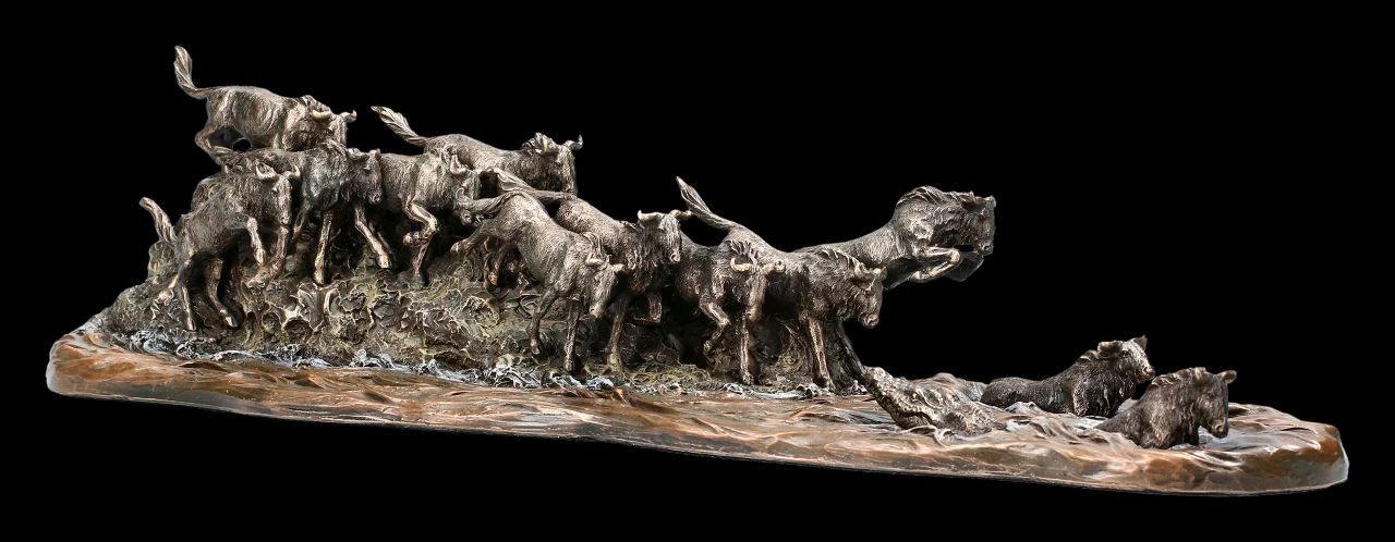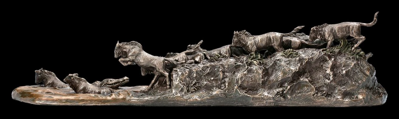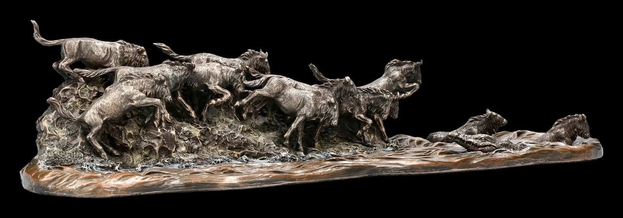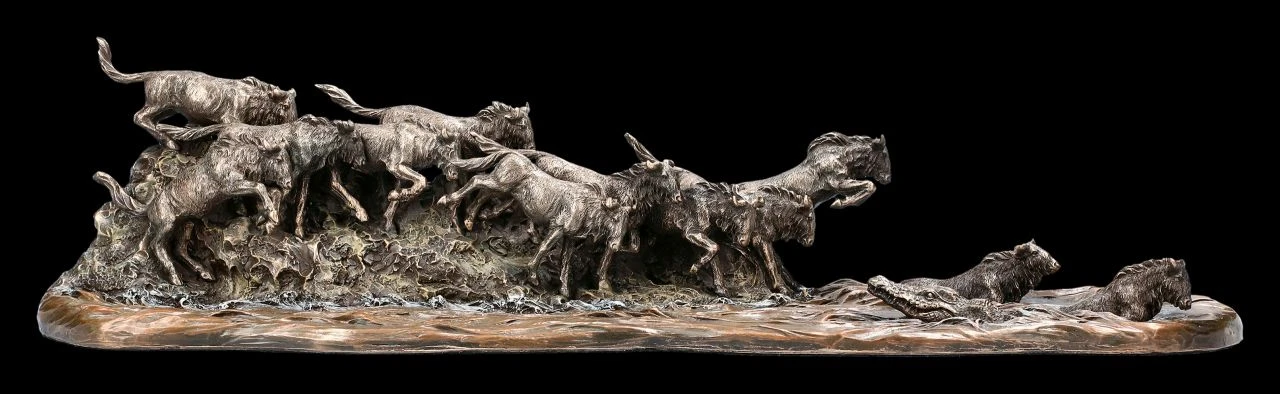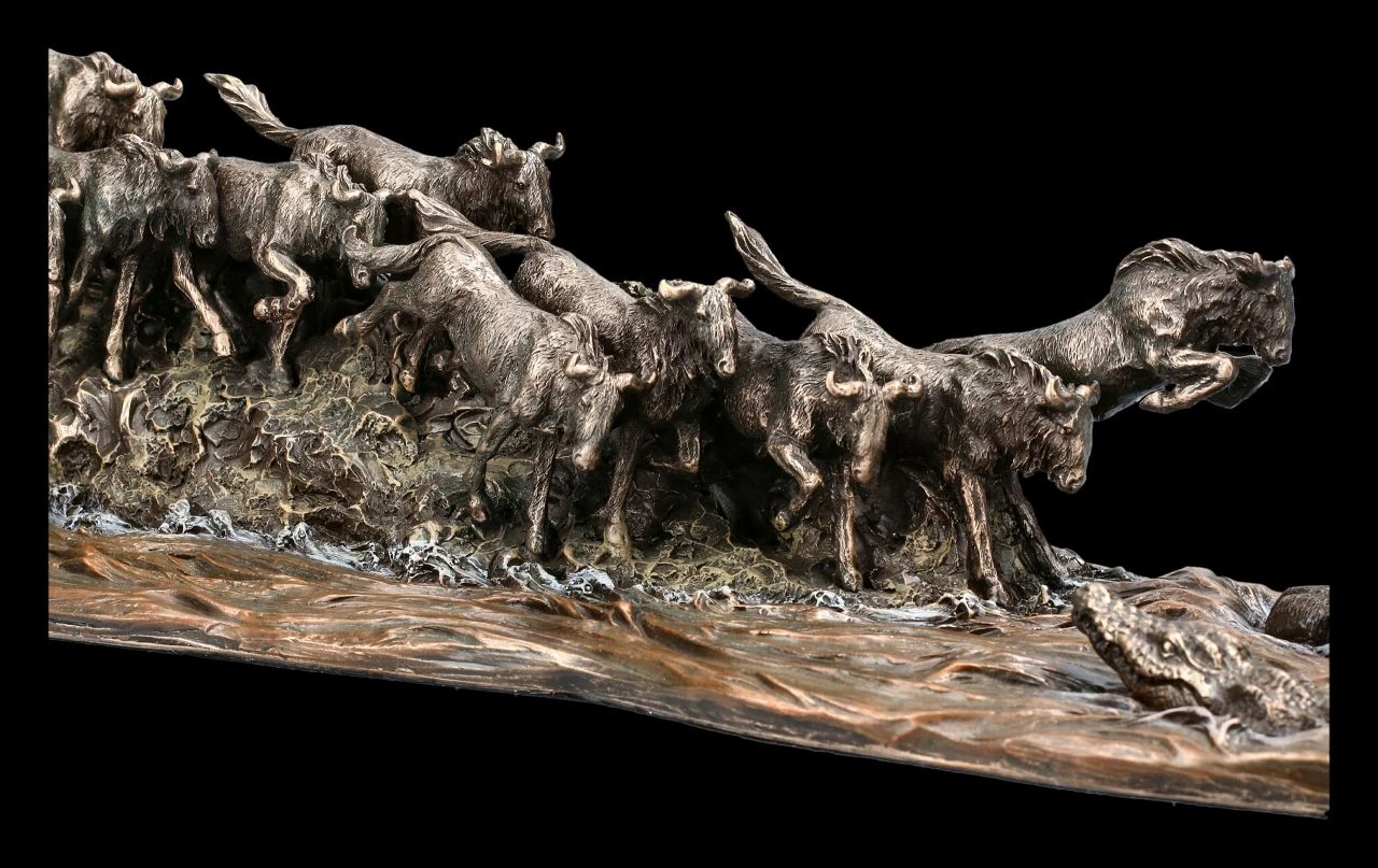 Auf der Flucht vor Löwen oder anderen Feinden rast die Gnu Herde über die Felsenlandsschaft und stürzt sich in den reißenden Fluß. Man hält fast selbst den Atem an, so beeindruckend detailreich ist die Dekofigur ‚Great Migration‘ aus der Studio Collection von Veronese gestaltet. Die faszinierende Gnu Herde aus Kunststein (Polyresin) ist sehr sorgfältig bronziert und coloriert. Sie ist 10,5 cm hoch, 43,5 cm breit und 11 cm tief. Ob auf der Fensterbank oder auf dem Sideboard – die außerordentliche Dekofigur wird überall zum sofortigen Blickfang. Sie ist auch ein ganz besonderes Geschenk für alle, die von der Natur des afrikanischen Kontinents fasziniert sind.
