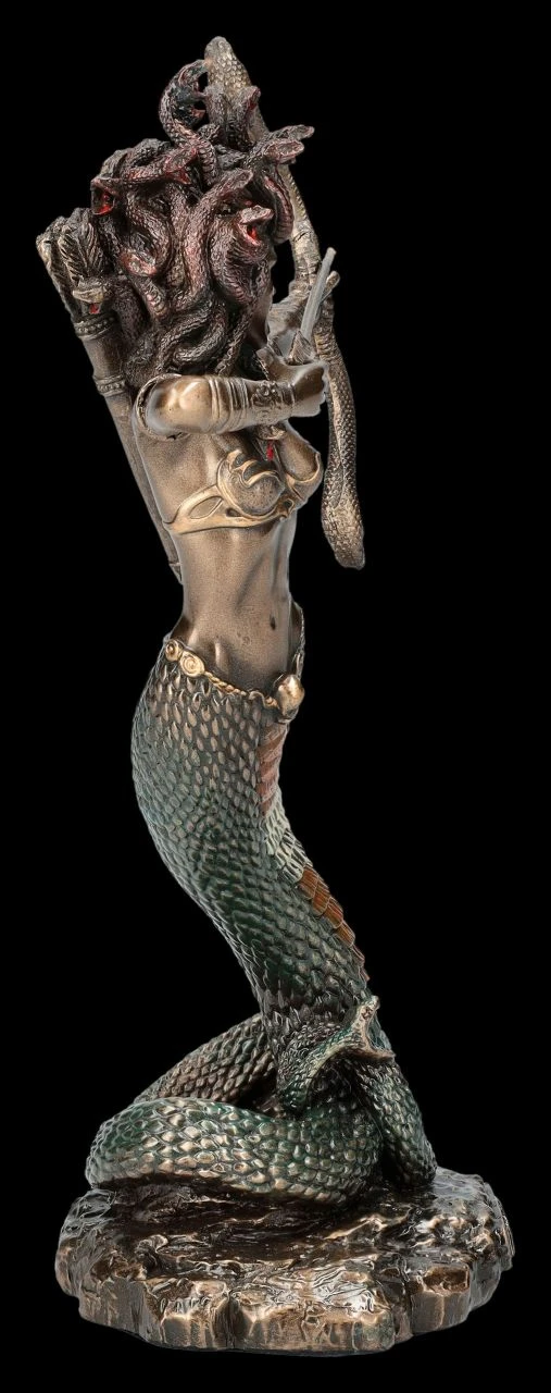 Laut griechischer Mythologie wurde die einst so schöne Gorgone Medusa im Tempel der Athene von Poseidon vergewaltigt und danach wurde sie von Athene aus Rache in ein Monster verwandelt. Medusas Zorn war also durchaus berechtigt, daher sollte sich jeder vor einer Begegnung hüten, denn das führte ungeschützt unweigerlich zum Tod. Bei dieser kleinen Götter Figur aus der Studio Collection von Veronese kommt der berechtigte Zorn Medusas sehr gut zur Geltung. Hoch aufgerichtet auf ihrem Schlangen-Unterkörper, das Gesicht von Zorn verzerrt und mit Haaren aus züngelnden Schlangen spannt Medusa ihren Schlangenbogen und setzt den Pfeil an. Die 16 cm hohe, 9,5 cm breite und 6 cm tiefe Götter Figur ‚Medusa’s Wrath‘ in Mini ist wunderbar detailreich aus edel bronziertem und fein coloriertem Kunststein (Polyresin) entstanden und ein Blickfang in jedem Ambiente. Sie ist aber auch ein perfektes Geschenk für jeden, der sich für die alte Götterwelt interessiert.