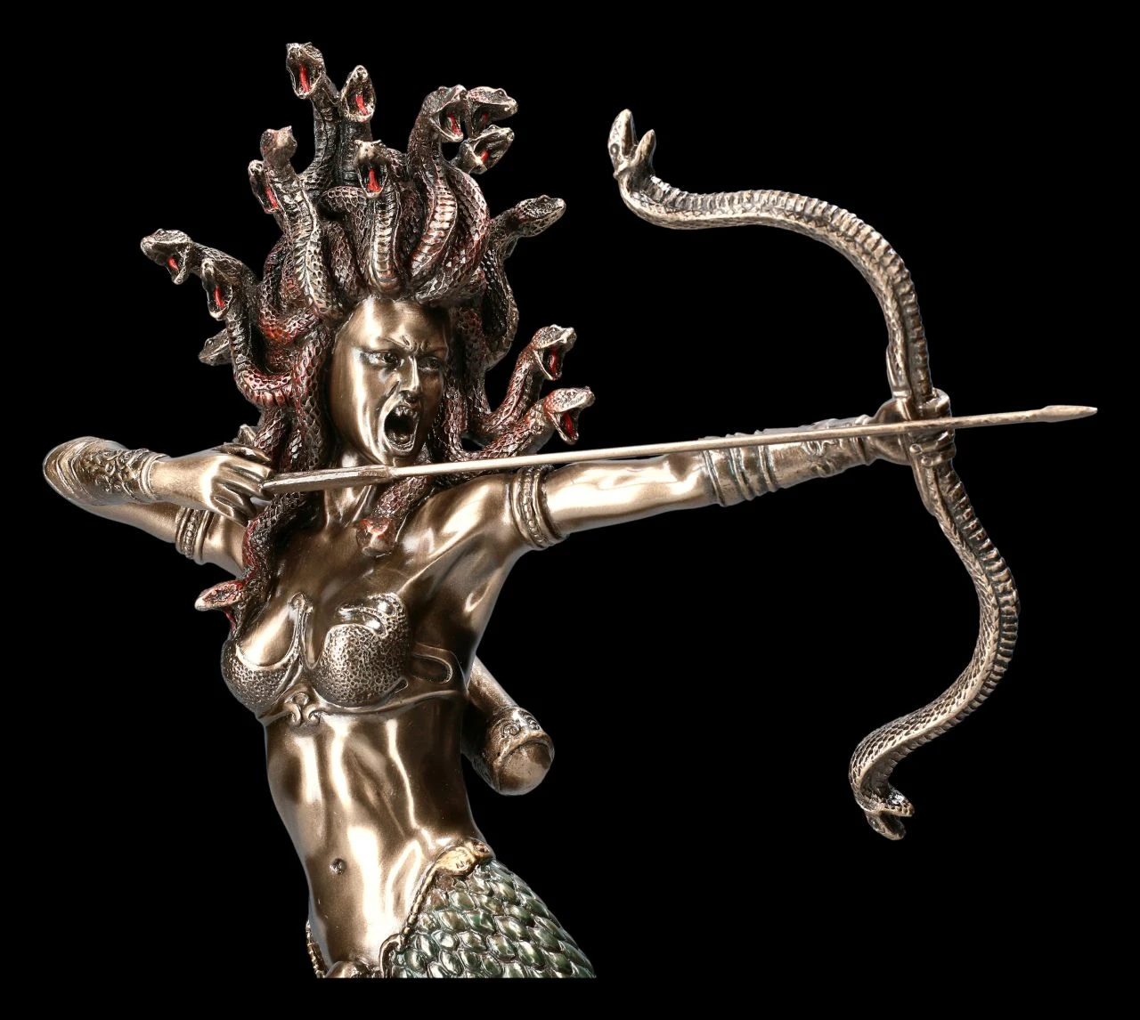 Wehe dem, der den Zorn der Medusa heraufbeschwört, denn wer sie erblickt, wird zu Stein verwandelt. Nach der griechischen Mythologie wurde die schönste der Gorgonen einst von Athene, die sie beim Liebesspiel mit Poseidon im Tempel erwischte, nach der Entweihung des Tempels zu einem Monster mit Schlangenhaaren, Schuppenpanzer, bronzenen Armen und glühenden Augen verwandelt. Nach dem griechischen Dichter Ovid wurde Medusa allerdings von Poseidon vergewaltigt und war also unschuldig an ihrer Verwandlung. Medusa’s Zorn wird bei der Götterfigur, bei der sich Medusa aus einem Schlangenkörper herauswindet, durch den wütend aufgerissenen Mund und den gespannten Pfeil und Bogen sehr deutlich dargestellt. Wunderbar detailreich aus edel bronziertem und coloriertem Kunststein (Polyresin) gefertigt, ist die Götterfigur Medusa’s Wrath aus der Studio Collection von Veronese mit der Höhe von 36 cm, der Breite von 21,5 cm und der Tiefe von 13 cm ein ganz besonderer Blickfang und ein außergewöhnliches Geschenk für jeden, der sich für die griechische Mythologie interessiert.