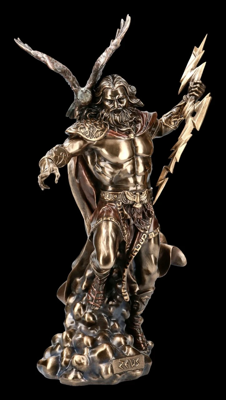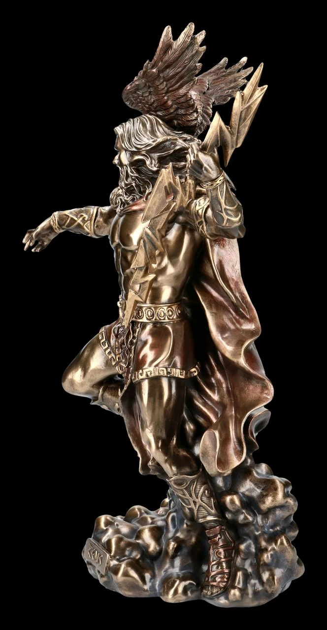 Dem Göttervater Zeus in seiner ganzen Zornesgestallt kann niemand widerstehen. Entschlossen zeigt der Göttervater in eine Richtung und hält seinen Blitz schon in seiner Hand bereit. Er wird begleitet durch seinen klugen Adler. Die hochwertige Figur schimmert durch die Bronzierung sanft im Licht und wird so zu einem aufregenden Blickpunkt.