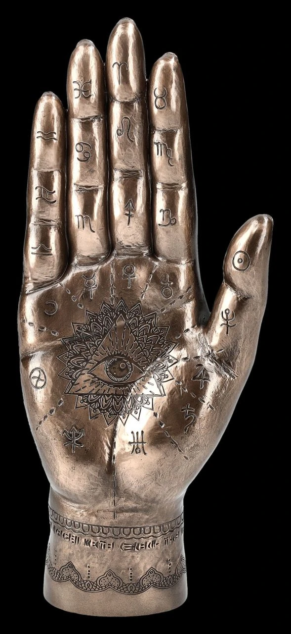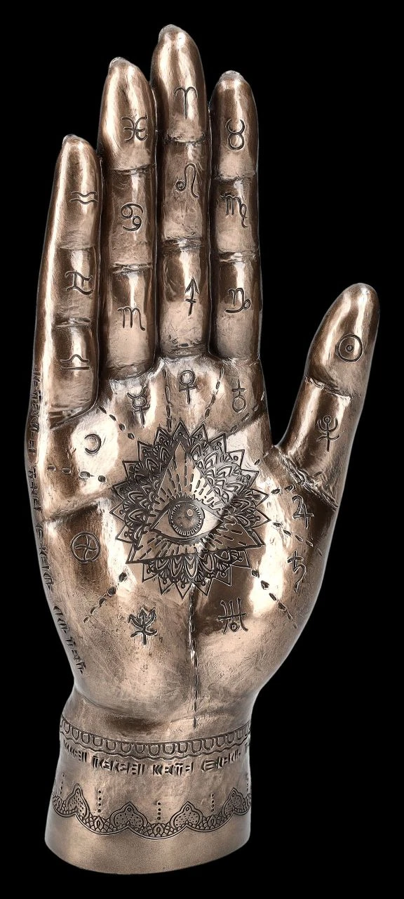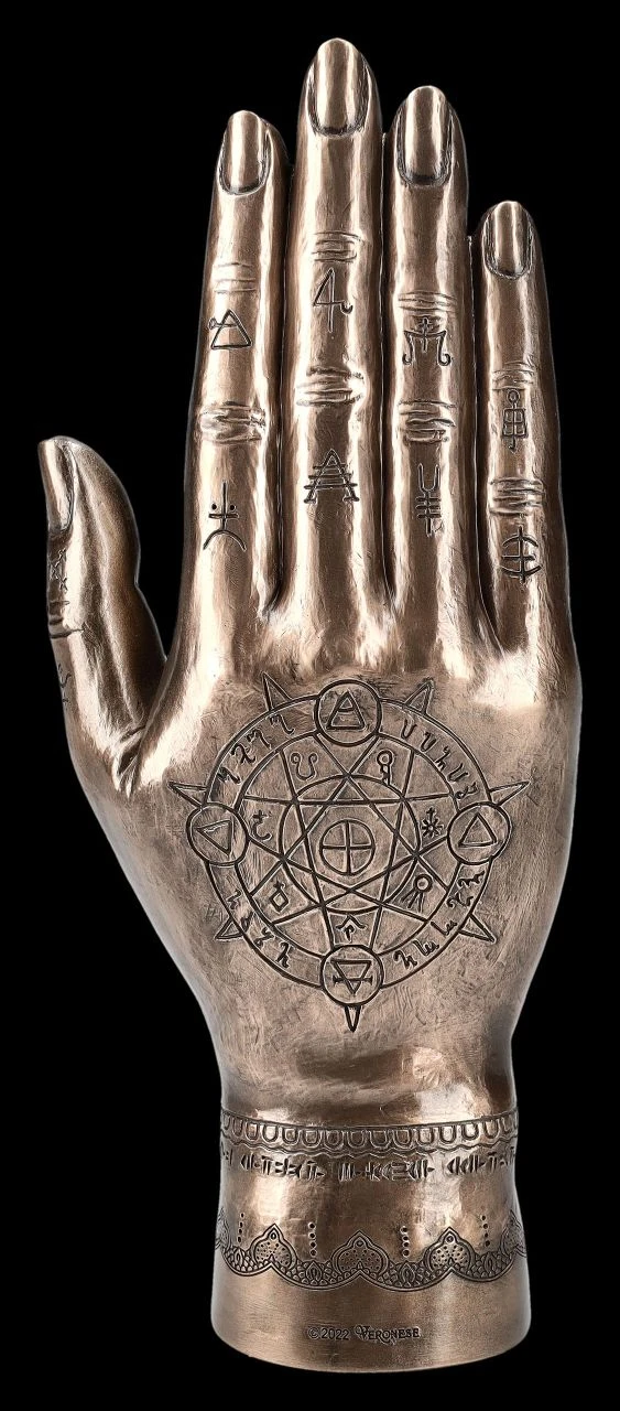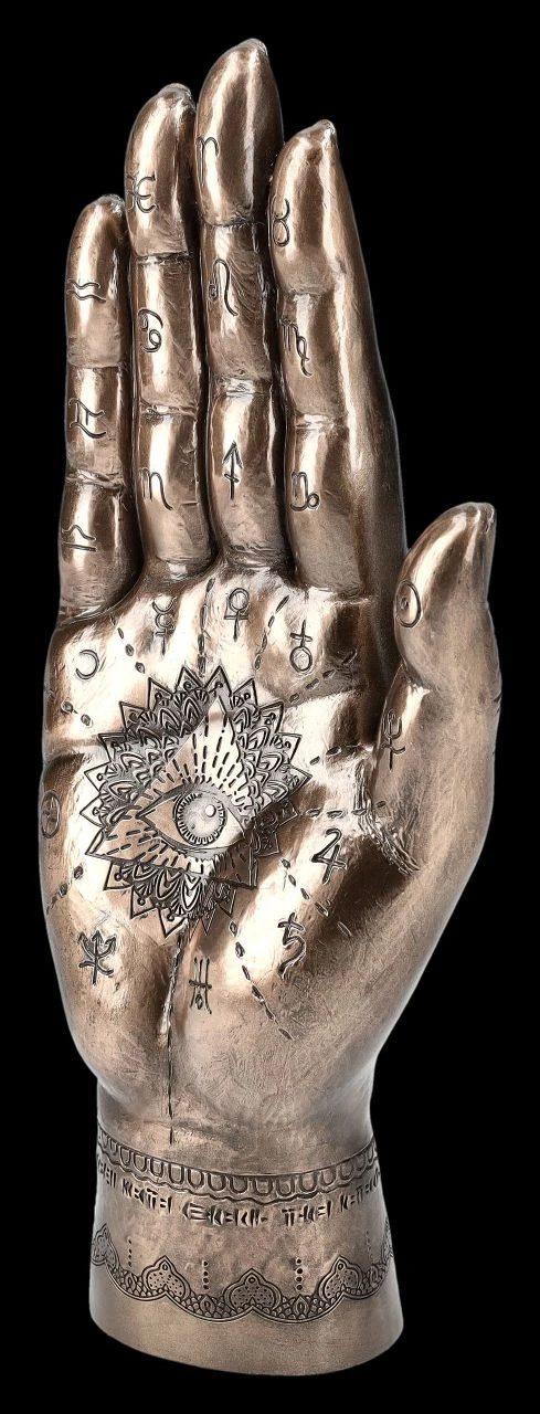 Zahlreiche Symbole zieren diese schöne und detailreiche Hand der Fatima. Sehr schön gezeichnet ist das Auge in der Mitte, das gegen den Dschinn und den Bösen Blick schützen soll. Fatimas Hand ist mittlerweile nicht mehr nur in Nordafrika und dem Nahen Osten ein wichtiges und Segen spendendes Symbol für Kraft und Glück. Die 23,5 cm hohe, 6 cm breite und 5 cm tiefe Dekofigur der Hand der Fatima stammt aus der Studio Collection von Veronese. Sie wurde aus fein bronziertem Kunststein (Polyresin) gefertigt und ist ein wunderbares Geschenk für jeden, dem man Kraft und Glück und damit auch Schutz vor dem Bösen wünscht.