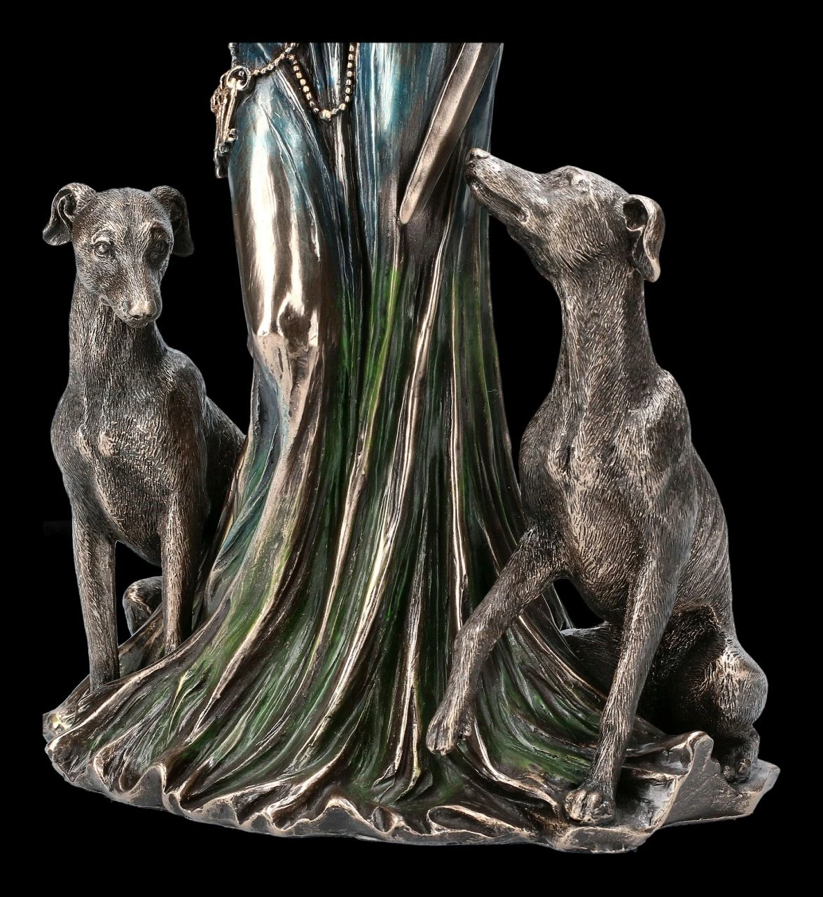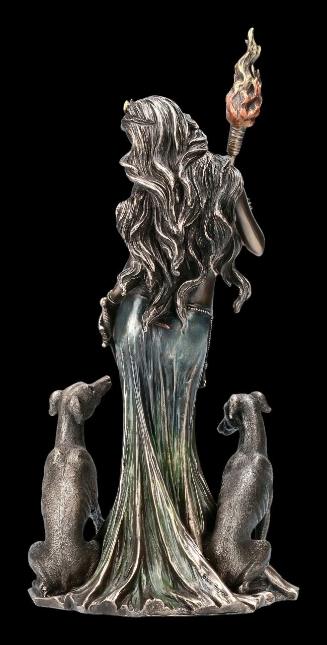 Hekate ist in der griechischen Mythologie die Göttin des Wandels, der Mondphasen, der Übergänge und wird als die Magierin unter den Göttern verehrt. Sie wird oft von verschiedenen Tieren begleitet, wie bei dieser wunderschönen Hekate Figur von zwei Hunden und einer Schlange, die sich um ihren Oberkörper windet. In der rechten Hand trägt die Magierin und Griechische Göttin Hekate eine brennende Fackel. Die wunderschöne und edel bronzierte Hekate Figur aus der Studio Collection von Veronese ist sehr aufwändig aus Kunststein (Polyresin) gefertigt und sehr fein und zart coloriert. Die sehr attraktive und dekorative Figur mit der Höhe von 34 cm, der Breite von 16 cm und der Tiefe von 12 cm sollte ihren Platz da finden, wo sie sofort entdeckt und bewundert werden kann.