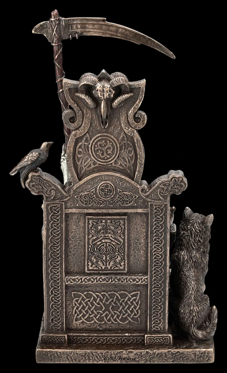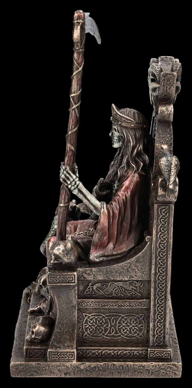 Hel, die Tochter Lokis und der Riesin Angrboda ist in der nordgermanischen Mythologie die Herrscherin der Unterwelt, manchmal auch Helheim genannt. Zu einer Hälfte schön und jung und zur anderen Hälfte als Skelett mit der Sense in der Hand sitzt Hel bei dieser fantastischen Skulptur auf dem reich verzierten Thron. Ein Widderschädel schmückt das oberen Ende des Throns und zwei verzierte Totenschädel sind auf den Lehnen zu sehen, während weitere Totenschädel zu Füßen Hels liegen. Begleitet wird sie von ihren Geschwistern, der Midgardschlange, die sie im Schoß hält und dem Fenriswolf, der an ihrer rechten Seite sitzt. Wie ihre Geschwister gehört die Todesgöttin Hel nicht zum Göttergeschlecht der Asen, sondern zu den Riesen. Die detailreiche, 23 cm hohe, 11 cm breite und 11 cm tiefe edel bronzierte und zurückhaltend colorierte Skulptur aus Kunststein (Polyresin) von Veronese ist einfach faszinierend. Die interessante Figur der germanischen Göttin des Todes auf dem Thron ist für alle Anhänger der nordischen Mythologie auch ein wunderbares Geschenk.