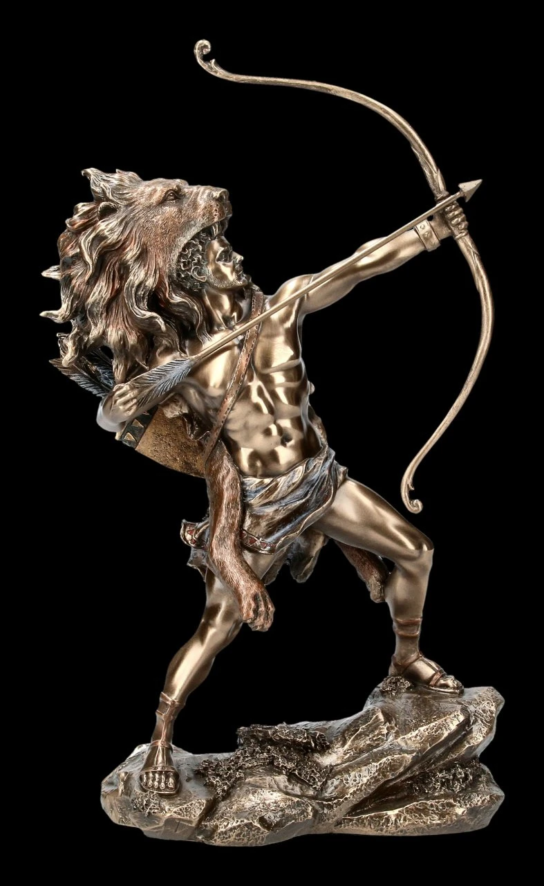 Herakles oder auch als Herkules bekannt ist wohl eine der bekanntesten Sagengestalten der griechischen Mythologie. In diesem Fall wird er mit drei seiner vier Attribute abgebildet: Seinem Köcher, seinem Bogen und dem Fell des nemeischen Löwen welcher als unverwundbar galt.