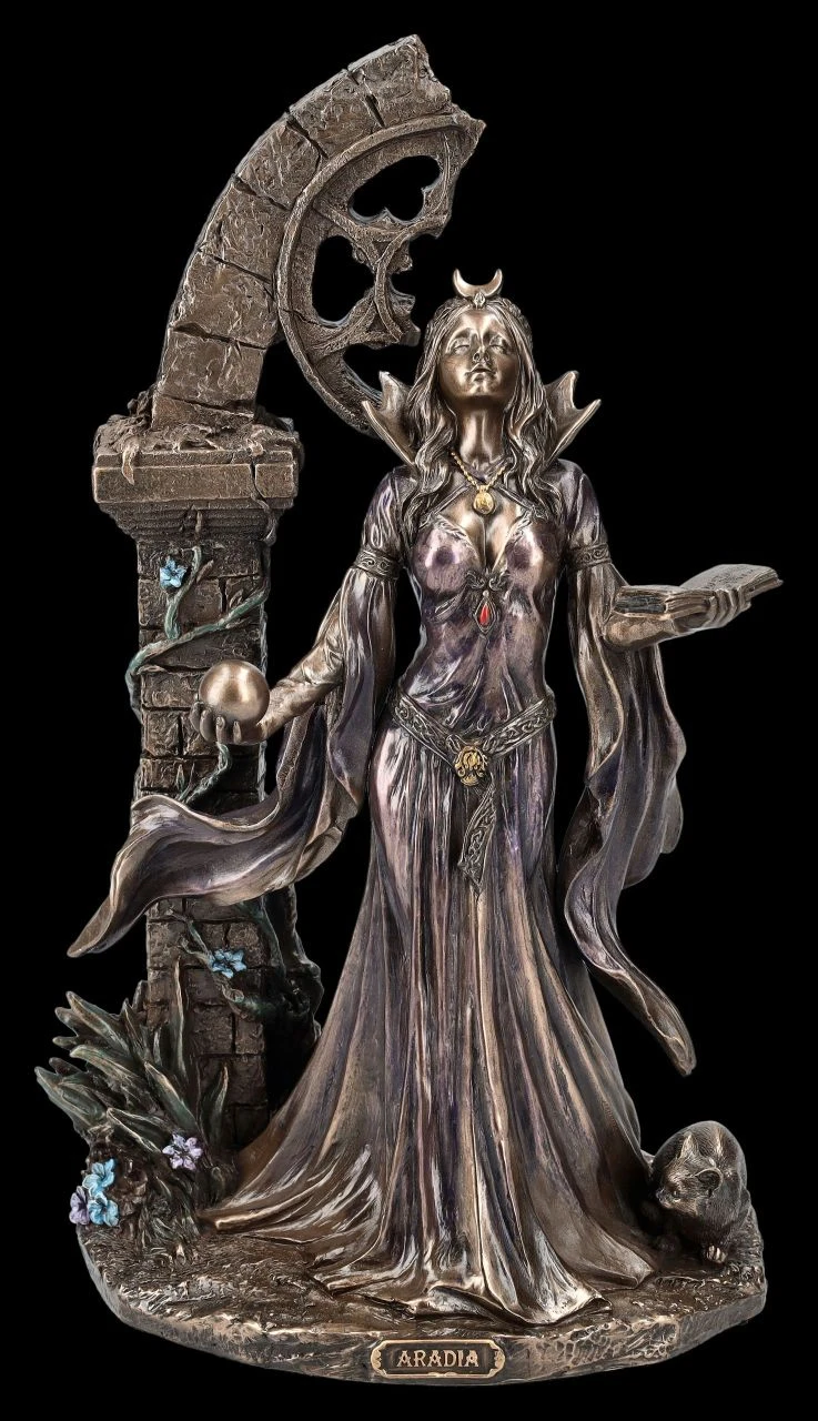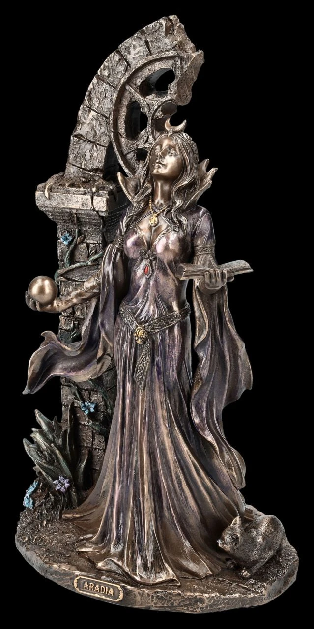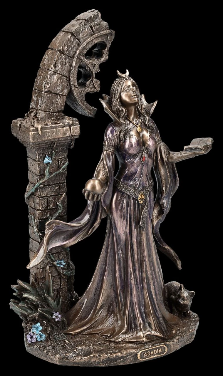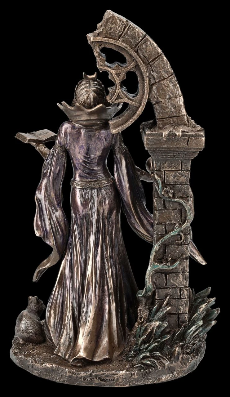 Das alte Buch der Magie in der linken Hand und die Kugel der Vorhersehung in der rechten, so erscheint Aradia, die große Wicca Königin der Hexen vor einem halb verfallenen Portal. Die von Charles G. Leland beschriebene große Mondgöttin erscheint, den Blick nach oben erhoben, in einem fließenden Kleid und mit einer Mondsichel als Schmuck auf dem Kopf vor dem verfallenen Torbogen. Die schöne und fantasievolle Skulptur aus der Studio Collection von Veronese ist aus hochwertigem Kunststein (Polyresin) gefertigt. Sie wurde sehr fein und edel bronziert und nur zurückhaltend coloriert. Die 24,5 cm hohe, 15,5 cm breite und 11 cm tiefe herrliche Skulptur ist nicht nur ein magischer Blickfang, sondern auch ein perfektes Geschenk.