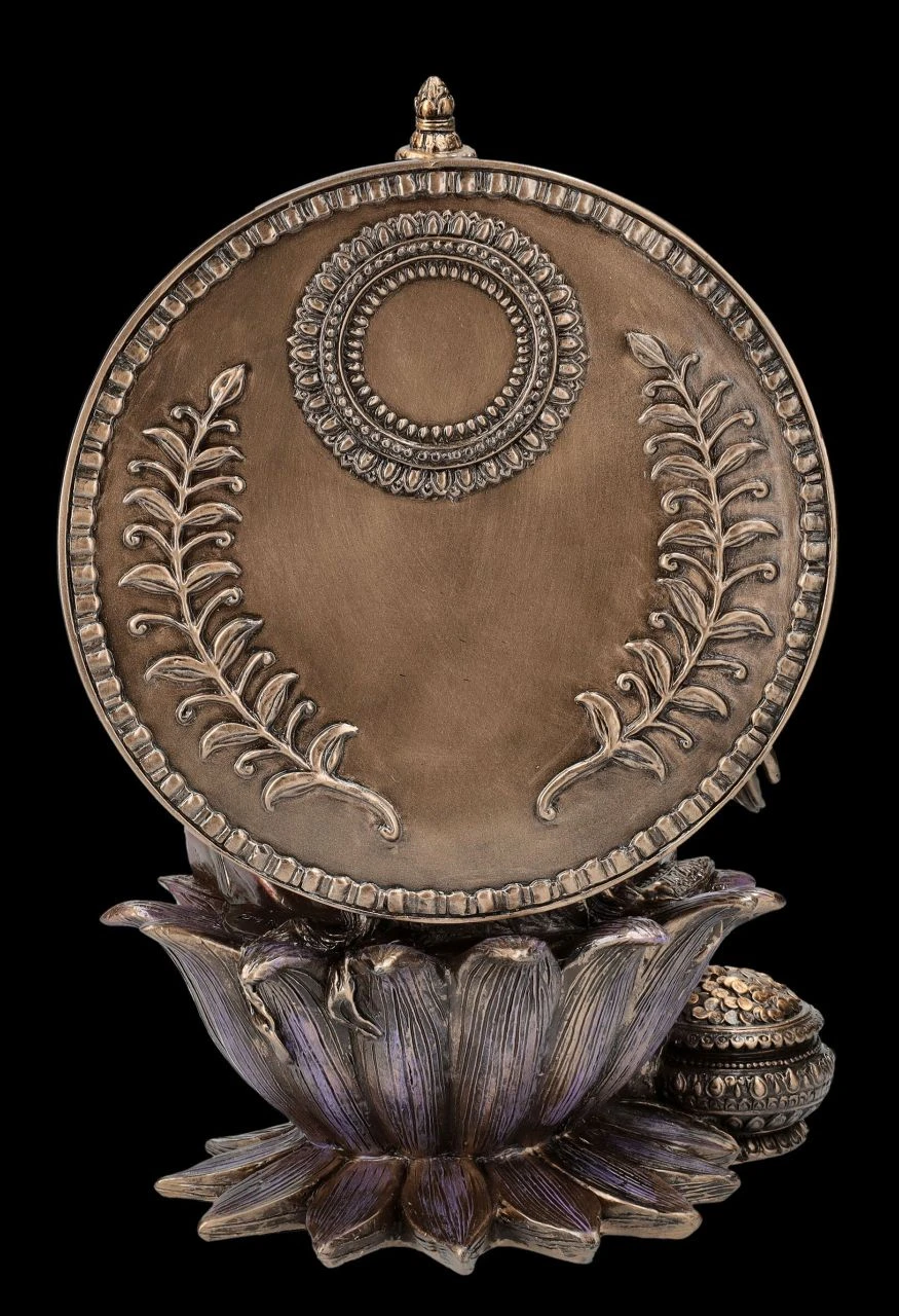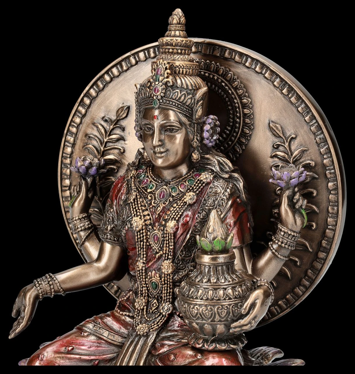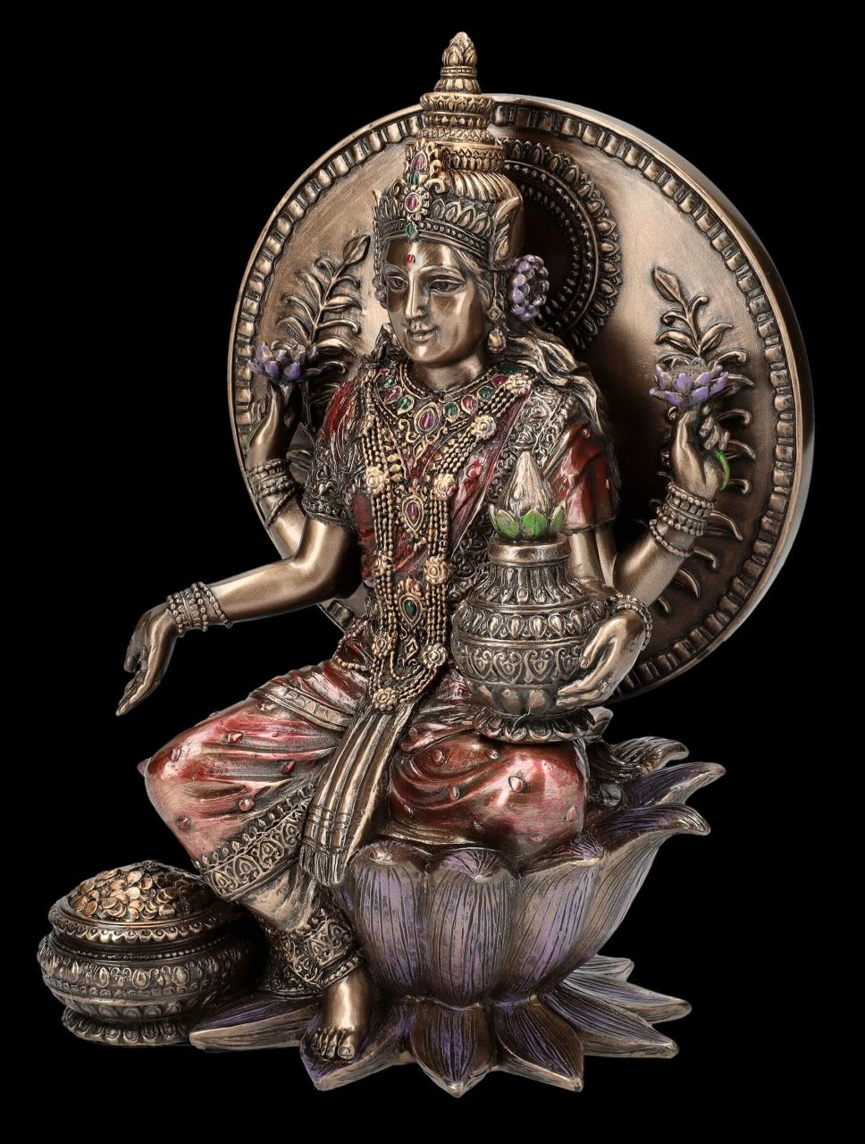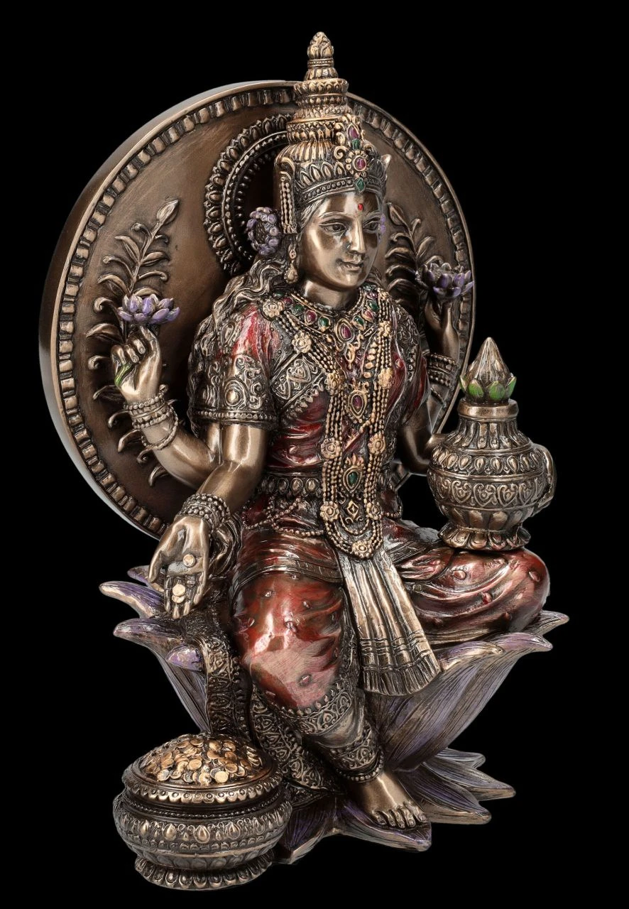 Nach der hinduistischen Mythologie ist Lakshmi, die hinduistische Göttin der Liebe, der Fruchtbarkeit, der Gesundheit und Schönheit und Spenderin von Reichtum, von Fülle und Glück. Sie soll einst in einer Lotusblüte sitzend aus dem ‚Milchsee des Universums‘ aufgetaucht sein. In einer Lotusblüte, dem Symbol für Reinheit und Vollkommenheit, sitzt auch diese wunderbare Figur der Göttin des Glücks und des Wohlstands wie auf einem Thron. Ihr roter Sari bedeutet Reichtum und der Krug auf ihrem linken Knie hat die Bedeutung von Glück und Fülle. In ihren beiden erhobenen Händen hält die schöne Figur der Göttin – wie in zahlreichen Darstellungen – jeweils eine Lotusblüte und mit der anderen Hand lässt sie Münzen in den Kessel zu ihren Füßen fallen. Die wunderbare Lakshmi Figur aus der Studio Collection von Veronese ist aus edel bronziertem und fein coloriertem Kunststein (Polyresin) und 21 cm hoch, 13,5 cm breit und 10,5 cm tief. Sie ist nicht nur sehr dekorativ, sondern auch ein perfektes Geschenk für jeden, dem man Glück, Gesundheit und Reichtum wünscht.