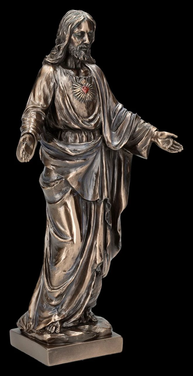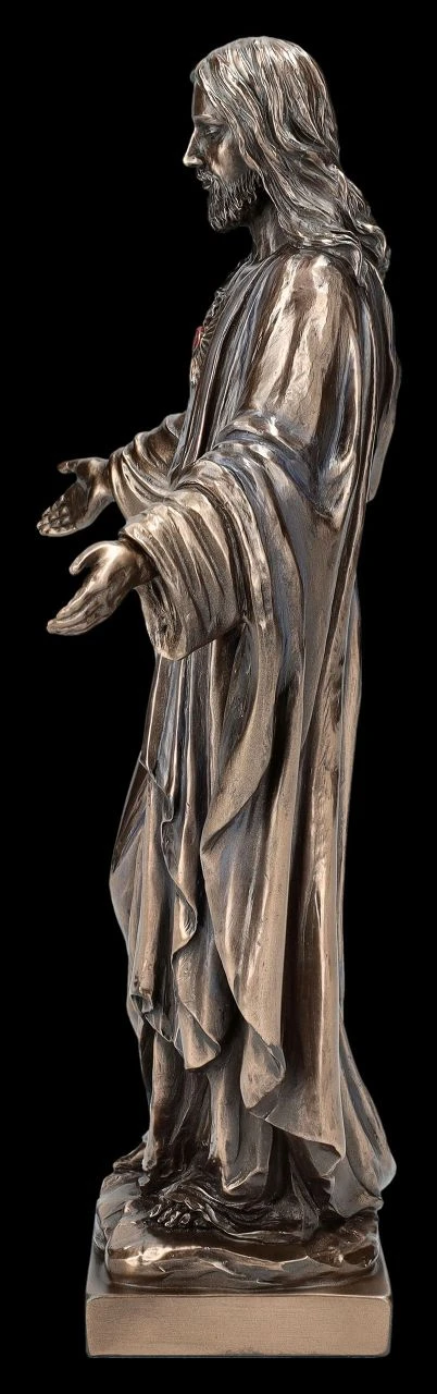 Aus der Studio Collection von Veronese stammt diese edel bronzierte und zurückhaltend colorierte Jesus Figur. Bereits seit dem Mittelalter sind Darstellungen bekannt, in denen Jesus sein Herz präsentiert. Ab dem 19. Jahrhundert wird das Symbol des Herzens als Zeichen für die Liebe Jesus in der Körpermitte und nicht auf der linken Seite bildlich dargestellt wird. Die schöne Figur ‚Gesegnetes Herz Jesu‘ aus hochwertigem Kunststein (Polyresin) ist 25,5 cm hoch, 14,5 cm breit und 7 cm tief. Sie ist nicht nur zu den Herz Jesu-Feiern im Juni eine wunderbare Ergänzung auf einem privaten Altar, sondern auch ein perfektes Geschenk als Zeichen der Liebe Jesu.