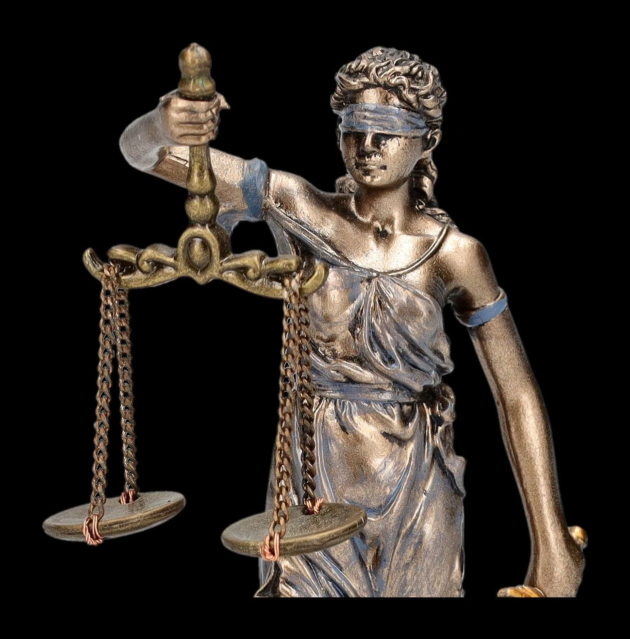 Mit der Binde vor den Augen als Zeichen, dass sie ohne Ansehen der Person ein gerechtes Urteil fällt, steht die kleine Figur der Justitia auf dem mit ihrem Namen gekennzeichneten Podest. In der rechten Hand hält sie die Waage, die ihr dabei hilft, das richtige Strafmaß zu finden und in der linken Hand hält sie das Schwert, das für die Härte der Strafe steht. Die kleine, 9 cm hohe, 4 cm breite und 4 cm tiefe Figur der Lady Justice aus bronziertem und fein coloriertem Kunststein (Polyresin) stammt aus der Studio Collection von Veronese und kann z.B. perfekt zu jeder Prüfung mitgenommen werden.