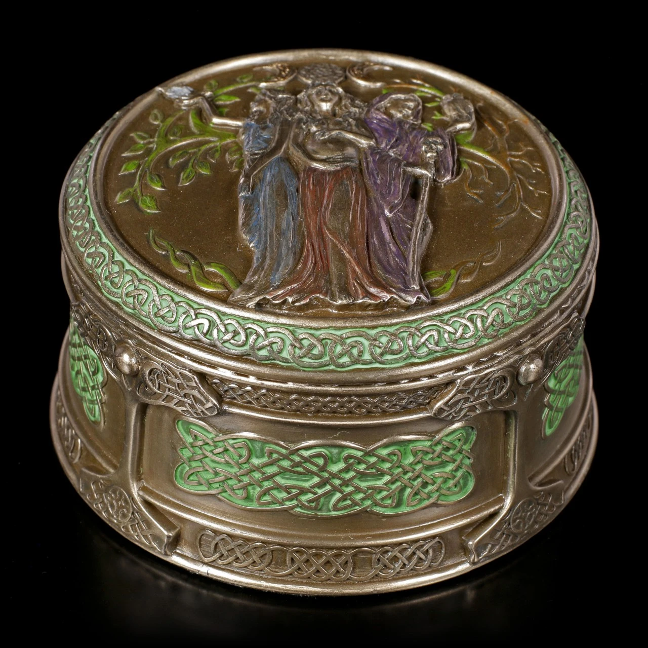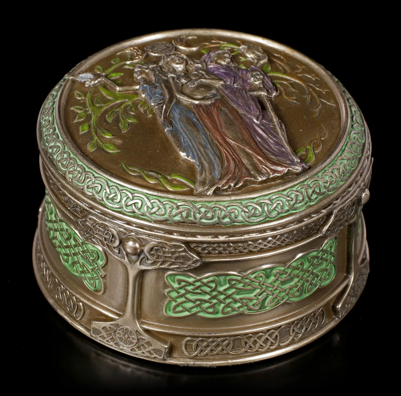 Die reich verzierte, bronzierte und colorierte Schatulle aus dem Haus Veronese aus und wird Sie begeistern. Der Deckel der runden Schatulle aus Kunststedin (Polyresin) ist mit dem Emblem der Dreifaltigen Mutter verziert und die Seite der Schatulle ist rundherum mit keltischen Knoten sowie dem Weltenbaum verschönert. Sie ist eine wirklich besondere Aufbewahrungsmöglichkeit für kleine Kostbarkeiten.