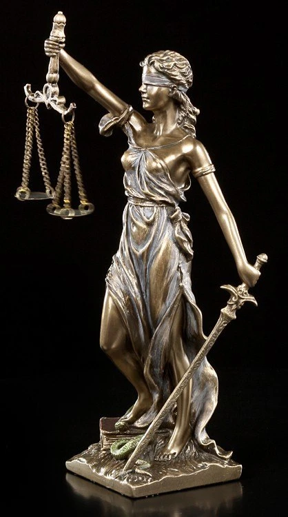 Römische Göttin der Gerechtigkeit. Im Griechischen genannt Dike. Darstellung mit Waage (Abwägen der Sachlage), dem Richtschwert (durchführen der Entscheidung) und der Augenbinde (Unvoreingenommenheit)