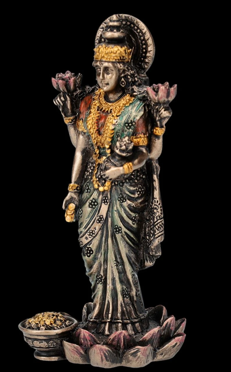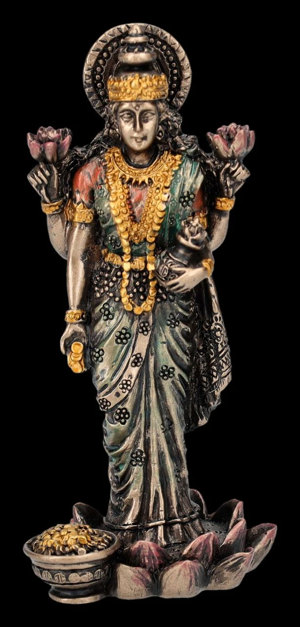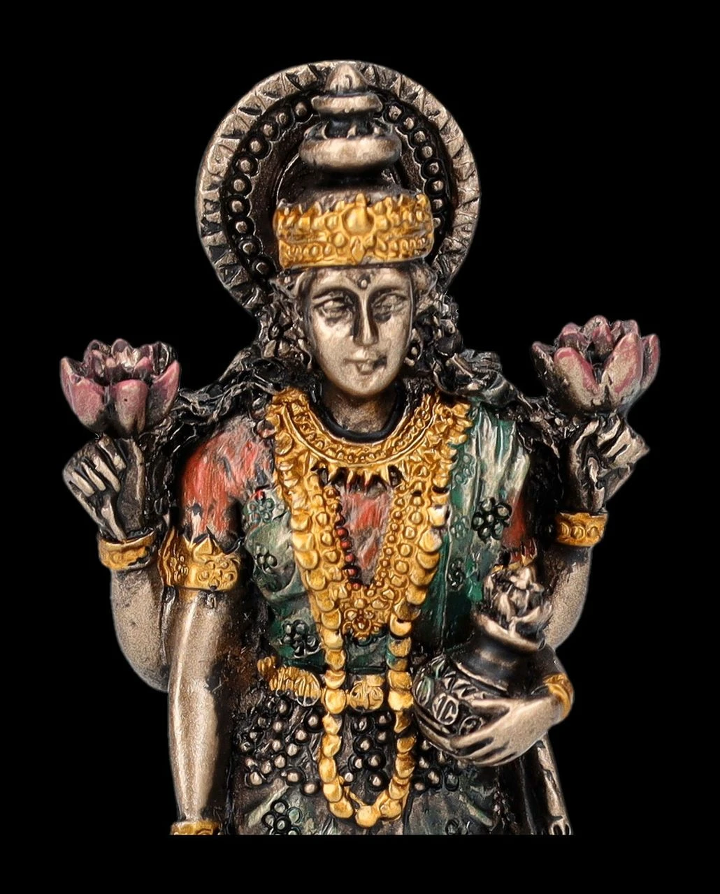 Als kleiner Glücksbringer ist diese schöne kleine Figur von Lakshmi, der Hinduistischen Göttin der Liebe ein ganz besonderes Geschenk, denn die Göttin wird nicht nur als Spenderin von Harmonie und geistigem Wohlbefinden, sondern auch von Reichtum, Fülle und Überfluss verehrt. Lakshmi steht auf einer Lotusblüte und zu ihren Füßen steht ein Kessel, in den sie mit einem ihrer vier Arme Münzen fallen lässt. In der anderen Hand hält sie eine Lotusblume und auch in den beiden erhobenen Händen hält die Göttin jeweils eine Lotusblüte. Die kleine, 8 cm hohe, 4 cm breite und 3,5 cm tiefe Figur von Lakshmi aus der Studio Collection von Veronese ist aus fein bronziertem und coloriertem Kunststein (Polyresin) gefertigt.
