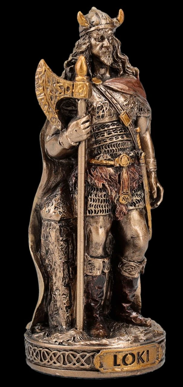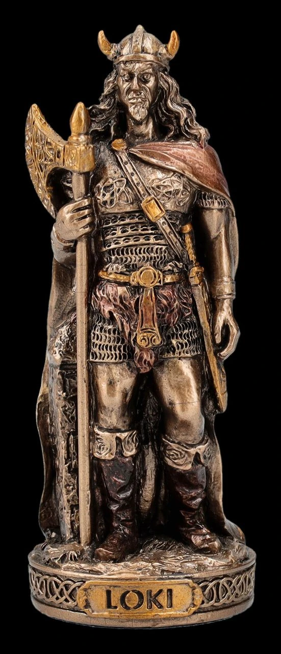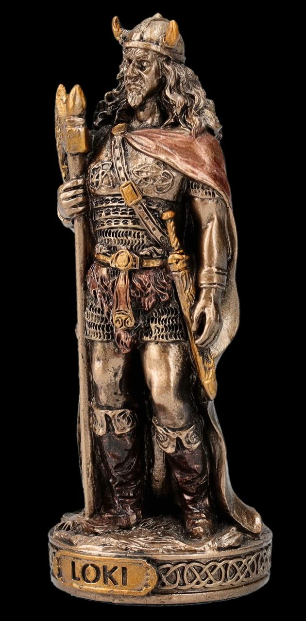 Der Gestaltenwandler Loki galt in der nordischen Mythologie als unbeständig und auch als Trickser. Bei dieser Loki Figur aus der Studio Collection von Veronese wirkt der nordische Gott mit der Axt in der rechten Hand, in Rüstung, Umhang und mit dem Helm eher kriegerisch. Er steht auf dem mit seinem Namen beschriebenen Podest. Die kleine bronzierte und sehr fein colorierte Figur aus Kunststein (Polyresin) ist 8,5 cm hoch, 3,5 cm breit und 3,5 cm tief und wunderbar detailreich dargestellt. Die Loki-Figur ist – eventuell gemeisam mit den anderen Götterfiguren aus unserem Shop – ein perfektes Geschenk für alle, die von der nordischen Mythologie fasziniert sind.