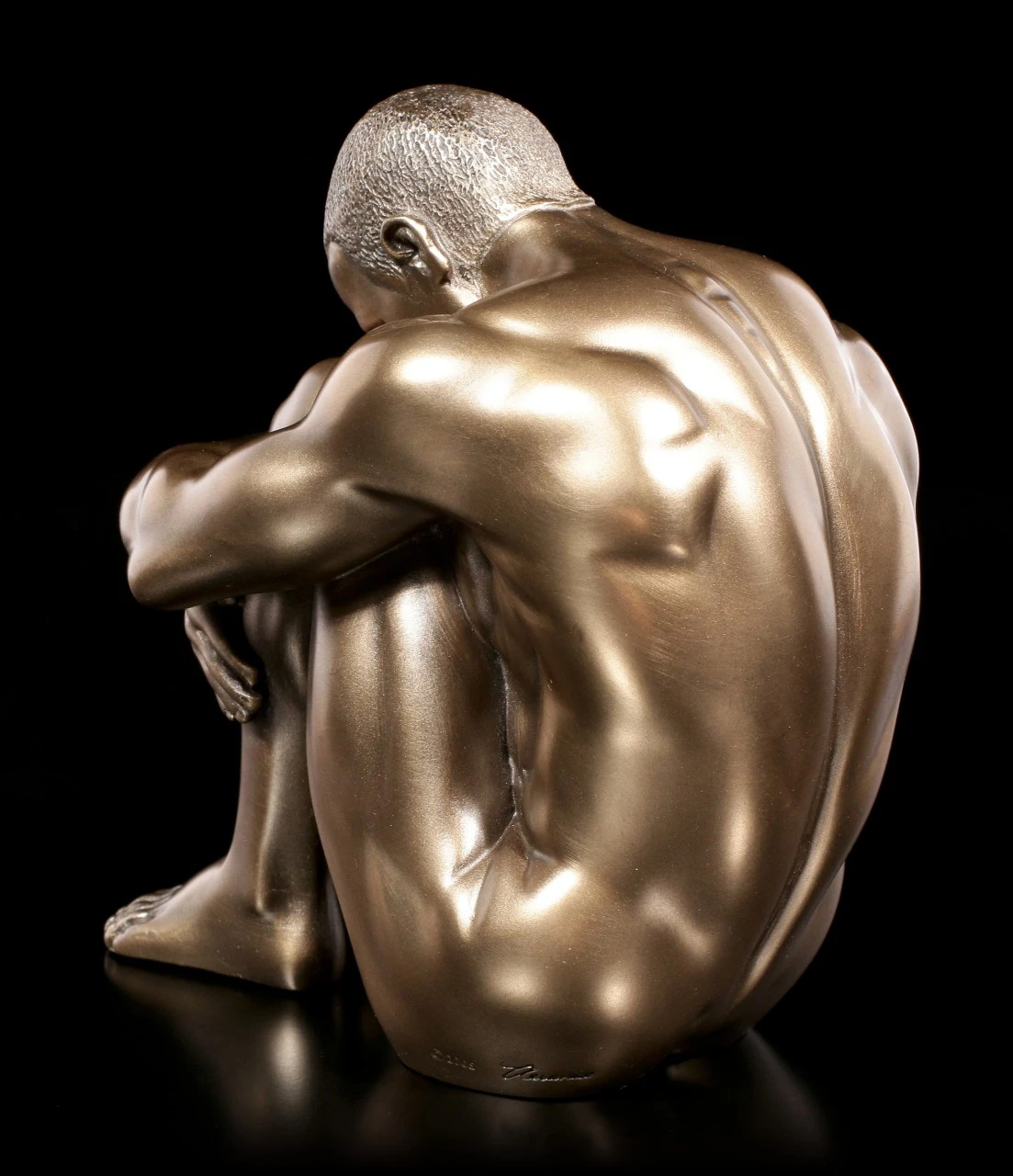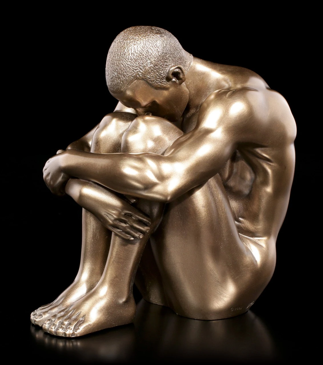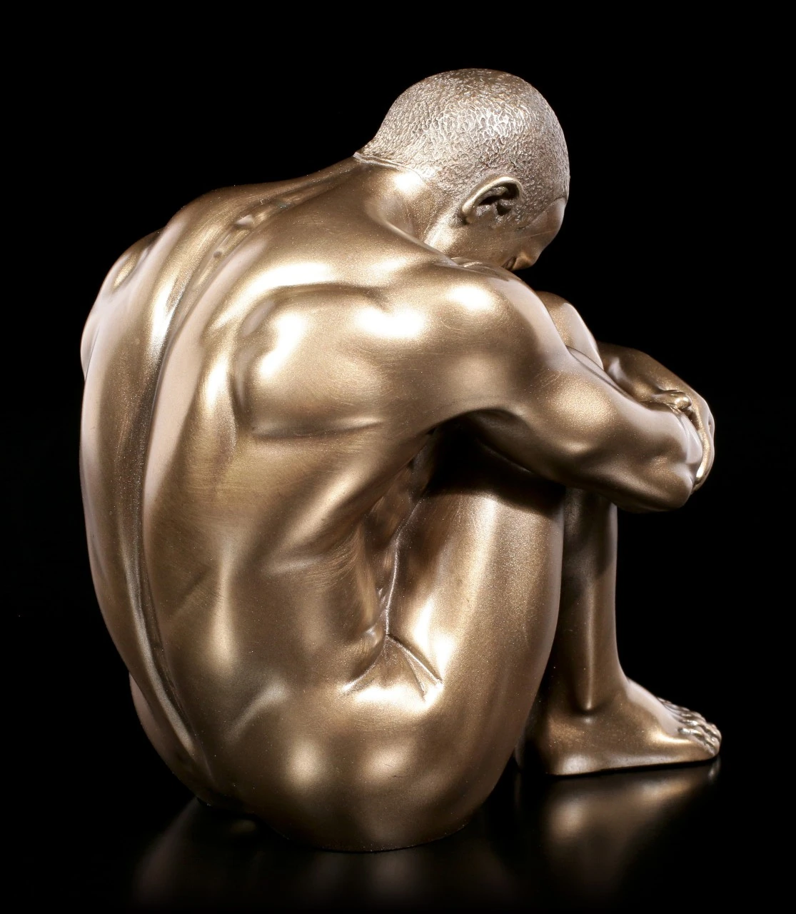 Der männliche Akt sitzt am Boden und hat seinen Kopf auf seine Knie gelegt. Er scheint sich komplett aus seiner Umwelt zurückzuziehen. Durch die Bronzierung glänzt die sinnliche Figur sanft im Licht und ziert jedes Zimmer.