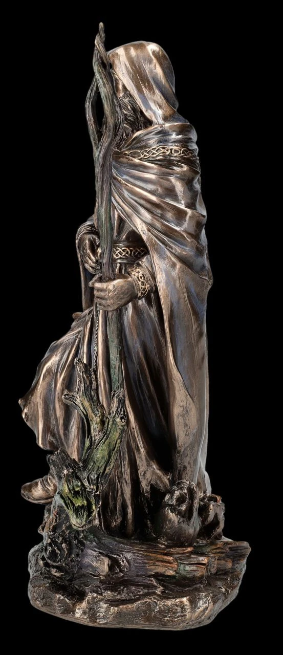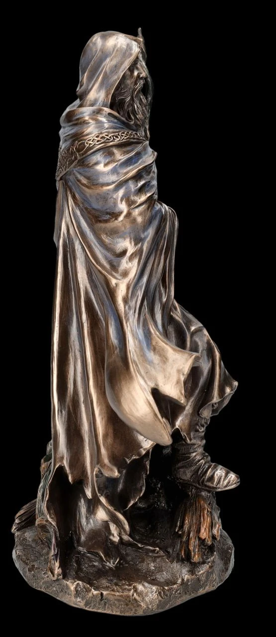 Die vom bekannten amerikanischen Designer und Illustrator Monte Michael Moore für Veronese entworfene Figur des Zauberers Merlin, der oft auch als der letzte Druide bezeichnet wird, ist ein wahrlich effektvoller Blickfang. Der große Zauberer Merlin aus der Artussage ist in seiner ernsthaften und weisen Ausstrahlung wunderbar gelungen. Bei dieser einzigartigen und detailreichen Skulptur aus edel bronziertem und sehr zurückhaltend coloriertem Kunststein (Polyresin) scheint der große Zauberer über alte verdorrte Baumwurzeln direkt aus den geheimnisvollen Tiefen der Wälder zu kommen. In seiner Hand hält er seinen mächtigen Zauberstab. Die Merlin-Figur aus der Serie ‚The Triumphs of Humanity‘ von Veronese ist 29 cm hoch, 20 cm breit und 12 cm tief. Für Sammler und alle, die von der Artussage fasziniert sind, ist der Zauberer Merlin von Monte M. Moore – vielleicht auch gleich mit der Figur der schönen Morgana von Veronese aus unserem Shop – ein perfektes Geschenk.