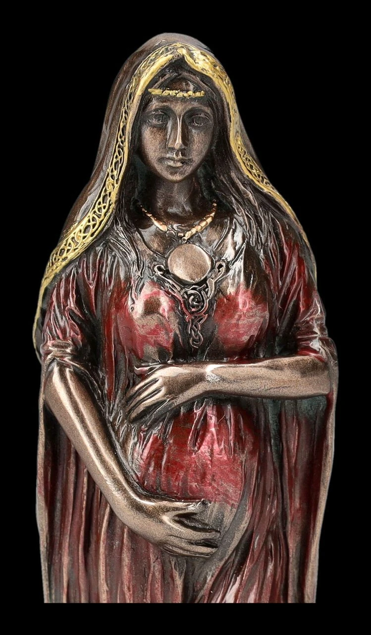 Seit der Antike ist die Verehrung der Dreifachen Göttin, als Göttin der Magie, der Zauberkraft und der Wandlung bekannt. Die Keltische Dreifaltigkeitsgöttin wurde z.B. im alten Griechenland als Hekate verehrt. Die Dreifaltigkeitsgöttin repräsentiert auch die Mondphasen und dieses mächtige Symbol wird sie ständig begleiten. Dabei stellt der Vollmond die Mutter dar, wie bei dieser zauberhaften kleinen Figur aus der Studio Collection von Veronese. Die schöne 10 cm hohe, 5 cm breite und 4 cm tiefe Figur der Keltischen Dreifaltigkeitsgöttin aus bronziertem und wunderbar coloriertem Kunststein (Polyresin) zeigt sie als Mutter-Figur im roten Kleid, von Korngaben und anderen Ernte-Früchten umgeben. Zärtlich umfassen ihre Hände ihren schwangeren Bauch. Als Schmuck trägt sie eine Kette mit dem Vollmond als Anhänger. Bei allen Ritualen, die mit der Weiblichkeit oder auch mit dem Mond zu tun haben, wird diese bezaubernde kleine Mutter-Figur der Dreifaltigkeitsgöttin – sicher gemeinsam mit der Figur der Jungfrau und der alten weisen Frau aus unserem Shop – siehe auch Bestell-Nummer FS26077 und FS26079 – jeden Altar wunderbar schmücken. Auch kann mit den anderen beiden Figuren der Keltischen Dreifaltigkeitsgöttin ein magisches Diorama gestaltet werden.
