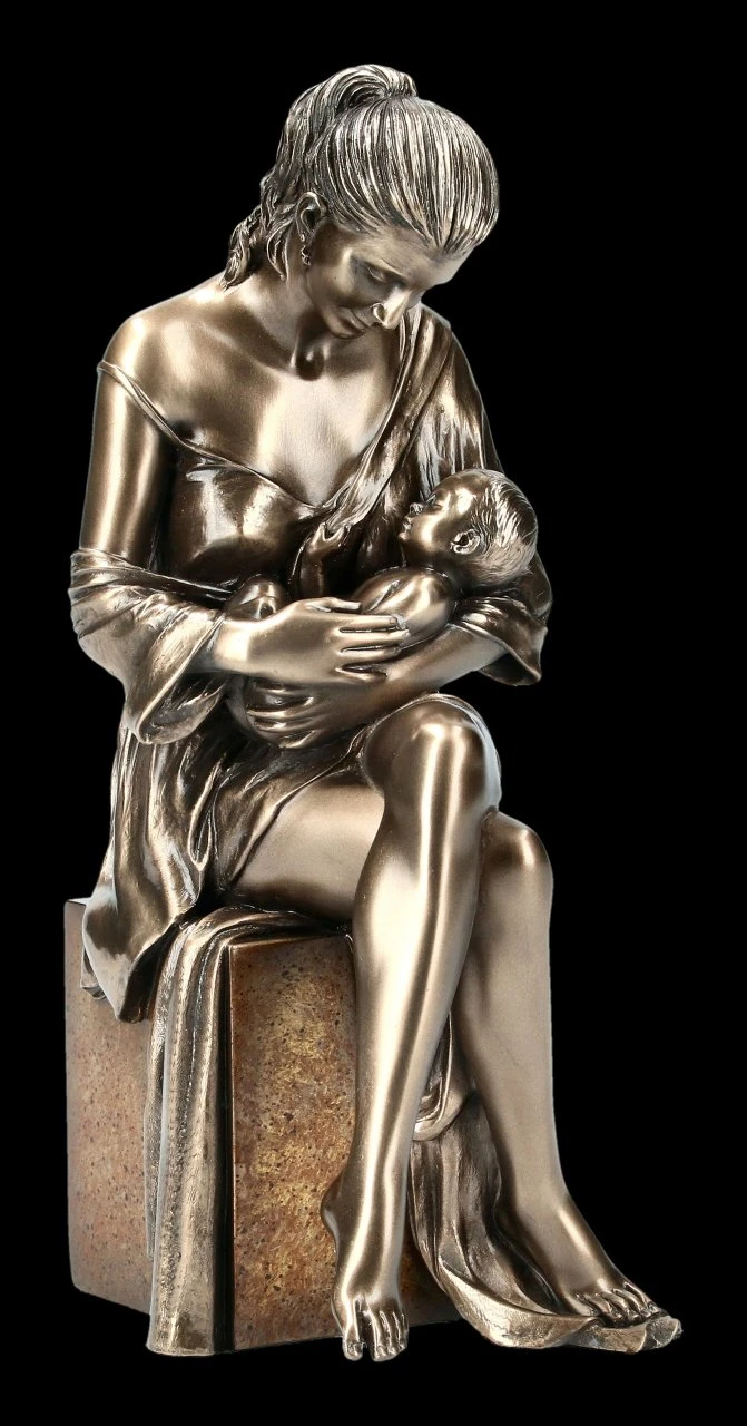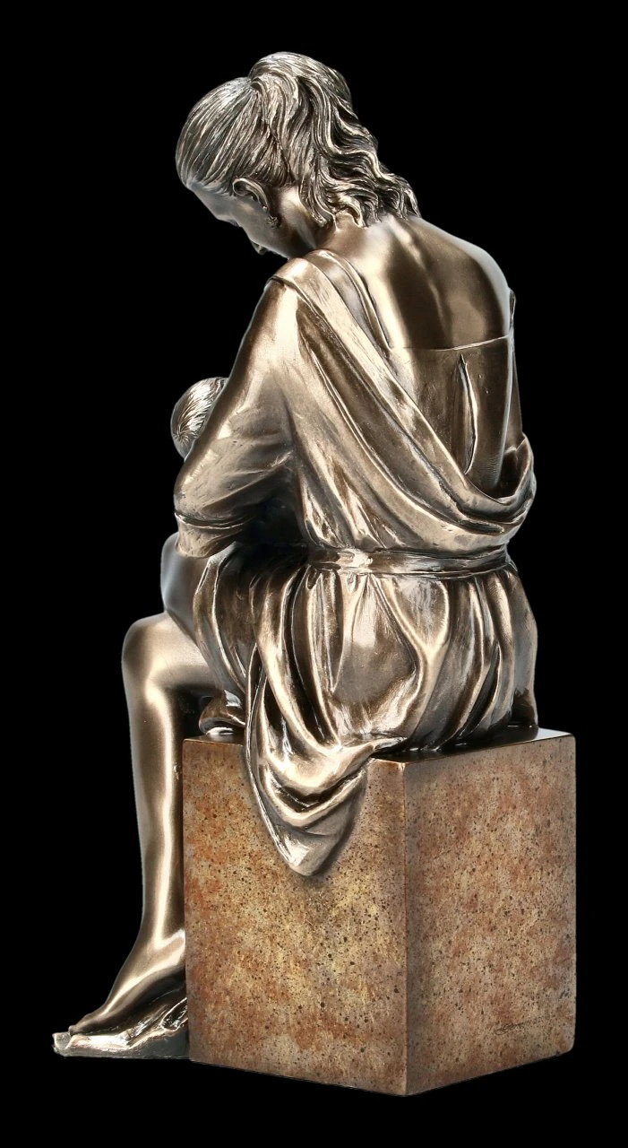 Mit zärtlichem Blick betrachtet die Mutter das Baby, das sie liebevoll geborgen im Arm hält. Barfuß sitzt die schöne Frauen Figur mit Baby auf einem Monolith. Ästhetisch schön umspielt das lange offene Kleid die Beine und den Monolith. Mit einer Höhe von 23,5 cm, einer Breite von 9 cm und der Tiefe von 12 cm ist diese schöne Mutter Figur aus sehr detailreich und edel bronziertem Kunststein (Polyresin) von Veronese ein sofortiger Blickfang und ein wunderbares Geschenk für einen lieben Menschen.