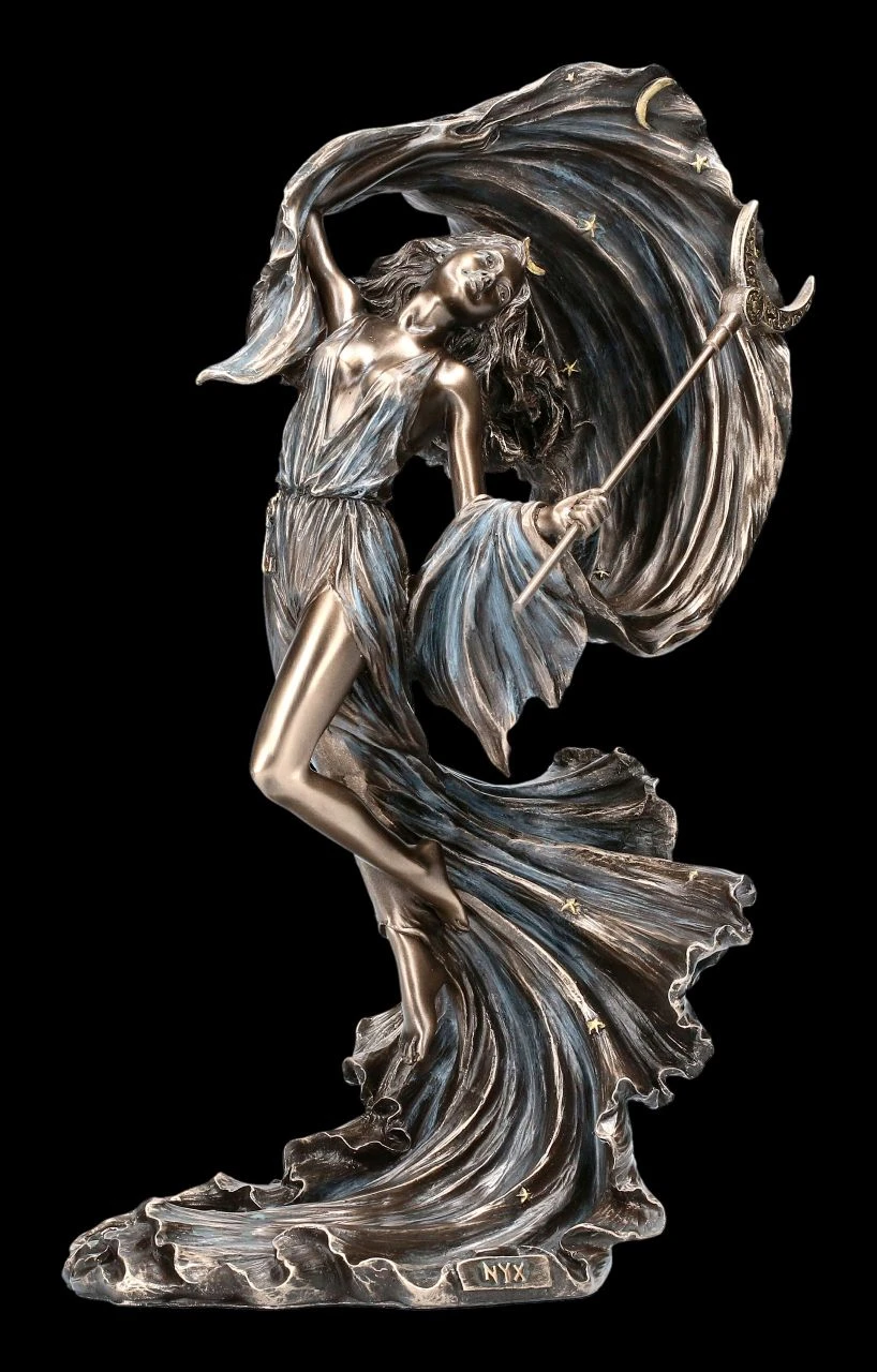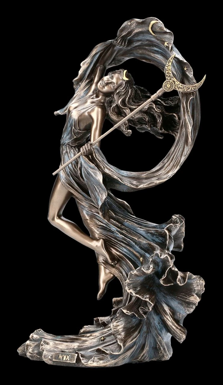 Nyx, die Göttin der Nacht, gehört in der griechischen Mythologie zu den Urgöttern und wurde als Tochter des Chaos geboren. Ihre Geschwister sind Gaia, Erebos, Eros und Tartaros. Sie war von unglaublicher Schönheit, was auch bei dieser wunderschönen Nyx Figur aus der Studio Collection von Veronese zu sehen ist. Die außerordentlich attraktive Figur der Göttin Nyx trägt eine Mondsichel als Schmuck auf ihrem Haar und einen Stab mit Mond und Mondsichel in ihrer Hand. In fließenden Wellen umschmeichelt sie ihr Kleid, das, wie auch der Schleier, der sie umweht, mit Sternen besetzt ist. Die edel bronzierte Figur der Göttin Nyx ist sehr aufwändig aus Kunststein (Polyresin) gefertigt und zart coloriert. Mit der Höhe von 28 cm, der Breite von 18 cm und der Tiefe von 12 cm wird die wunderschöne Göttin der Nacht mit Sicherheit überall sofort entdeckt und bewundert werden.