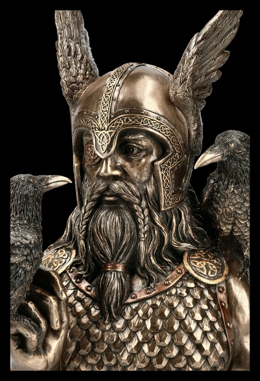 Begleitet von den Raben Hugin und Munin – der Erinnerung und dem Gedanken – zeigt sich hier Odin, der Allvater. Ernst blickt er auf den Raben, der auf seiner Hand Platz genommen hat und lauscht aufmerksam den Ratschlägen. Die bis zu dem geflügelten Helm umwerfend detailreiche und edel bronzierte und colorierte Kunststein (Polyresin) Büste des nordischen Gottes stammt aus der Studio Collection von Veronese. Sie sollte bei keinem Wikinger fehlen.