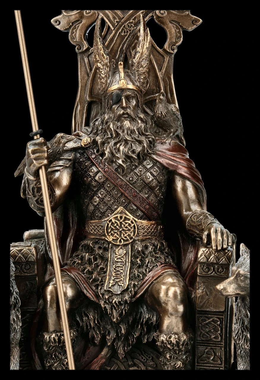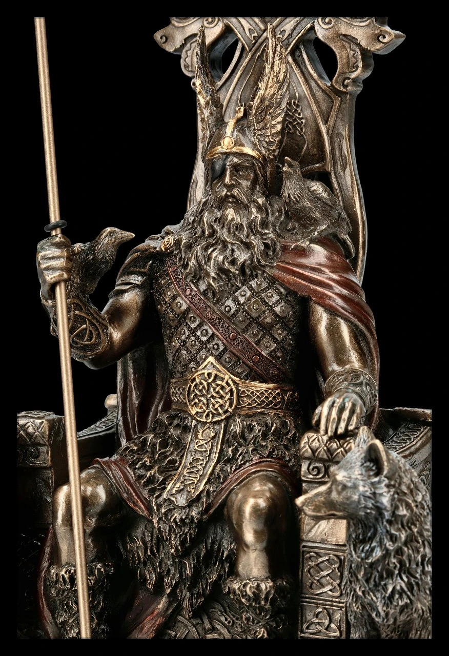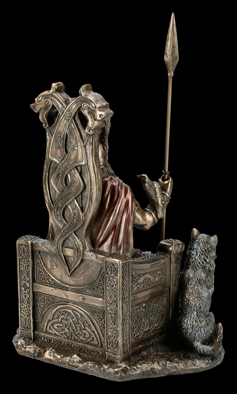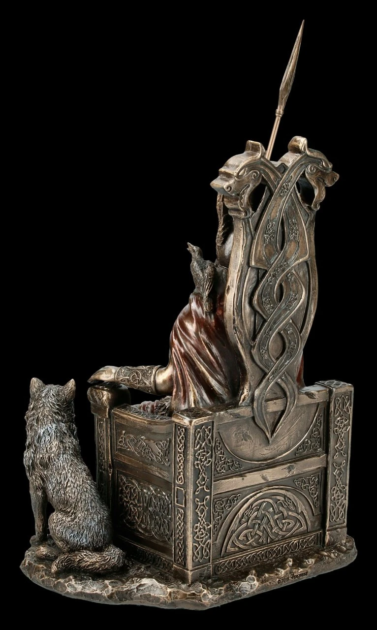 Die bronzierte und colorierte Odin Statuette aus der Studio Collection von Veronese ist sehr sorgfältig aus Kunststein (Polyresin) gefertigt und wunderbar anzusehen. Jedes kleine Detail der sitzenden Odin Figur ist toll zu erkennen und farblich akzentuiert. Odins Wölfe sitzen links und rechts neben ihm, eine der Raben – Hugin oder Munin – sitzt auf seiner Schulter. Passend zu Odin gibt es auch seine Frau Frigga auf Thron.
