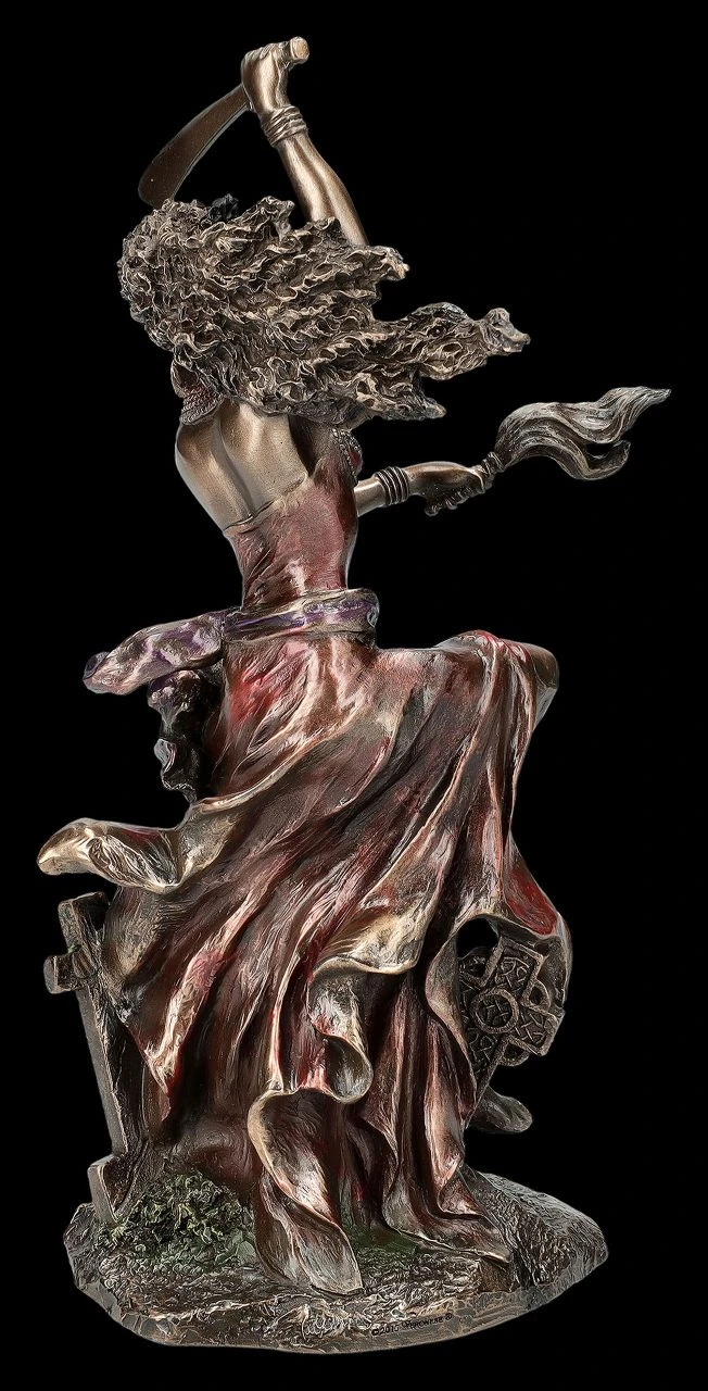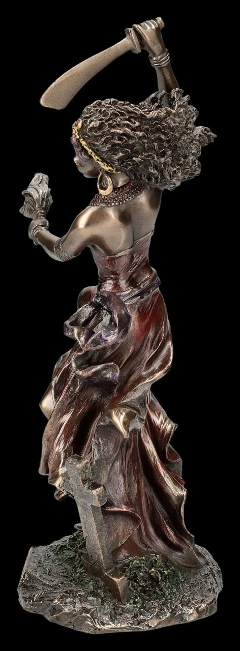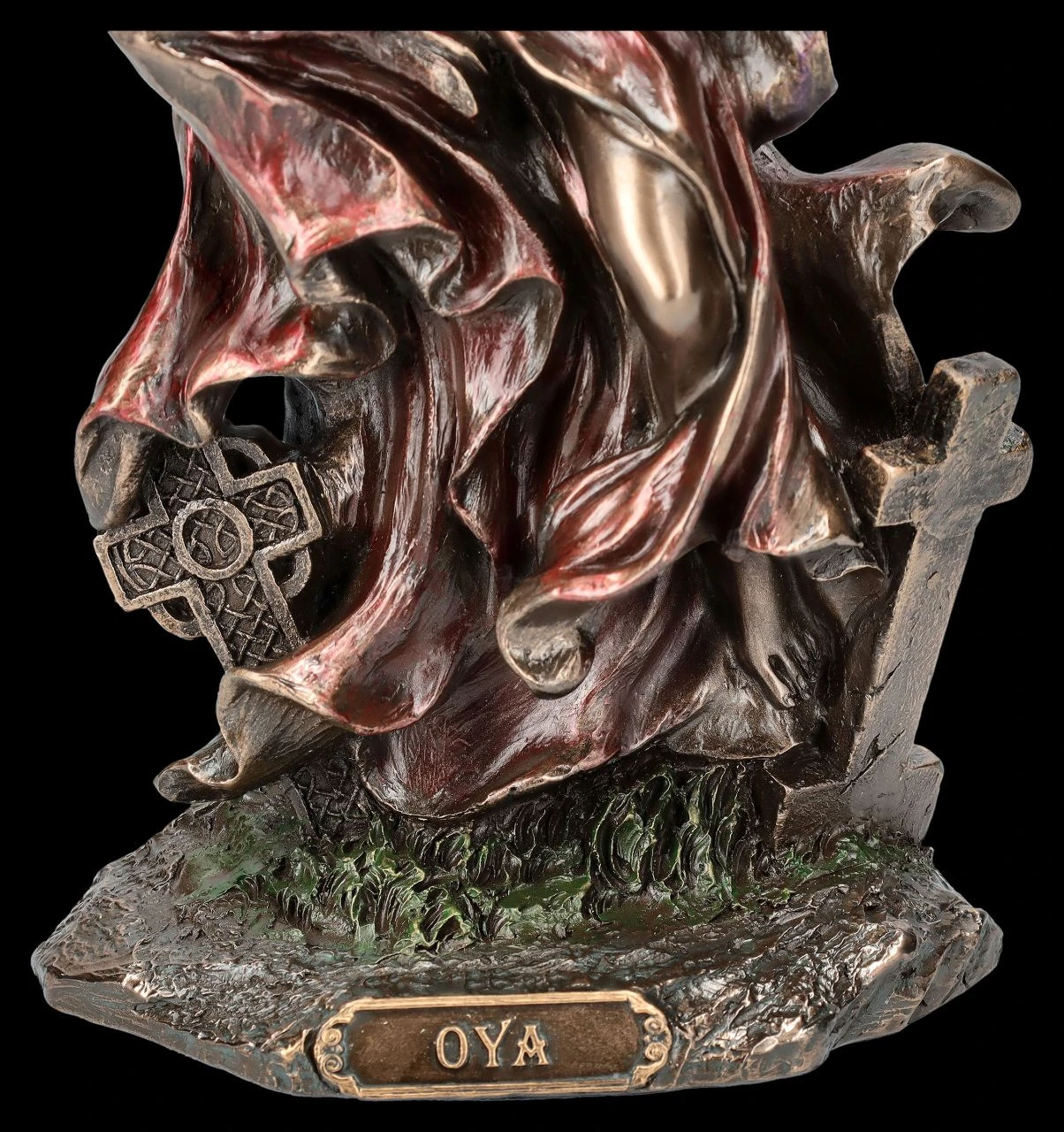 Wild tanzt Oya, die Yoruba Göttin des Windes, auf einem Friedhof zwischen den Kreuzen, denn Oya gilt als Göttin der Transformation, des Wandels und des Übergangs und wacht am Tor des Friedhofes, den sie einst von der Göttin Yemaya übernommen hat. Beim Volk der Yoruba gilt Oya vor allem als allumfassende Elementargöttin und als Urmutter des Chaos, aber auch als starke und unabhängige weibliche Kraft im Universum. Sie ist aber auch die Königin der Marktplätze und wird auch als Göttin des Tanzes und wehrhafte starke Kriegerin verehrt. Die wunderschöne, edel bronzierte und sehr fein colorierte Figur von Oya, der Yoruba Göttin des Windes, stammt aus der Studio Collection von Veronese. Die 24 cm hohe, 13 cm breite und 9 cm tiefe Figur der durch den Sturm tanzenden Göttin ist detailreich aus hochwertigem Kunststein (Polyresin) gefertigt. Sie ist ein wahrlich magisches und zauberhaftes Geschenk für starke Frauen, aber natürlich auch für Männer, die die Kraft der Göttin bewundern.