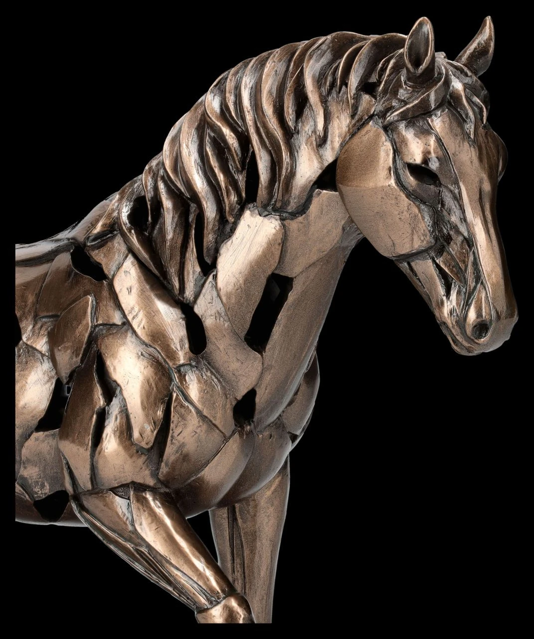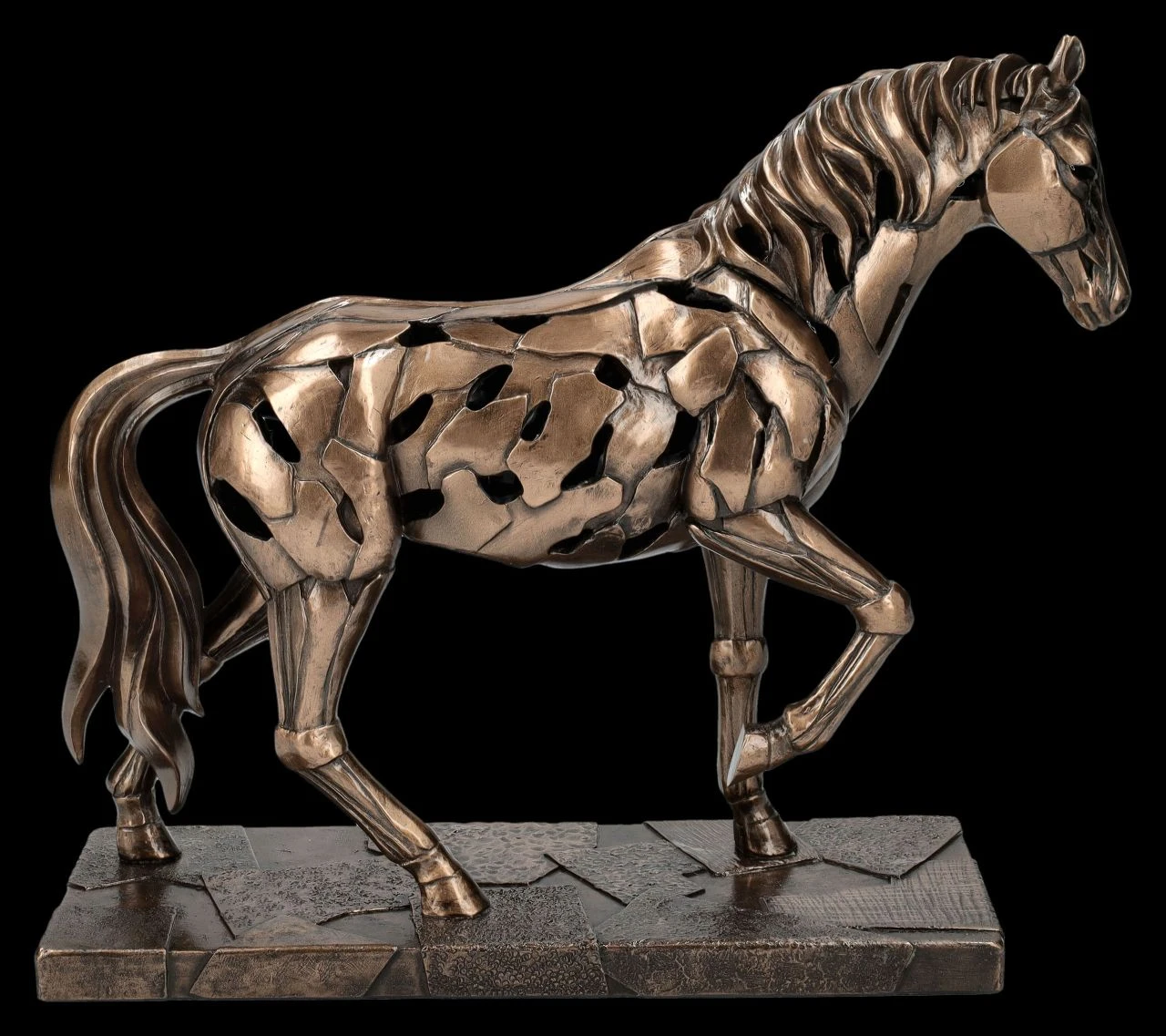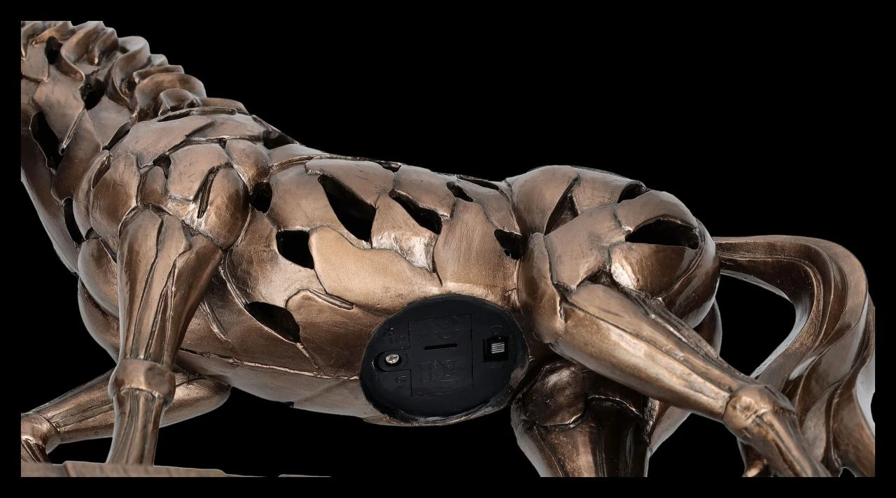 Aus der Studio Collection von Veronese stammt diese kunstvoll abstrakte und dadurch sehr moderne Darstellung eines Pferdes beim Passgang. Die Silhouette des edel bronzierten Pferdes aus hochwertigem Kunststein (Polyresin) wird so ausgesprochen raffiniert inszeniert und ist selbst in der Dunkelheit ein faszinierender Blickfang. Denn durch die LED-Beleuchtung, bei der der Körper des Pferdes warm-weiß aufleuchtet, entsteht ein magischer Eindruck, der den künstlerischen Charakter der Pferde-Skulptur unterstreicht. Die 21 cm hohe, 26 cm breite und 8,5 cm tiefe Pferde-Figur ist ein moderner und stilvoller Blickfang in jedem Interieur. Für die batteriebetriebene LED-Beleuchtung werden 3 x LR44 Batterien benötigt, die nicht im Lieferumfang enthalten sind. Diese moderne Version einer Pferde-Skulptur ist – vielleicht gleich in Kombination mit der weiteren Pferde-Figur von Veronese aus unserem Shop – für jeden Pferdeliebhaber ein wunderbares und effektvolles Geschenk.