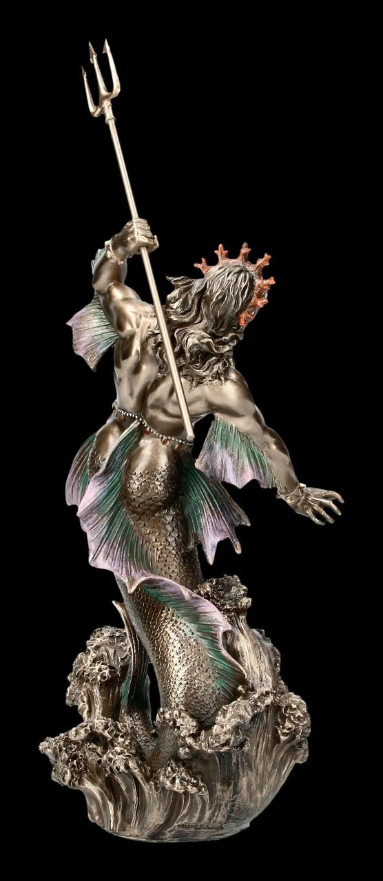 Einer der 12 olympischen Gottheiten der griechischen Mythologie ist Poseidon, Gott des Meeres und Bruder des Zeus. In der Römischen Mythologie trägt er den Name Neptun. Die Seefahrer sind seiner Gnade und seinem Zorn hilflos ausgeliefert. Diese wundervolle Poseidon Figur von Veronese aus Kunststein wurde liebevoll bronziert und coloriert. Fast hört man die Wellen rauschen.