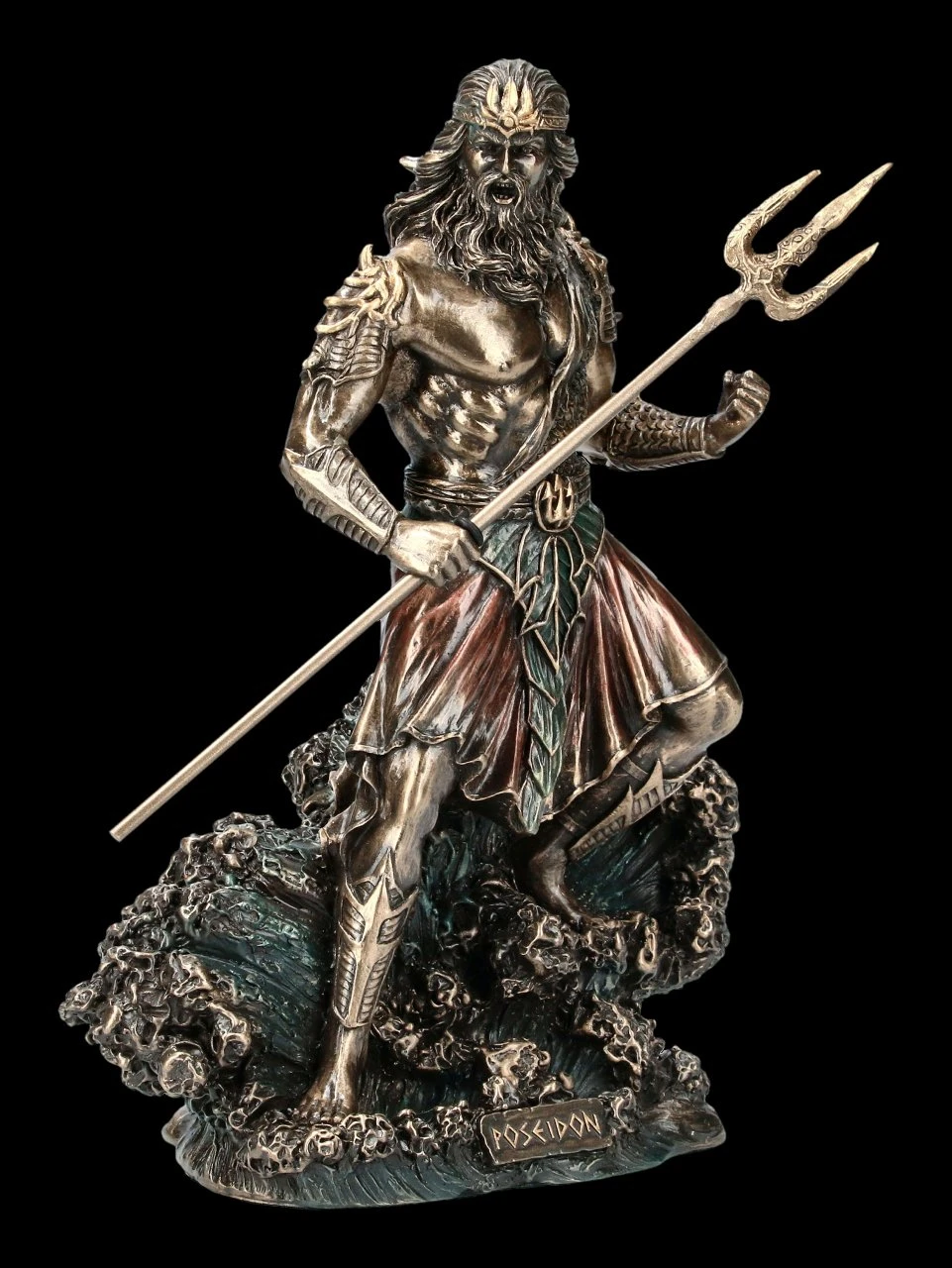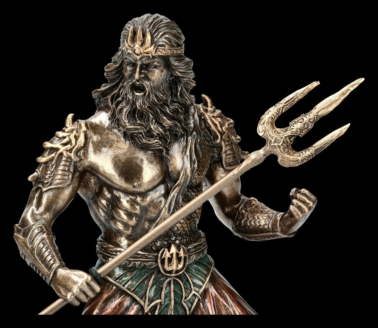 Wundervolle kriegerische Darstellung des Poseidon von Veronese aus der Serie The Triumphs of Humanity. Die bronzierte und colorierte Kunststein Figur wurde sehr detailreich gefertigt und besticht durch ihre Anmut.