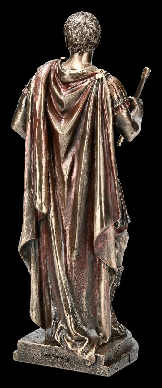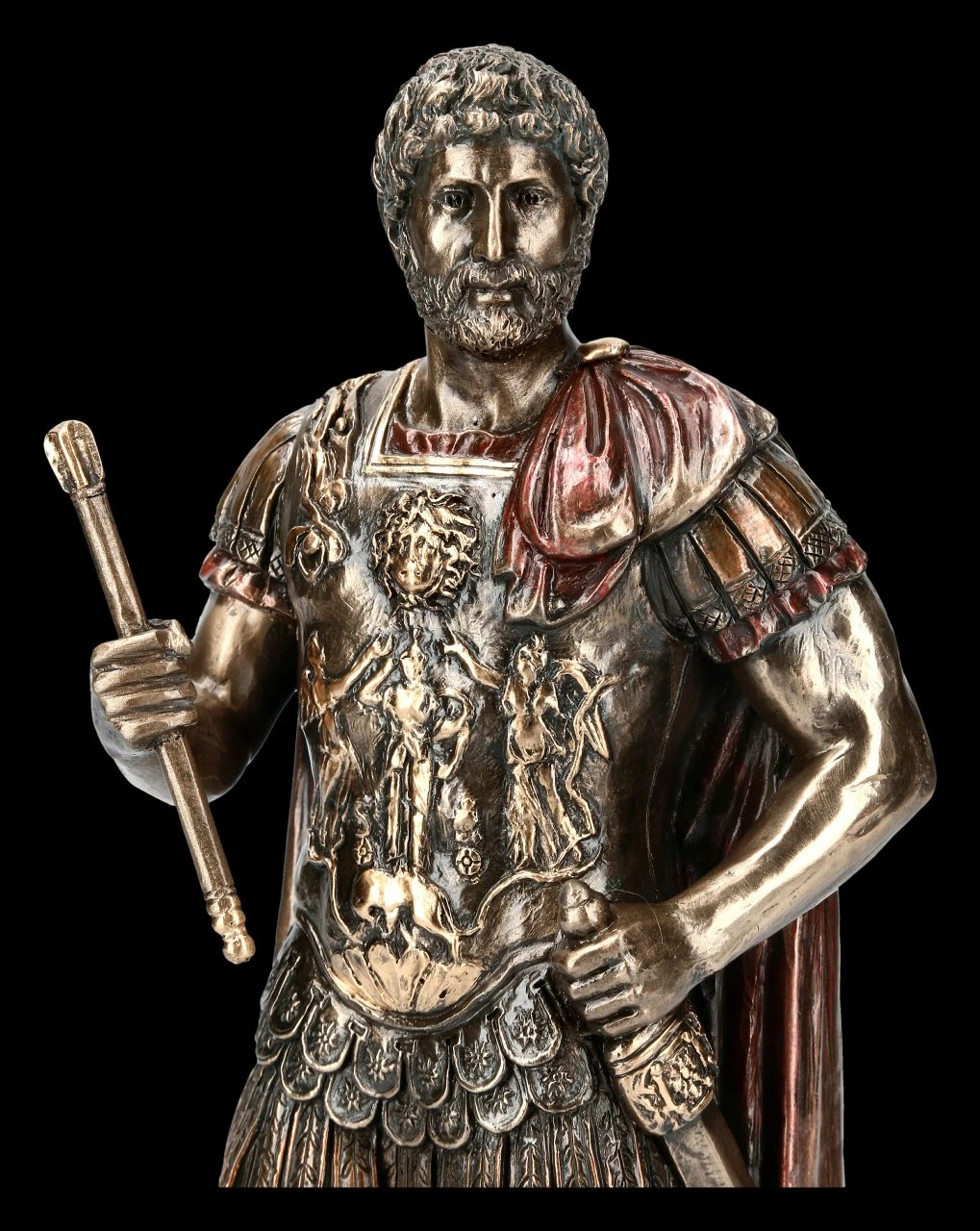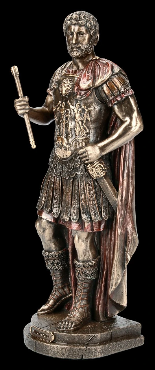 Publius Aelius Hadrianus – 14. Römischer Kaiser – war ein verhältnismäßig friedlicher Kaiser. Er führte nicht viele Kriege und förderte den Wohlstand und die Infrastruktur. Auch gab er dem Justitswesen einen wichtigen Impuls und gab eroberte Gebiete zurück – was jedoch sehr umstritten war. Die bronzierte und colorierte Kunststein Figur des Hadrian von Veronese aus der Studio Collection sollte in keiner Sammlung fehlen.