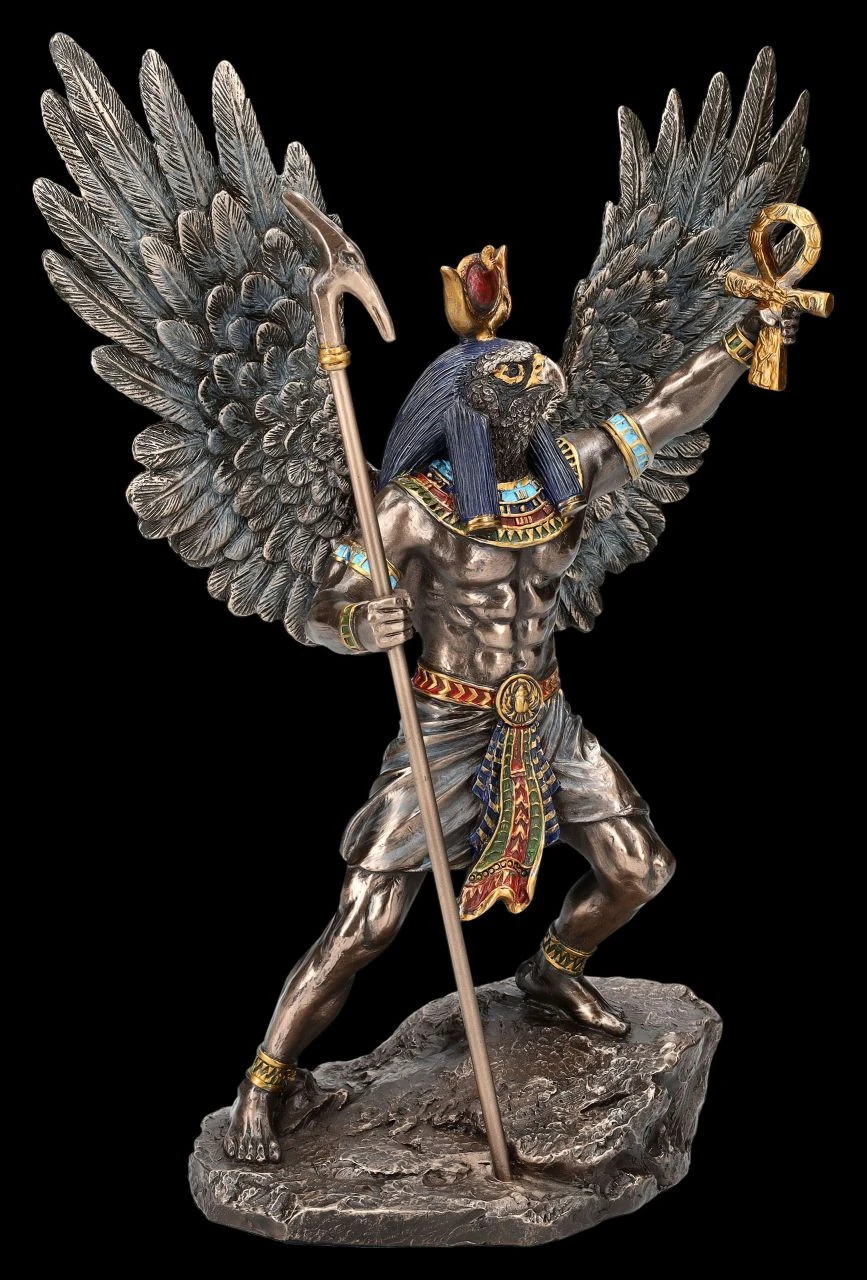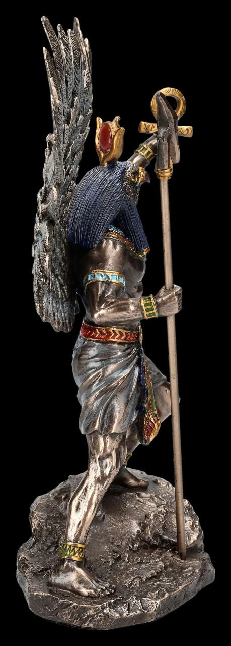 Der wichtigste und größte Gott des Alten Ägyptens war der Sonnengott Ra oder auch Re. Er verkörperte die Sonne, die in der altägyptischen Mythologie von Beginn an ein Gott war. Der Gott der Sonne wurde meist mit einem Falkenkopf dargestellt und auch Horus genannt. Diese kraftvolle und starke Figur des Sonnengottes Ra in der Gestalt eines jungen kräftigen Mannes mit der Sonnenscheibe auf dem Falkenkopf und großen Flügeln aus der Studio Collection von Veronese wurde außerordentlich detailreich und sorgfältig aus hochwertigem Kunststein (Polyresin) gefertigt. Die 26 cm hohe, 20 cm breite und 9,5 cm tiefe Skulptur trägt in der rechten Hand einen Stab mit Falkenkopf wie ein Zepter und in der anderen hoch erhoben den Anch-Schlüssel, der zeigt, dass der Sonnengott durch sein Wirken und seine Kraft über Leben und Tod bestimmt. Durch die edle Bronzierung bringt diese herrlich prächtige und wunderbar colorierte Figur altägyptische Akzente in jedes Ambiente. Die Figur des Sonnengottes Ra ist aber auch ein wunderbares Geschenk für alle, die sich für das Alte Ägypten interessieren.