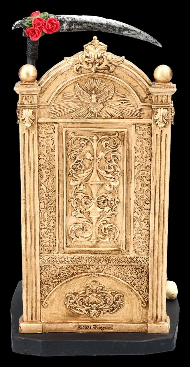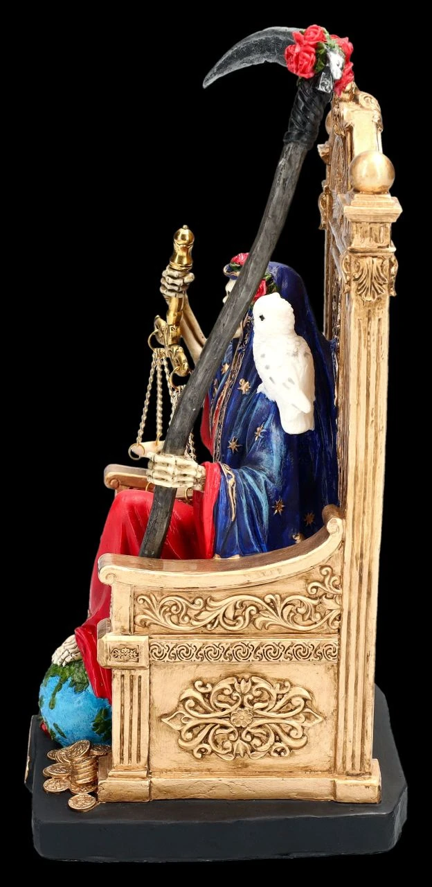 An den vielen Details dieser unglaublichen Reaper-Figur aus der Studio Collection von Veronese kann man sich gar nicht satt sehen. Das leuchtend rotes Gewand der auf einem goldenen Thron sitzenden Santa Muerte-Figur ist wie der blaue Marienumhang mit Sternen übersäht. In der rechten Hand hält Santa Muerte, in manchen Gegenden auch Santisima Muerte genannt, wie Justitia die Waage der Gerechtigkeit und in der linken die mit roten Rosen geschmückte Sense. Auf der linken Schulter sitzt eine Schneeeule als Zeichen der weisen Entscheidungen. Der linke Fuß von Santa Muerte ruht auf der blauen Erdkugel, die zwischen roten Rosen und zahlreichen Münzen als Opfergaben liegt. Auf der anderen Seite sind einige Schädel zu sehen. Die 21,5 cm hohe, 11,5 cm breite und 10,5 cm tiefe Reaper-Figur aus sorgsam handbemaltem Kunststein (Polyresin) wirkt in keiner Weise beängstigend. Aber schließlich wird Santa Muerte, als Fest der Toten auch fröhlich gefeiert. Die Waage ist zum Schrauben. Eine wunderbare Darstellung von Santa Muerte, die durch die fröhlichen Farben nicht nur zum Fest der Toten Freude bereitet.