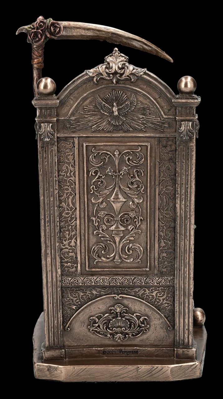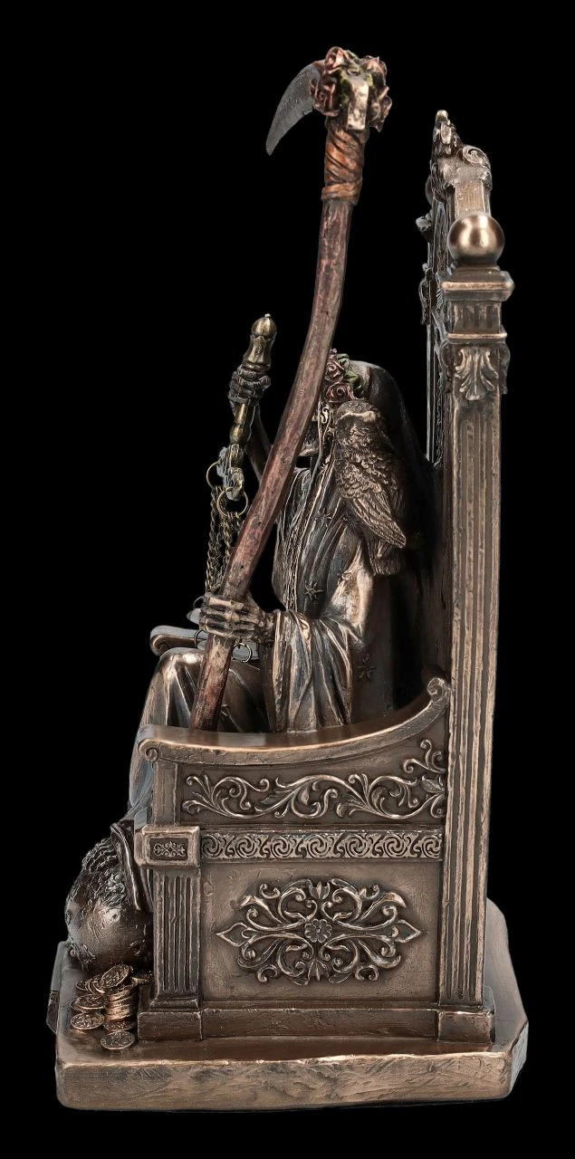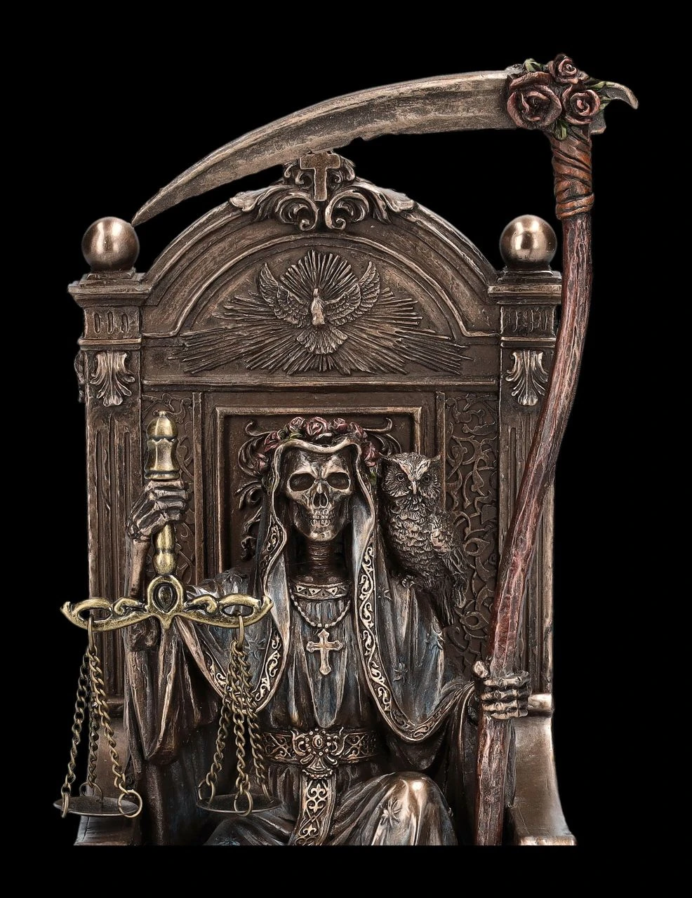 Die Waage des Lebens in der rechten Hand und die Sense in der linken Hand sitzt der Reaper als Santa Muerte mit Rosen umkränzt auf seinem prächtig verzierten Thron. Sein Fuß ruht auf der Erde und zu seinen Füßen liegen auf einer Seite mehrere Schädel und auf der anderen Seite zahlreiche Münzen. Sind das Opfergaben, oder wollte jemand den vergeblichen Versuch machen, den Reaper zu bestechen? Auf der Schulter des Reapers sitzt sein weiser Ratgeber, eine Eule, die dem Betrachter interessiert und abwägend entgegensieht. Diese faszinierende, 22 cm hohe, 11,5 cm breite und 10,5 cm tiefe Reaper Figur stammt aus der Studio Collection von Veronese. Die edel bronzierte und zurückhaltend colorierte Reaper Figur wurde aufwändig aus Kunststein (Polyresin) gefertigt. Die Waage ist zum Schrauben. Santa Muerte auf dem Thron mit Sense ist eine ungewöhnliche und beeindruckende Dekoratilon und damit auch ein wahrlich fantasievolles Geschenk.