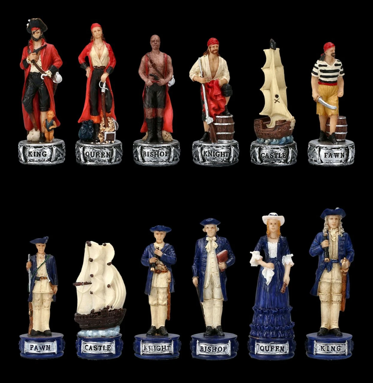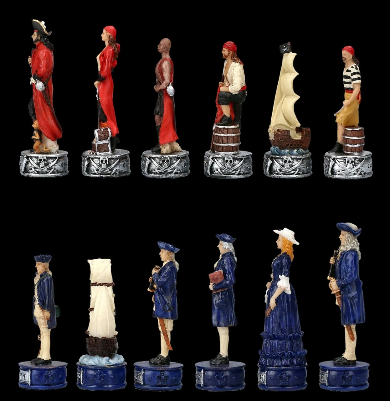 Schiffe nehmen bei diesen ungewöhnlichen Schachspielfiguren mit den Piraten die Rolle des Turms ein und um welche Spielfigur es sich sonst handelt, ist jeweils auf dem Sockel zu lesen… Piraten gegen den König und seine Leute – wer gewinnt? Bei einem Schachspiel mit diesen fantastischen Figuren können die Spieler mit ihrem Können entscheiden, wie der Kampf ausgehen wird. Aus dem Hause Veronese kommt dieses detailreich aus Kunststein (Polyresin) gefertigte und wunderbar handbemalte Schachfiguren Set. Es beinhaltet 32 fantastische Figuren, wobei zum Beispiel die Figur des Königs 8 cm hoch ist und die Bauernfiguren 6,5 cm. Die Figuren dieses Sets haben eine Stellfläche von 2,4 cm. Weitere wunderbare Schachfiguren – auch als prachtvolles Geschenk für Schachspieler – finden Sie in unserem Shop.