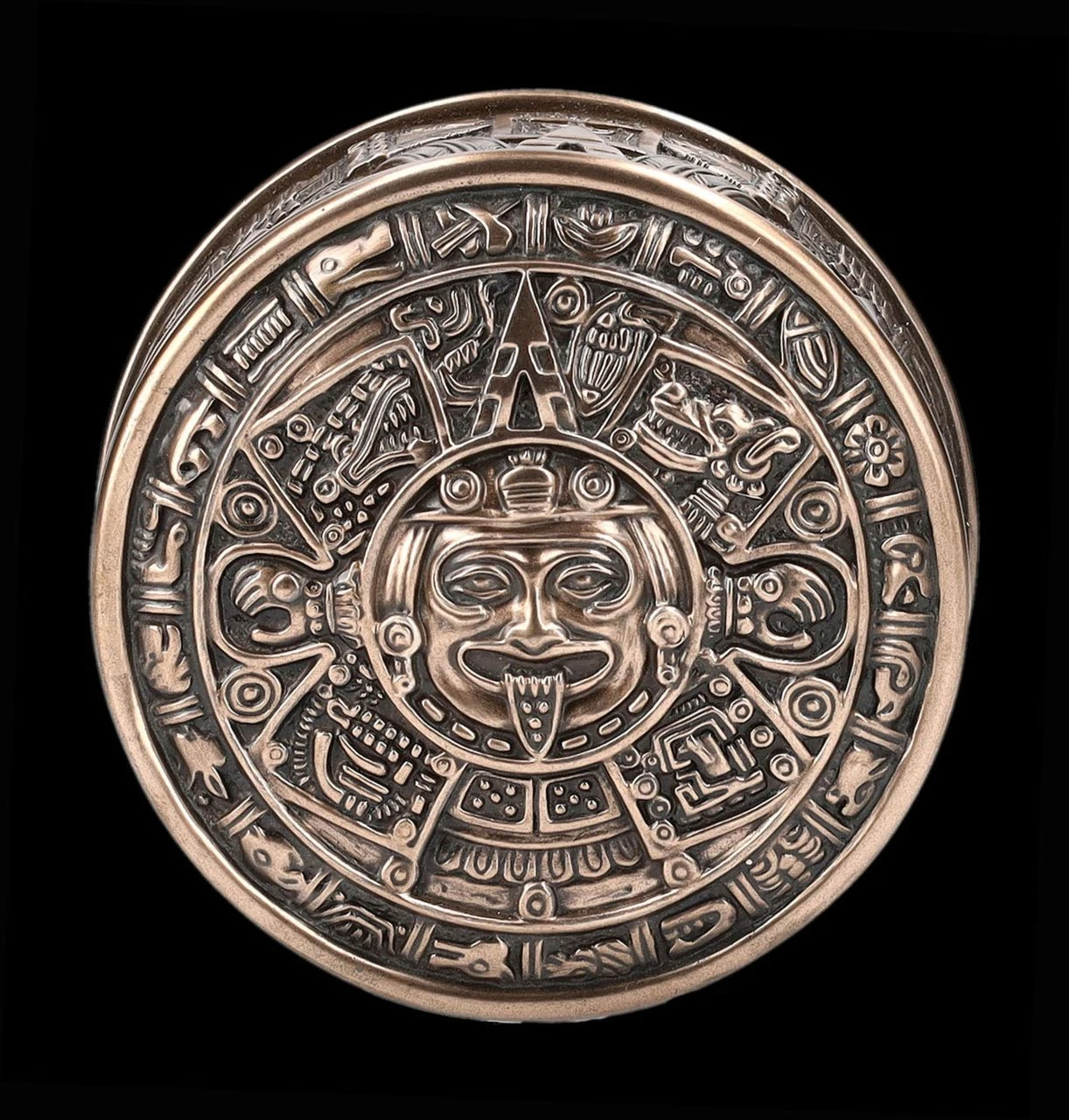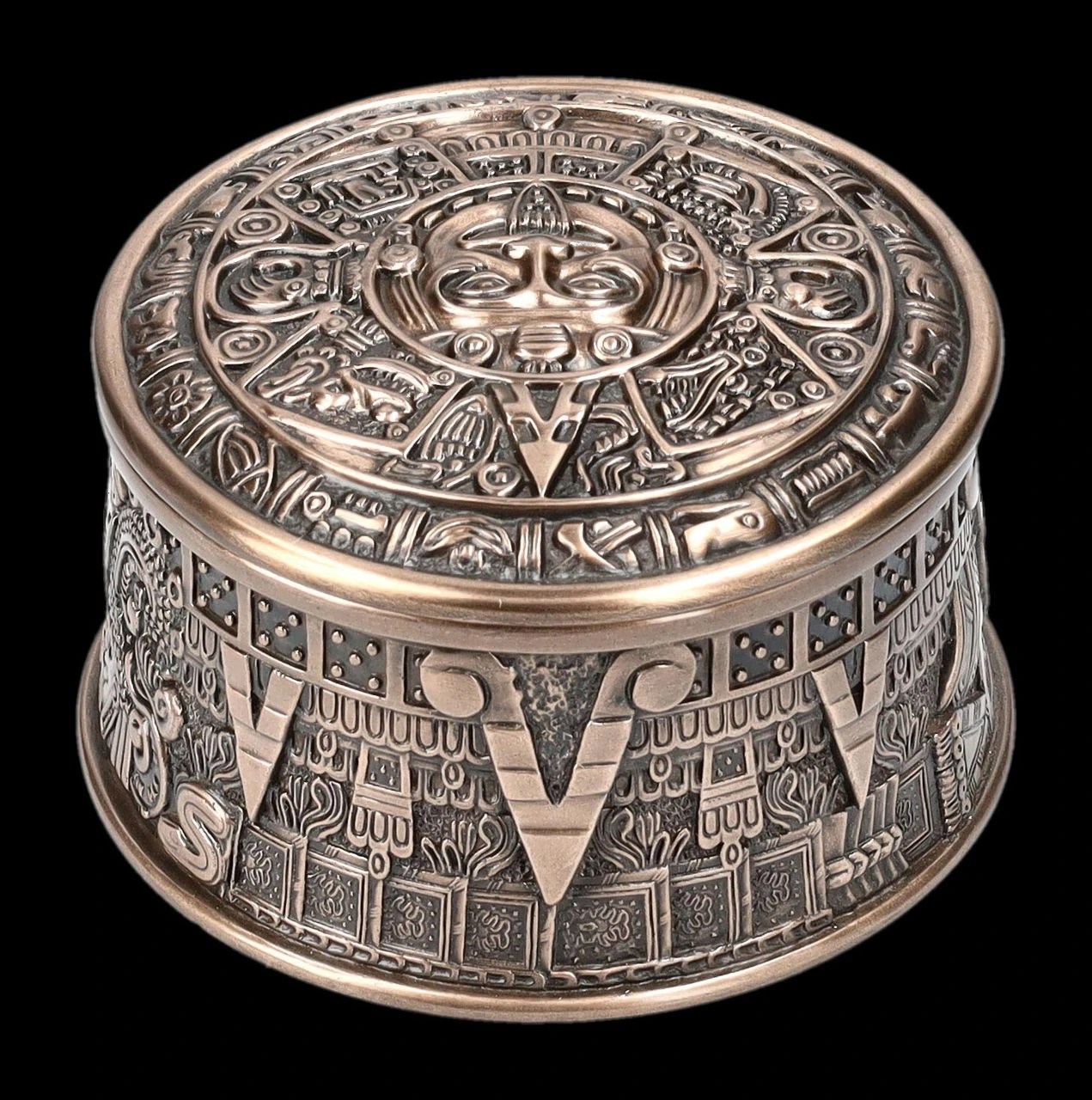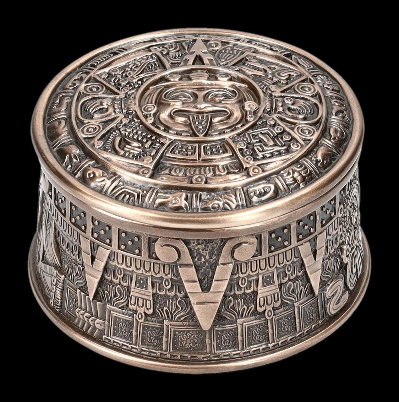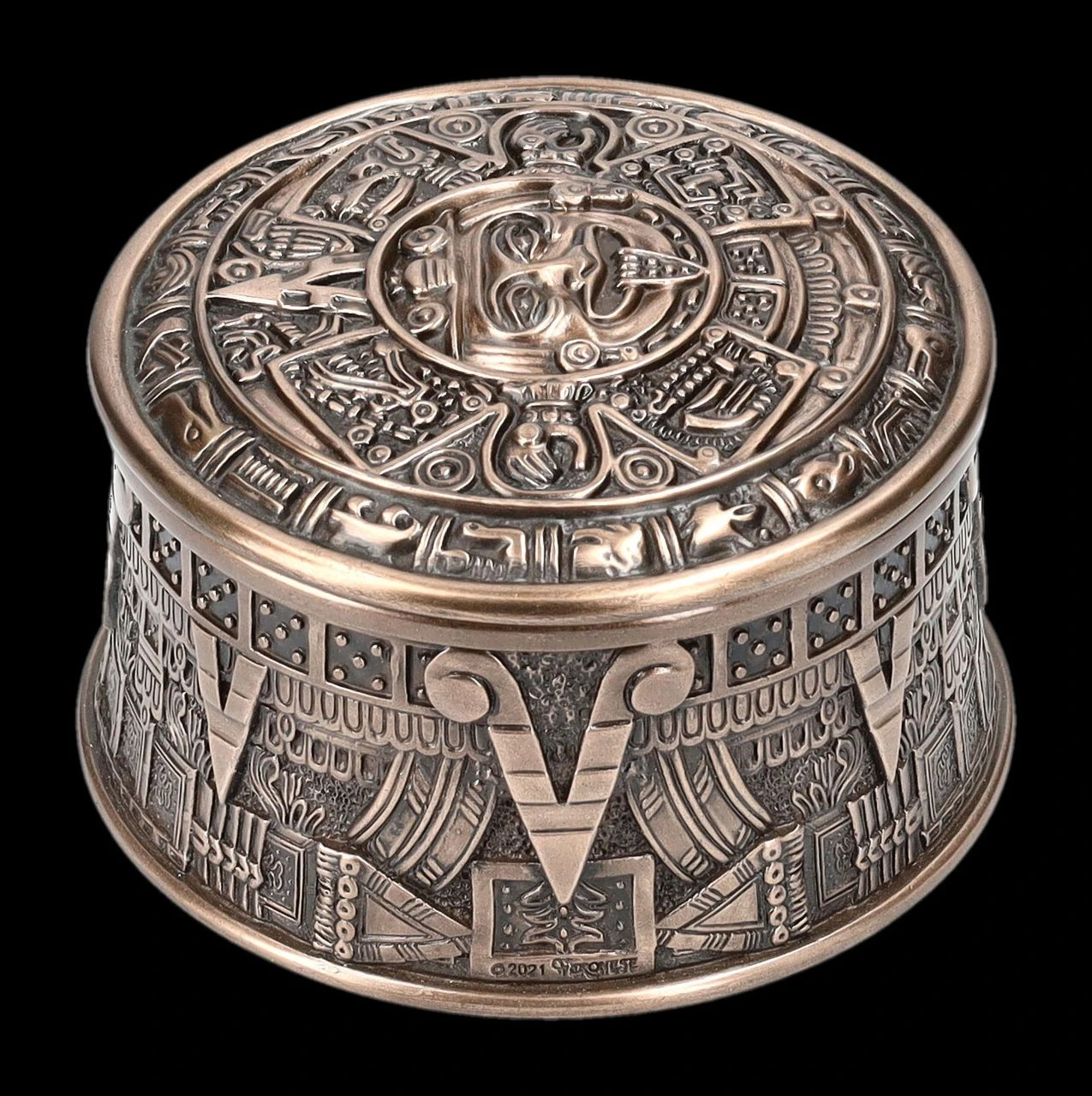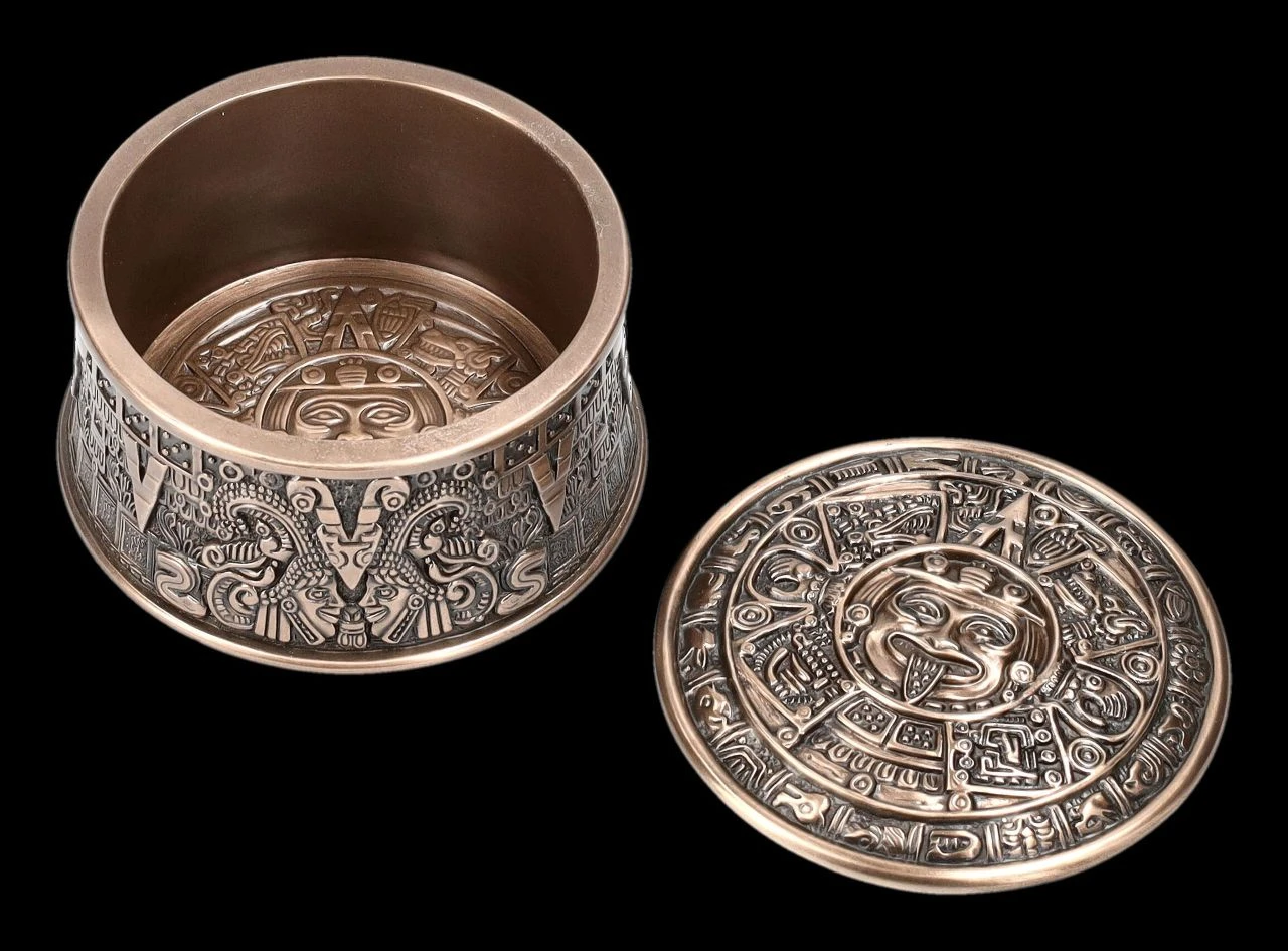 Ob kleine Kostbarkeiten oder auch Räucherwerk – in dieser 6 cm hohen Schatulle mit dem Durchmesser von 10 cm ist alles gut aufgehoben. Mit dem Azteken Sonnenkalender auf dem Deckel und den plastischen Verzierungen ist diese edel bronzierte Schatulle aus der Studio Collection von Veronese auch ein Blickfang und ein wunderbares Geschenk für jeden, der von der Kultur der Azteken fasziniert ist. Die fantastische Schatulle wurde aus hochwertigem Kunststein (Polyresin) gefertigt und ist mit den Innenmaßen von 4 cm Höhe und dem Durchmesser von 7,5 cm zum Beispiel auch als Verpackung für ein besonderes Geschenk hervorragend geeignet.