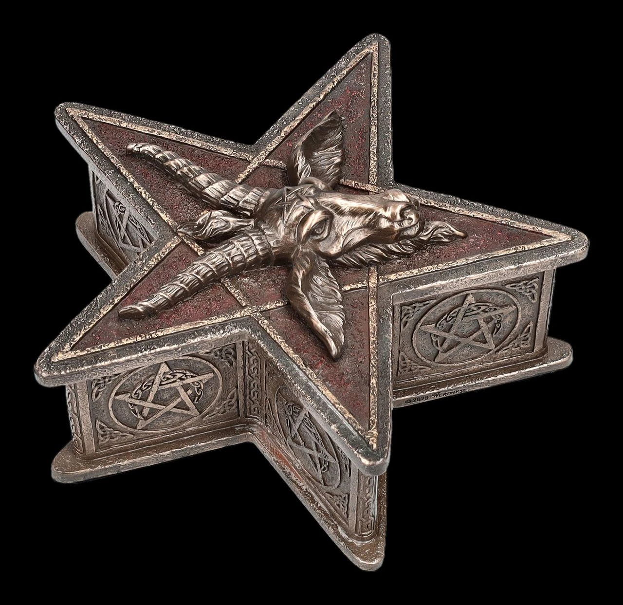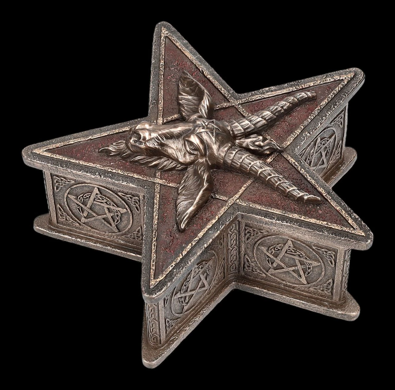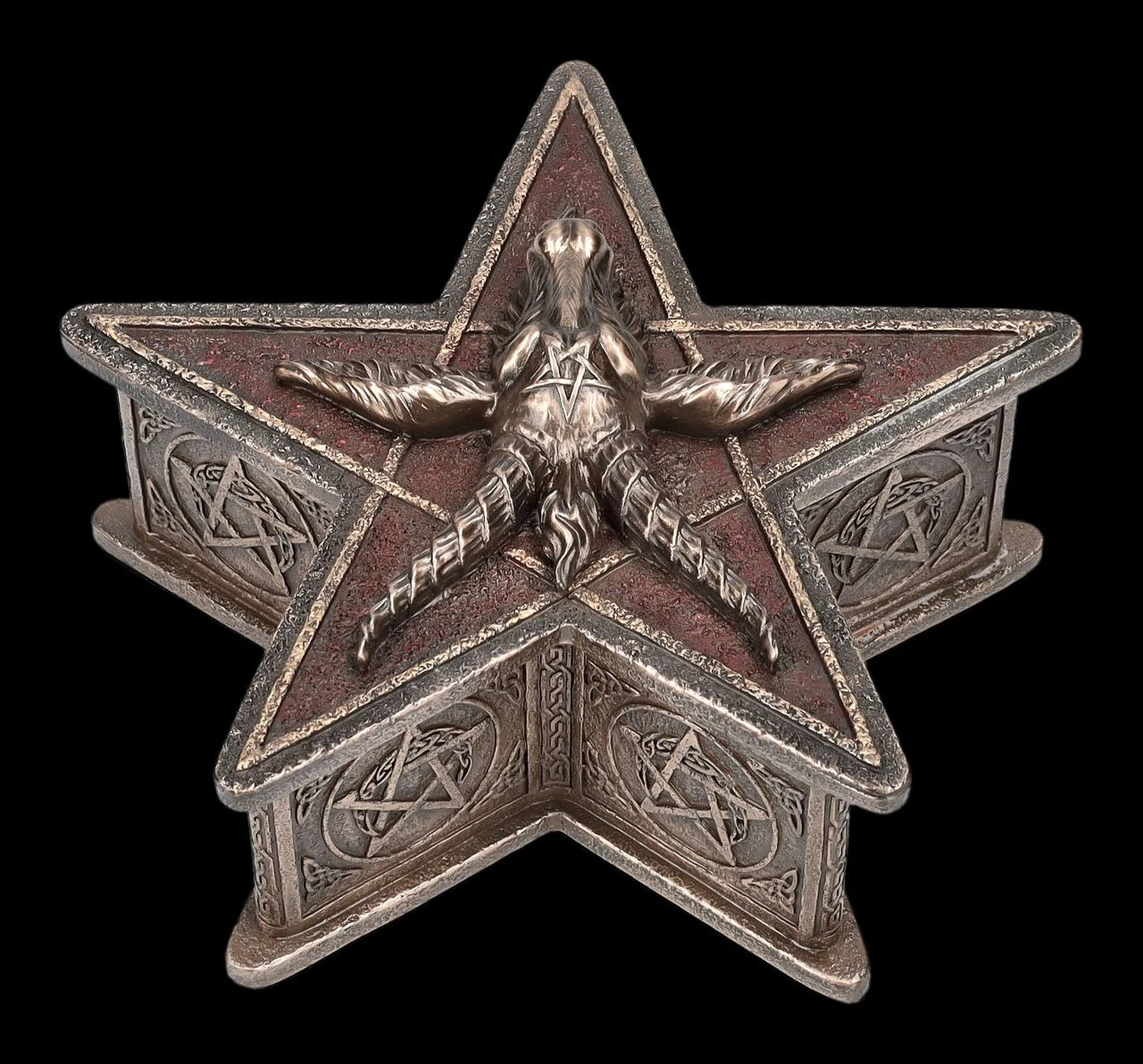 Was auch immer in dieser magischen Schatulle aufbewahrt wird, das Geheimnis bleibt sicher. Denn wer wird es so ohne weiteres wagen, das Pentagramm mit Bahphomets Kopf unhgefragt zu öffnen? Die 7 cm hohe, 15,5 cm breite und 15,5 cm tiefe Schatulle aus der Studio Collection von Veronese wurde sorgfältig aus handbemaltem Kunststein (Polyresin) gefertigt. Eine wahrlich magische Aufbewahrung. Innen hat die Schatulle mit Baphomets Kopf in dem Pentagramm mit den Maßen H: 4 cm / B: 7 cm/ T: 7 cm aber auch Platz für ein ganz besonderes Geschenk.