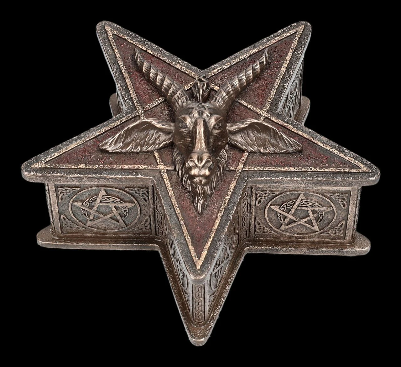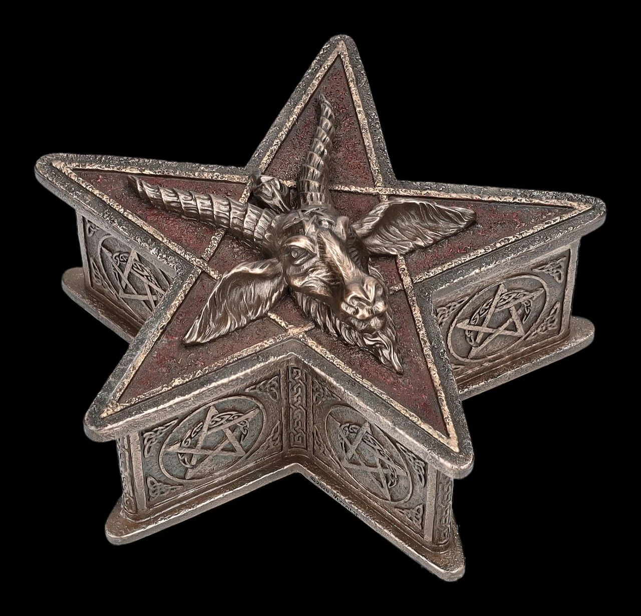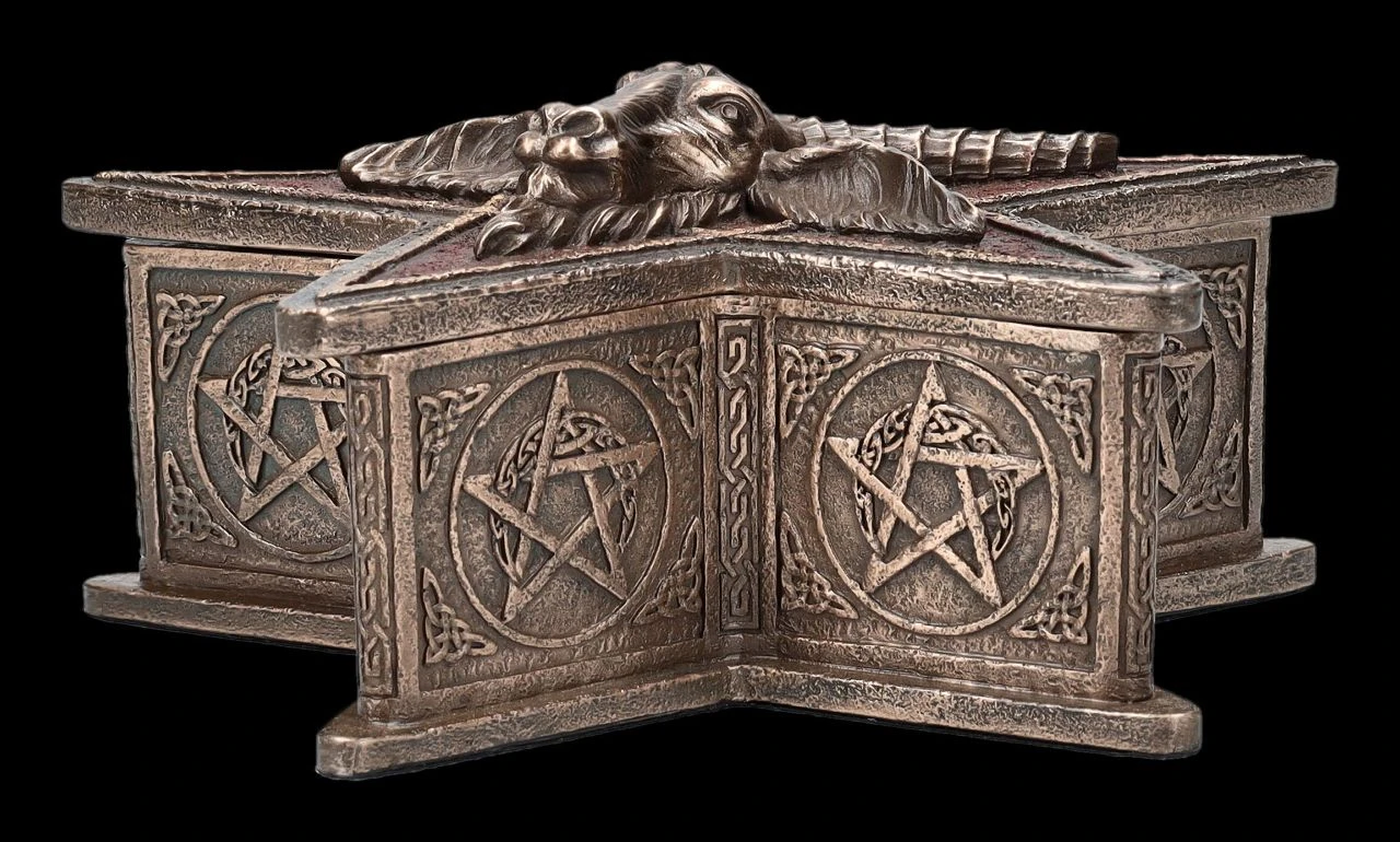 Was auch immer in dieser magischen Schatulle aufbewahrt wird, das Geheimnis bleibt sicher. Denn wer wird es so ohne weiteres wagen, das Pentagramm mit Bahphomets Kopf unhgefragt zu öffnen? Die 7 cm hohe, 15,5 cm breite und 15,5 cm tiefe Schatulle aus der Studio Collection von Veronese wurde sorgfältig aus handbemaltem Kunststein (Polyresin) gefertigt. Eine wahrlich magische Aufbewahrung. Innen hat die Schatulle mit Baphomets Kopf in dem Pentagramm mit den Maßen H: 4 cm / B: 7 cm/ T: 7 cm aber auch Platz für ein ganz besonderes Geschenk.