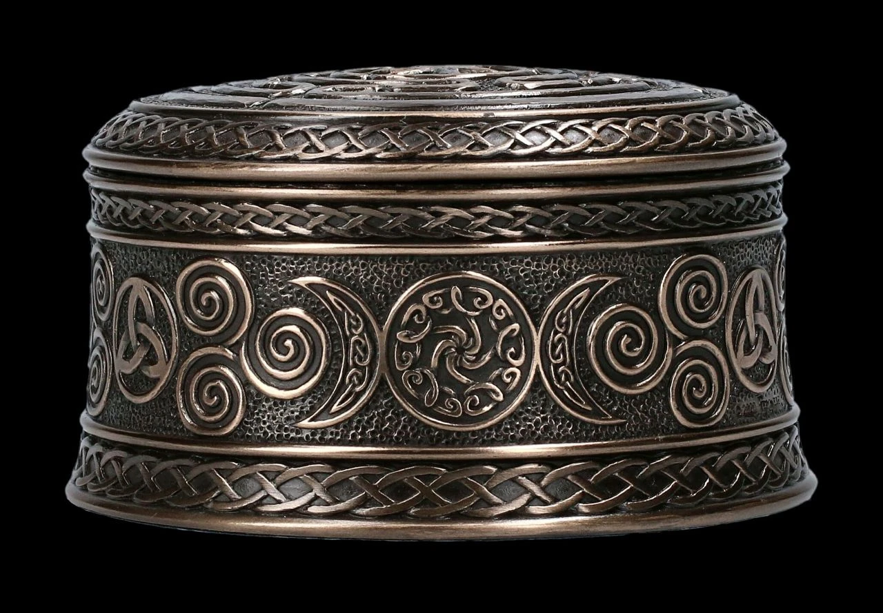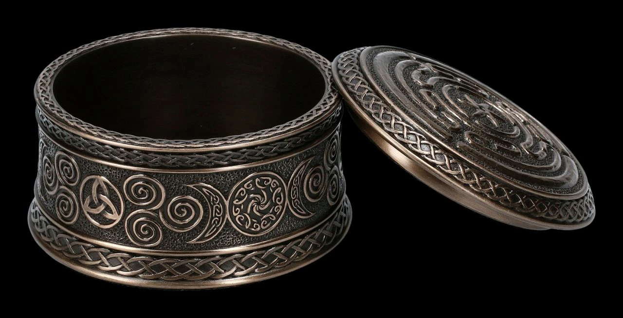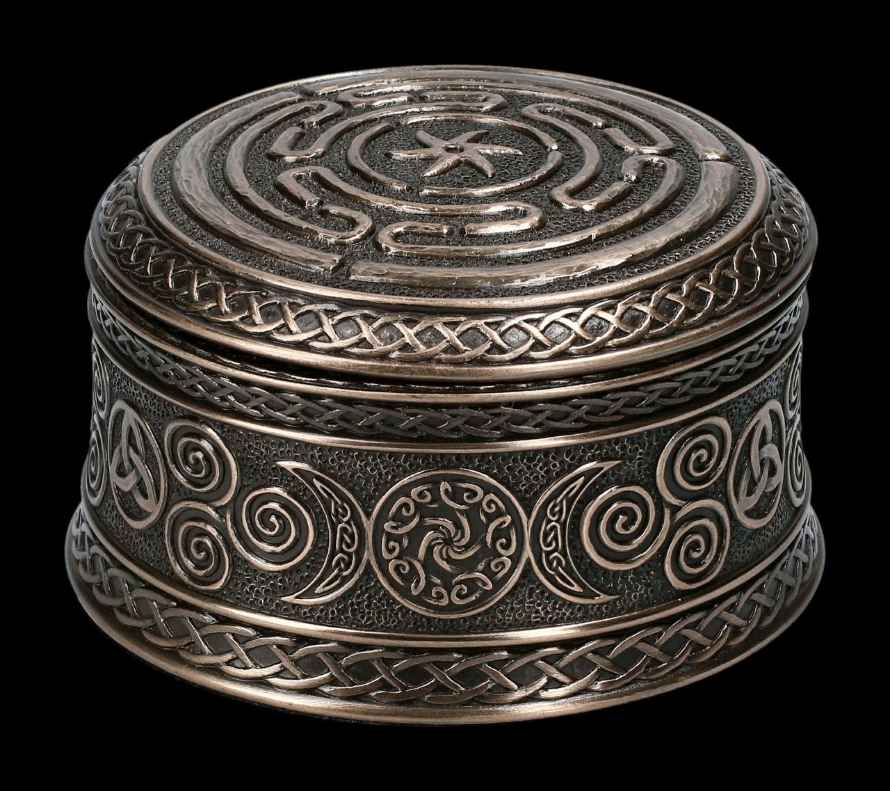 Das Rad der Göttin Hekate – auch die Dreifach Göttin genannt – dient bei dieser fantastischen Schatulle hervorragend als geheimnisvolle Aufbewahrung für magische Informationen. Wunderbar mit Dreifachmond und keltischen Bordüren verziert, bietet die detailreich aus edel bronziertem und fein coloriertem Kunststein (Polyresin) gefertigte Schatulle aus der Studio Collection von Veronese mit ihrer Höhe von 5 cm (Innen 4 cm) und dem Durchmesser von 10 cm (Innen 8 cm) den perfekten Platz für Dinge, die beschützt werden sollen. Sie ist aber auch eine wunderbar edle Verpackung für ein magisches Geschenk.